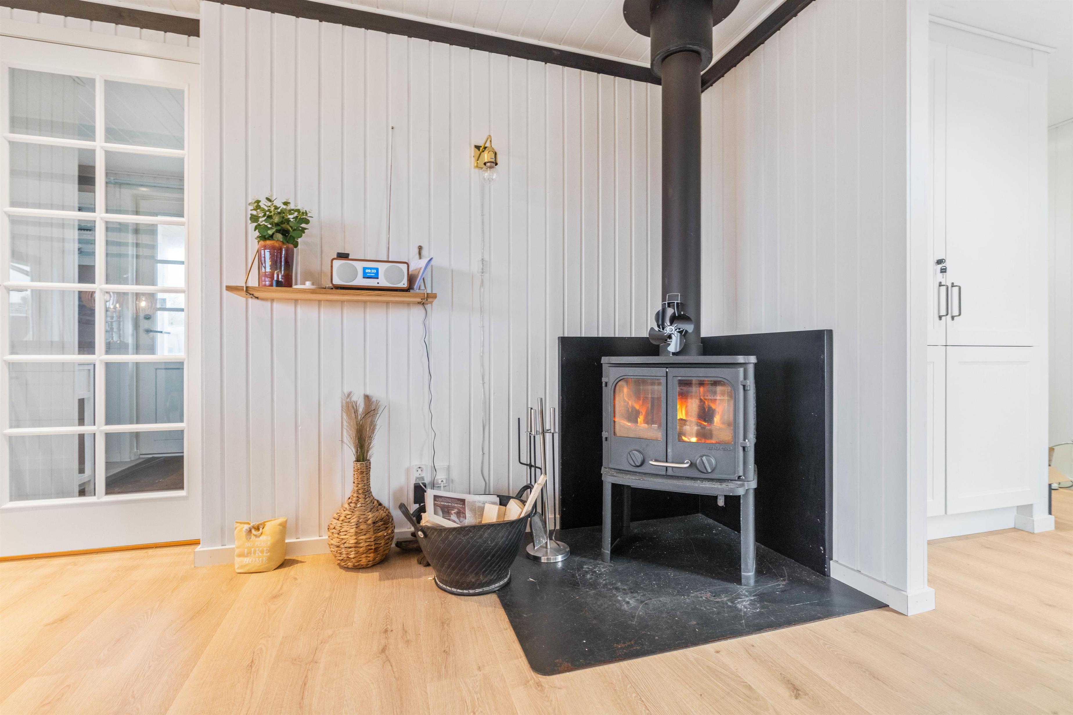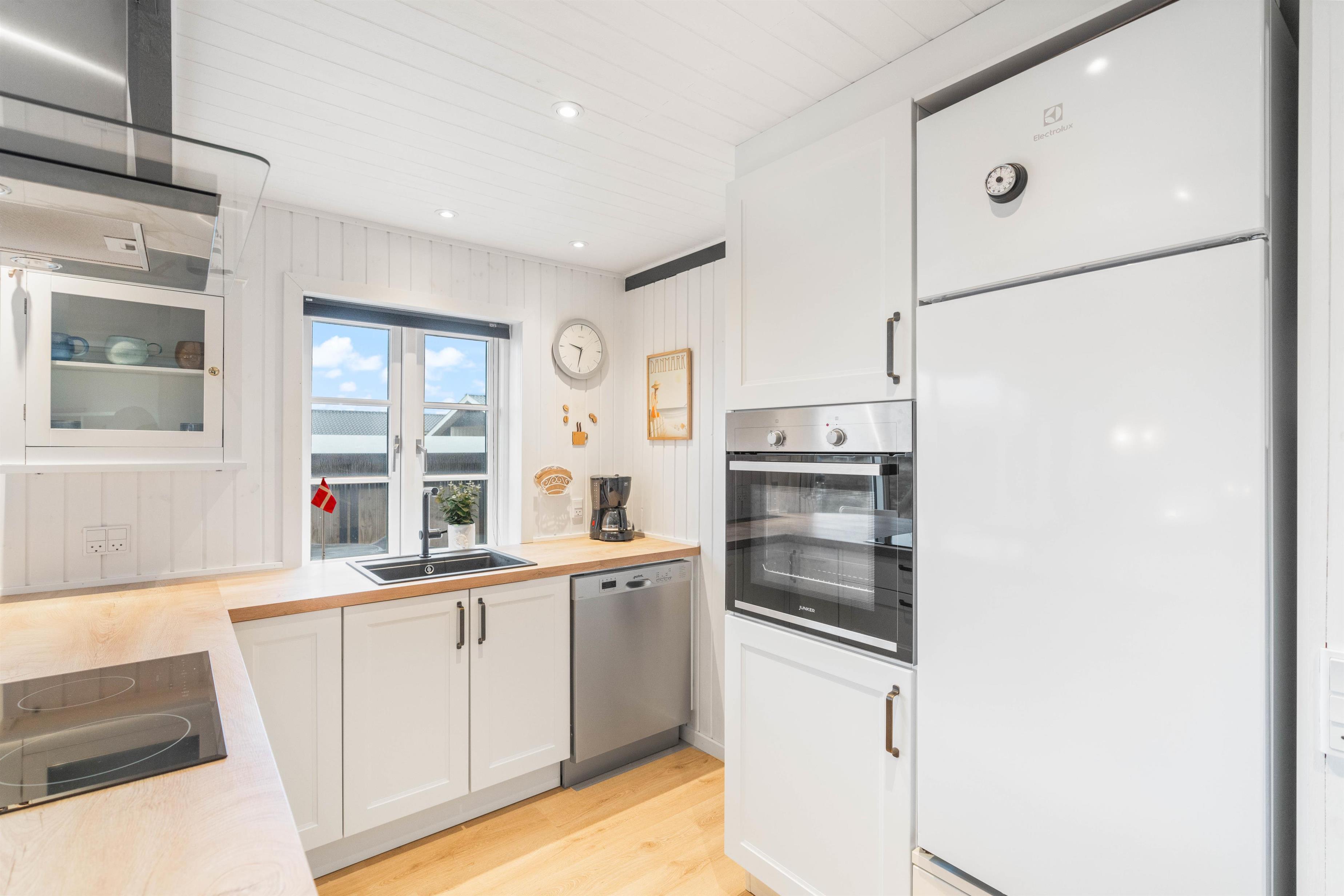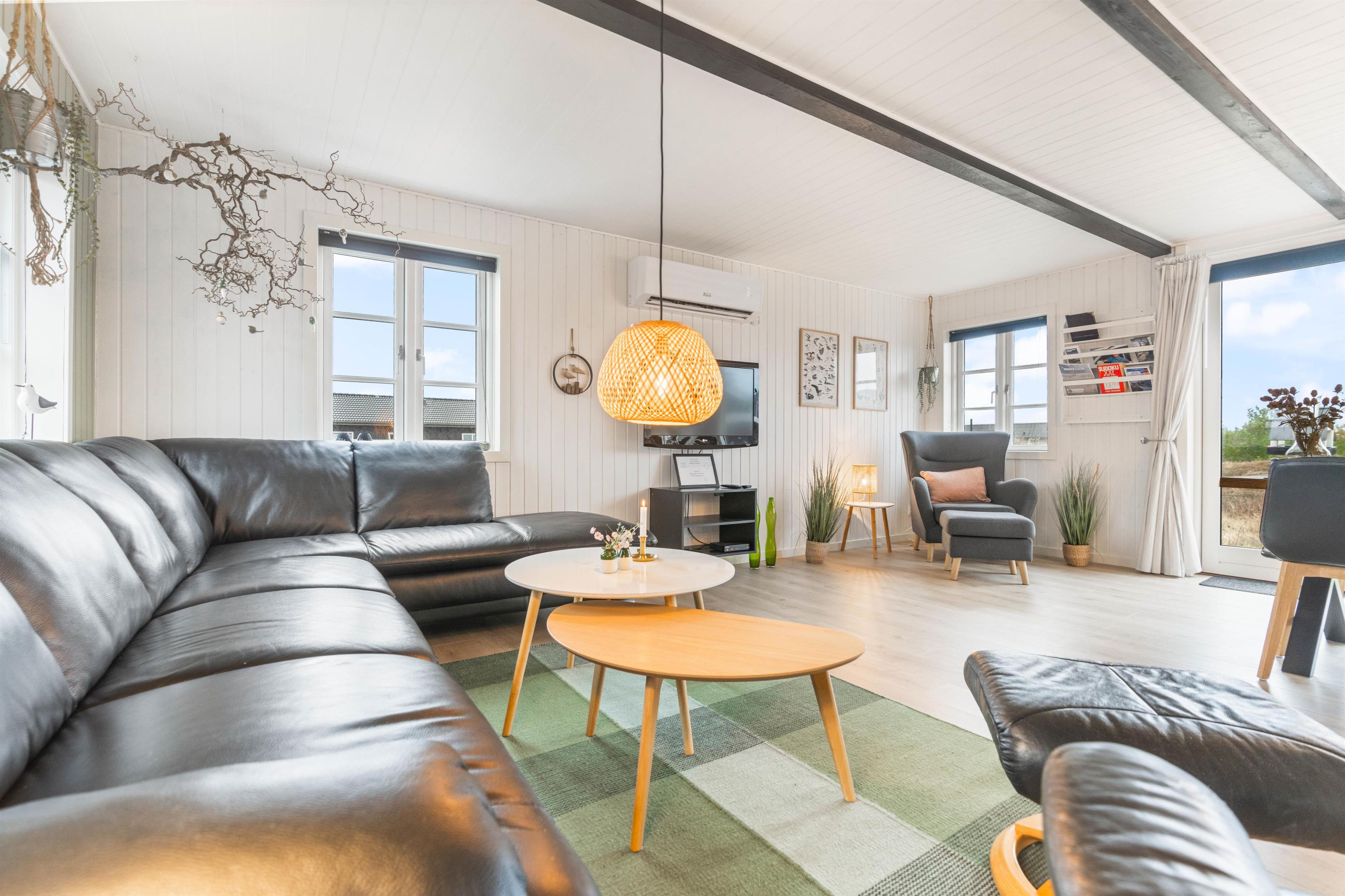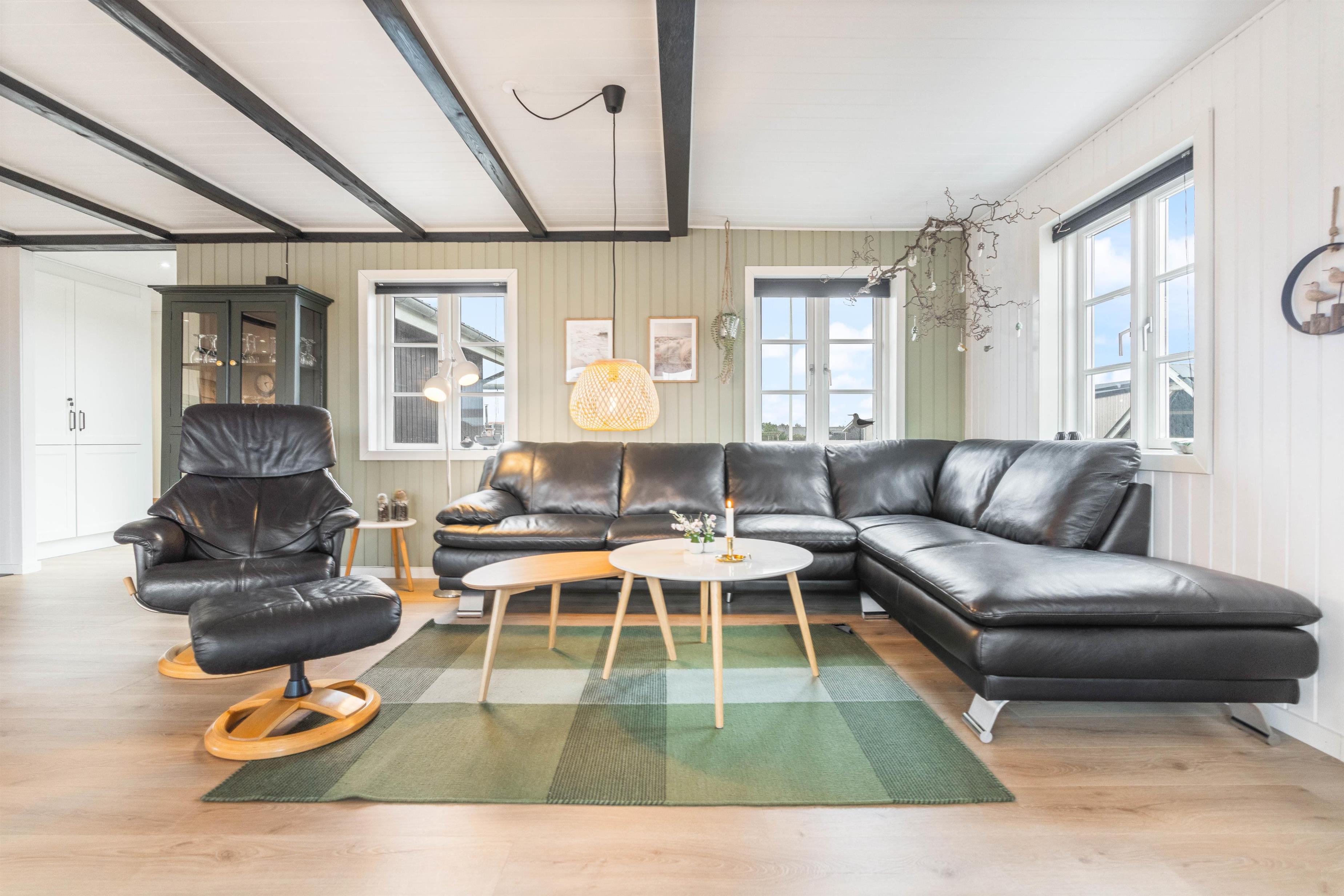 Samlingspunktet i feriehuset er det rummelige opholdsrum, der ligger i åben forbindelse med køkkenet. Her er der plads til hele familien, som kan samles til en hyggelig aften med et spil kort, mens brændeovnen knitrer i baggrunden. Her er også en varmepumpe, som I med fordel kan benytte jer af.