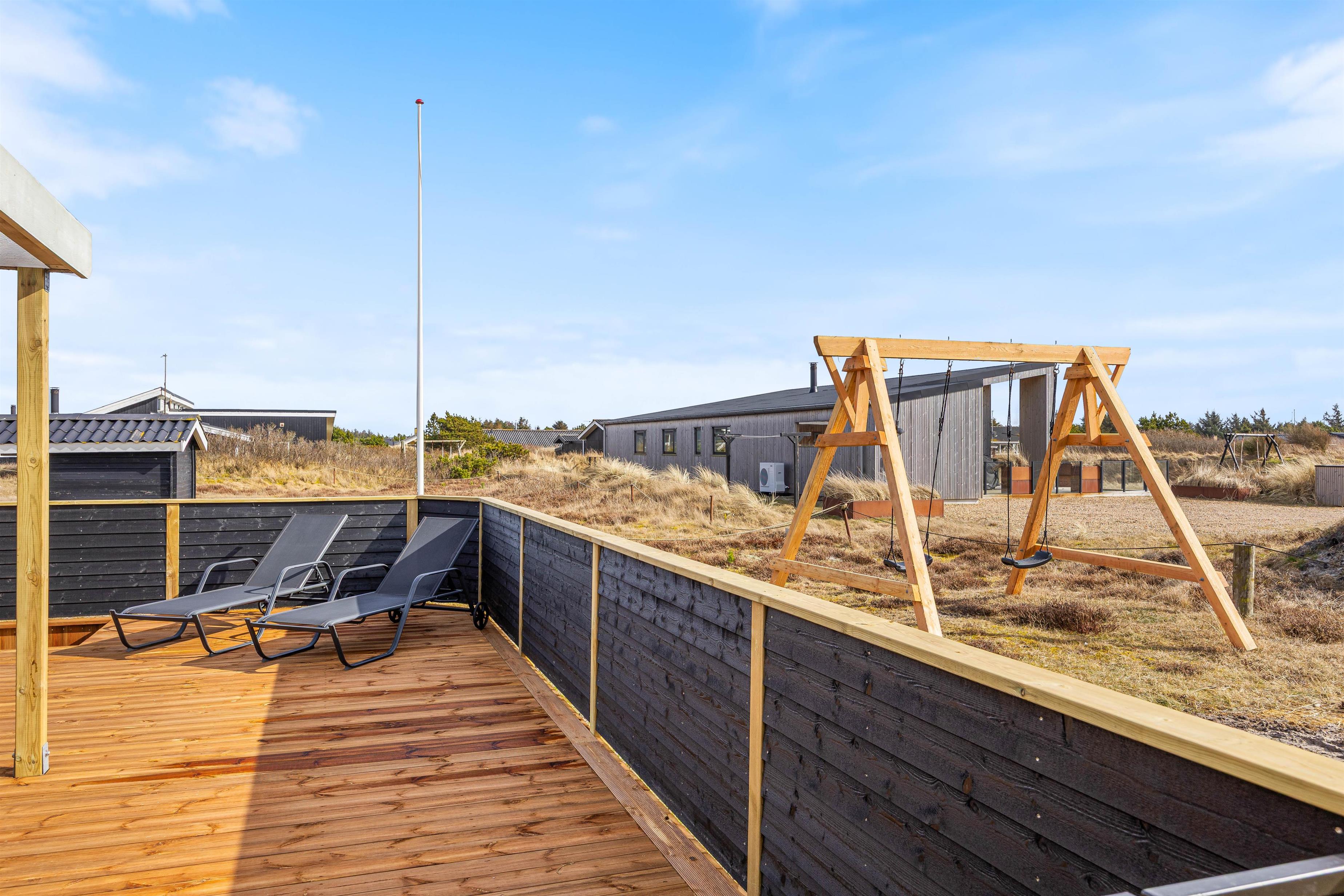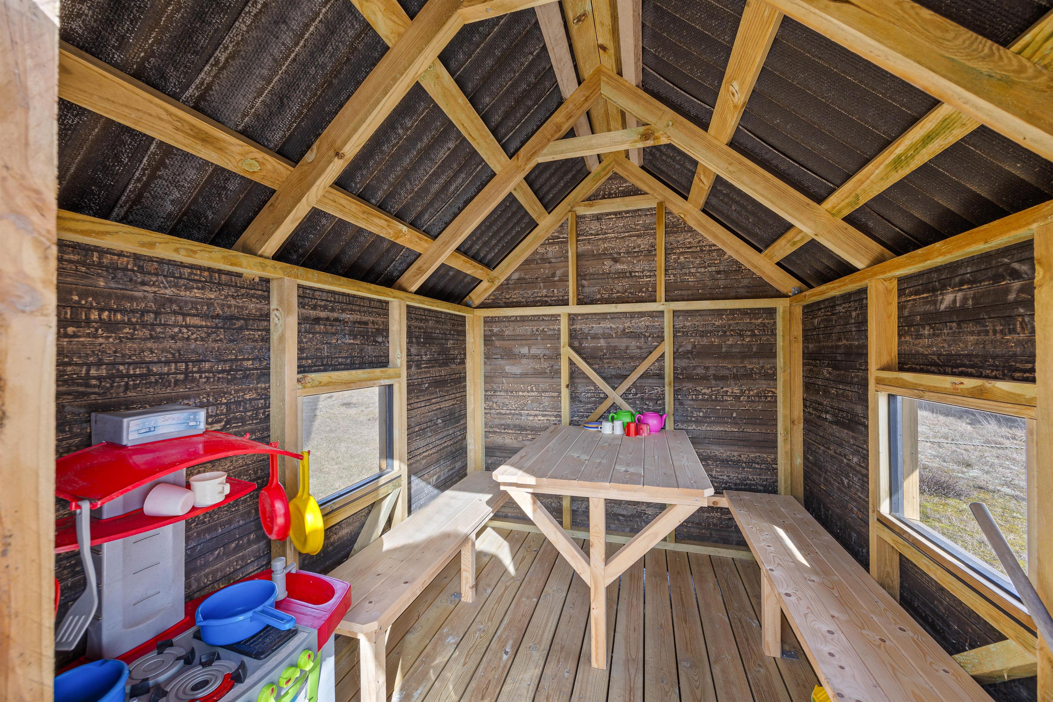 Sommerhuset har også en sydvendt terrasse, hvor dagen kan nydes, mens børnene leger på naturgrunden, der både har gyngestativ, sandkasse og trampolin. Den sydvendte terrasse er lukket, så her kan hunden gå frit rundt.