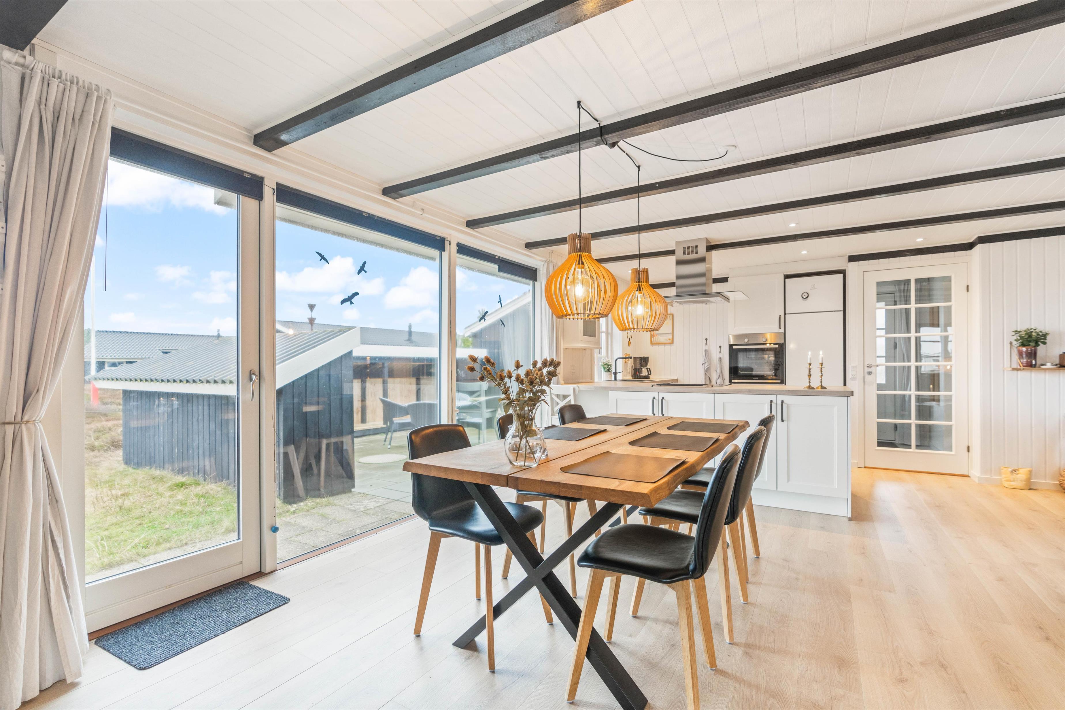 Det store vestvendte vinduesparti ved spisebordet skaber et godt lysindfald, som gør rummet lyst og indbydende.