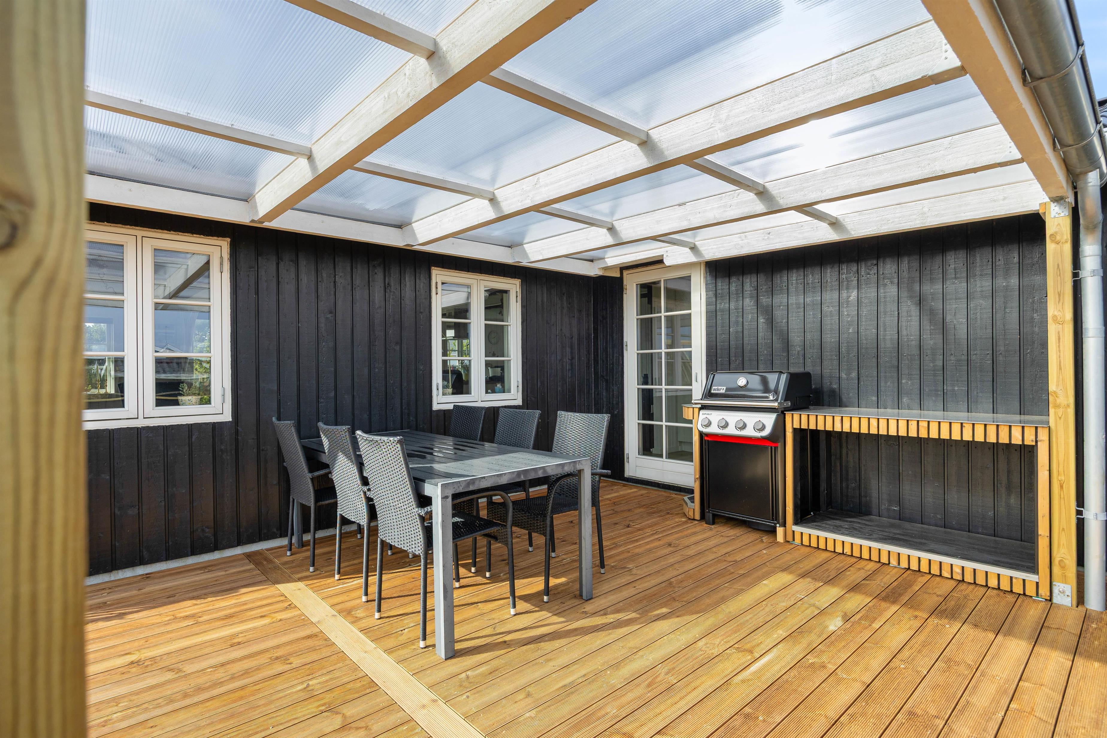 Fra stuen har I direkte udgang til den vestvendte terrasse, som er delvist afskærmet. Her kan I nyde et lækkert grillmåltid i aftensolen og i læ for vinden, inden sengen kalder.