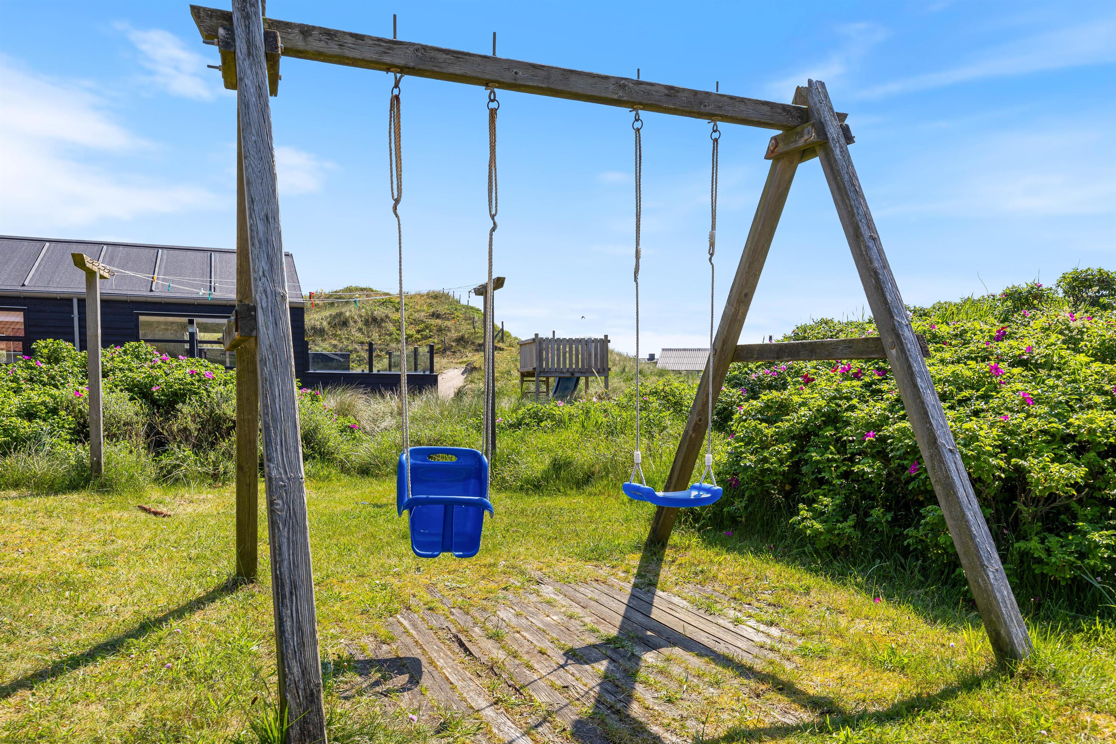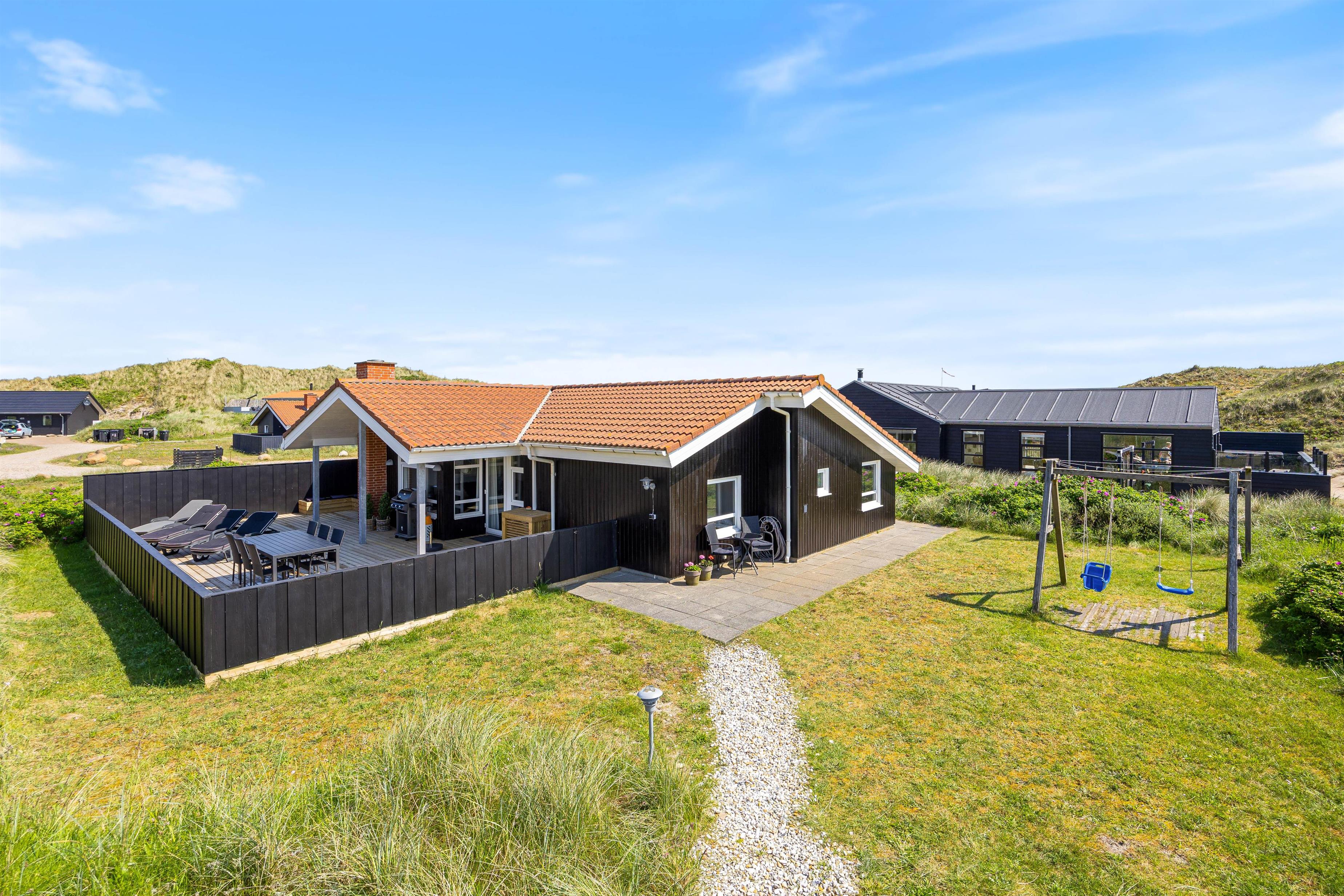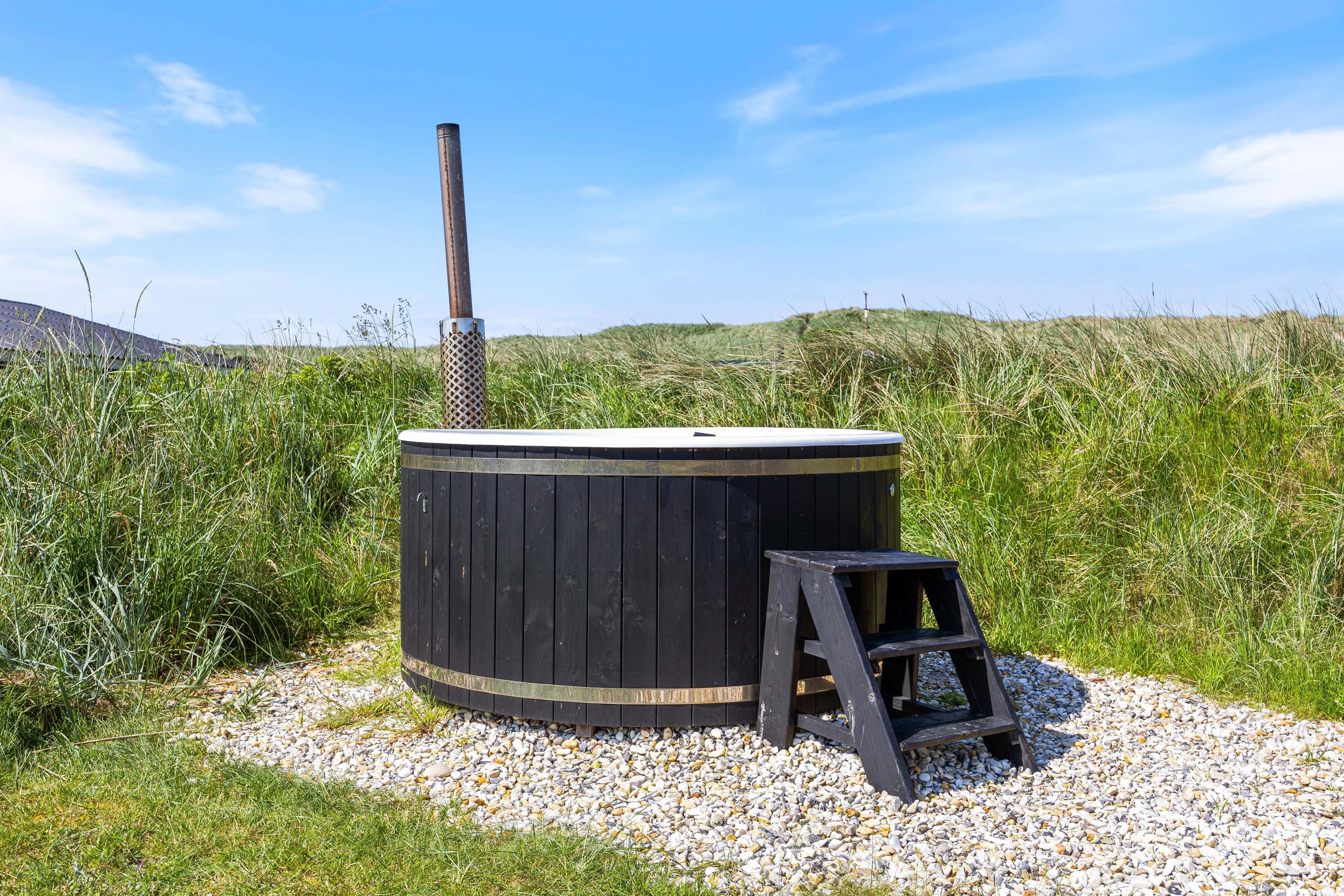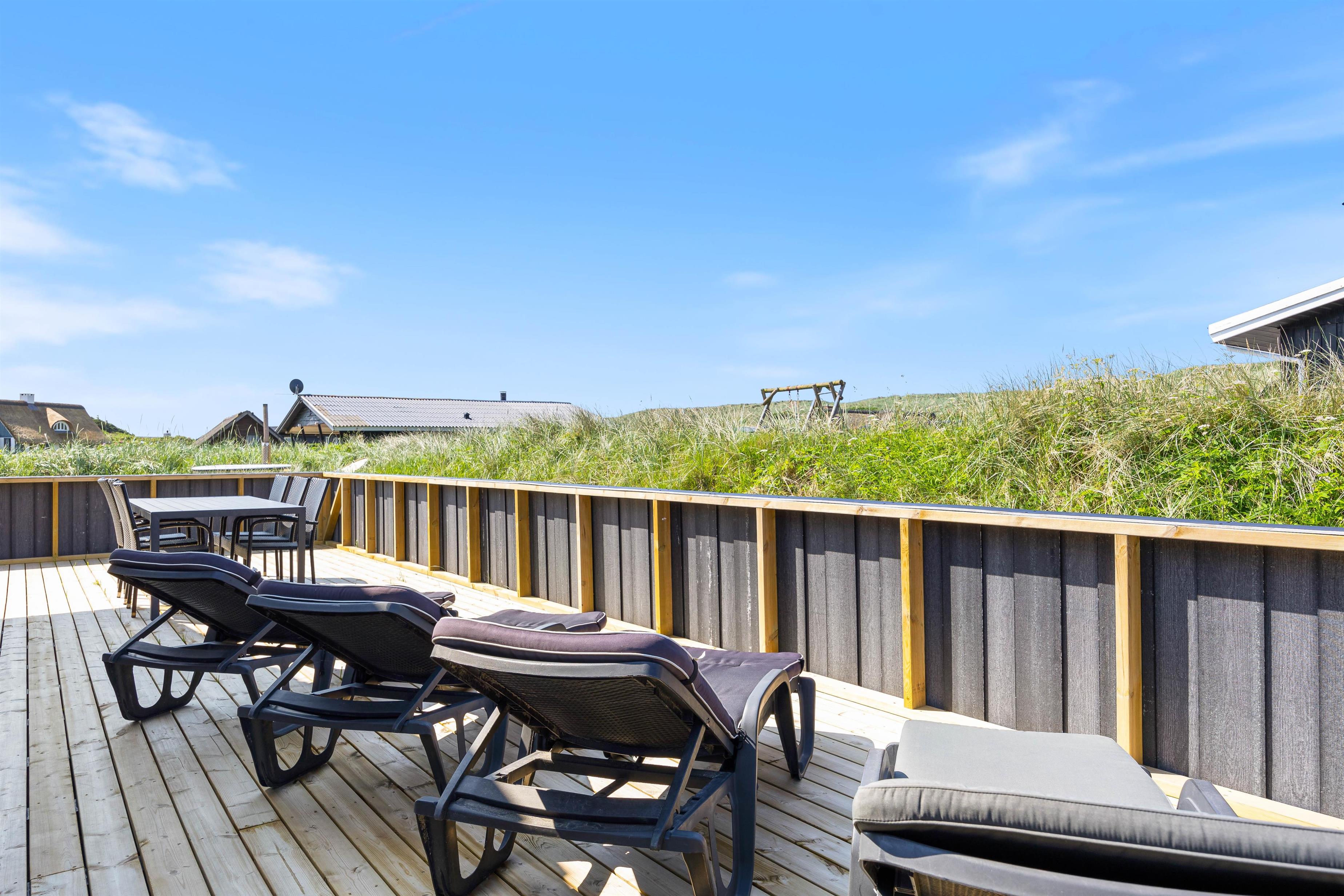 Feriehuset har en skøn vestvendt terrasse, hvor du kan nyde en fantastisk udsigt til klitterne og høre Vesterhavets brusen, mens du slapper af i vildmarksbadet eller griller.
