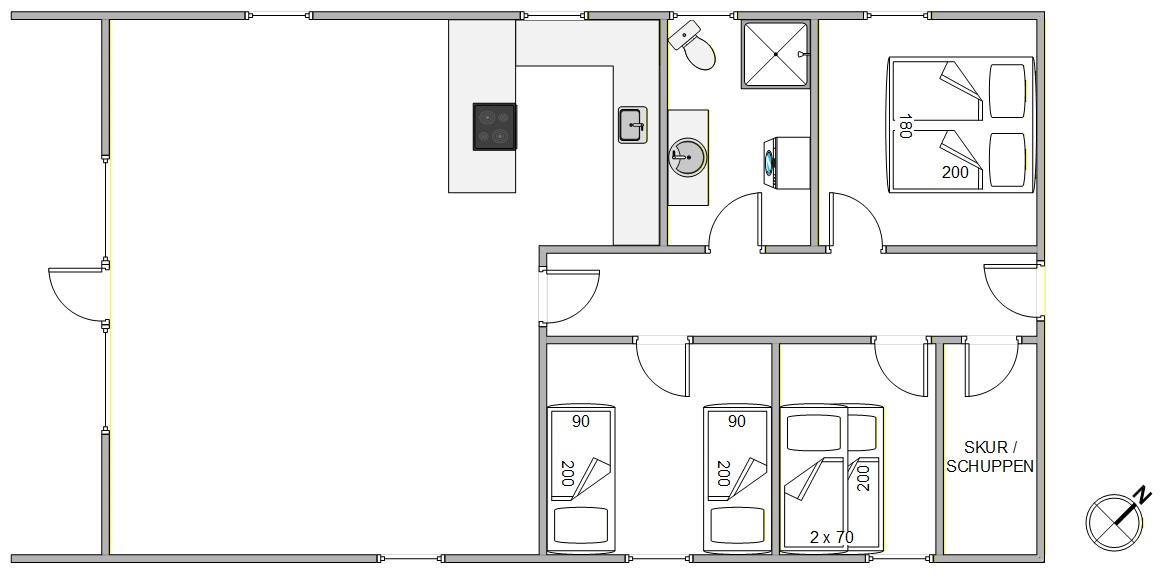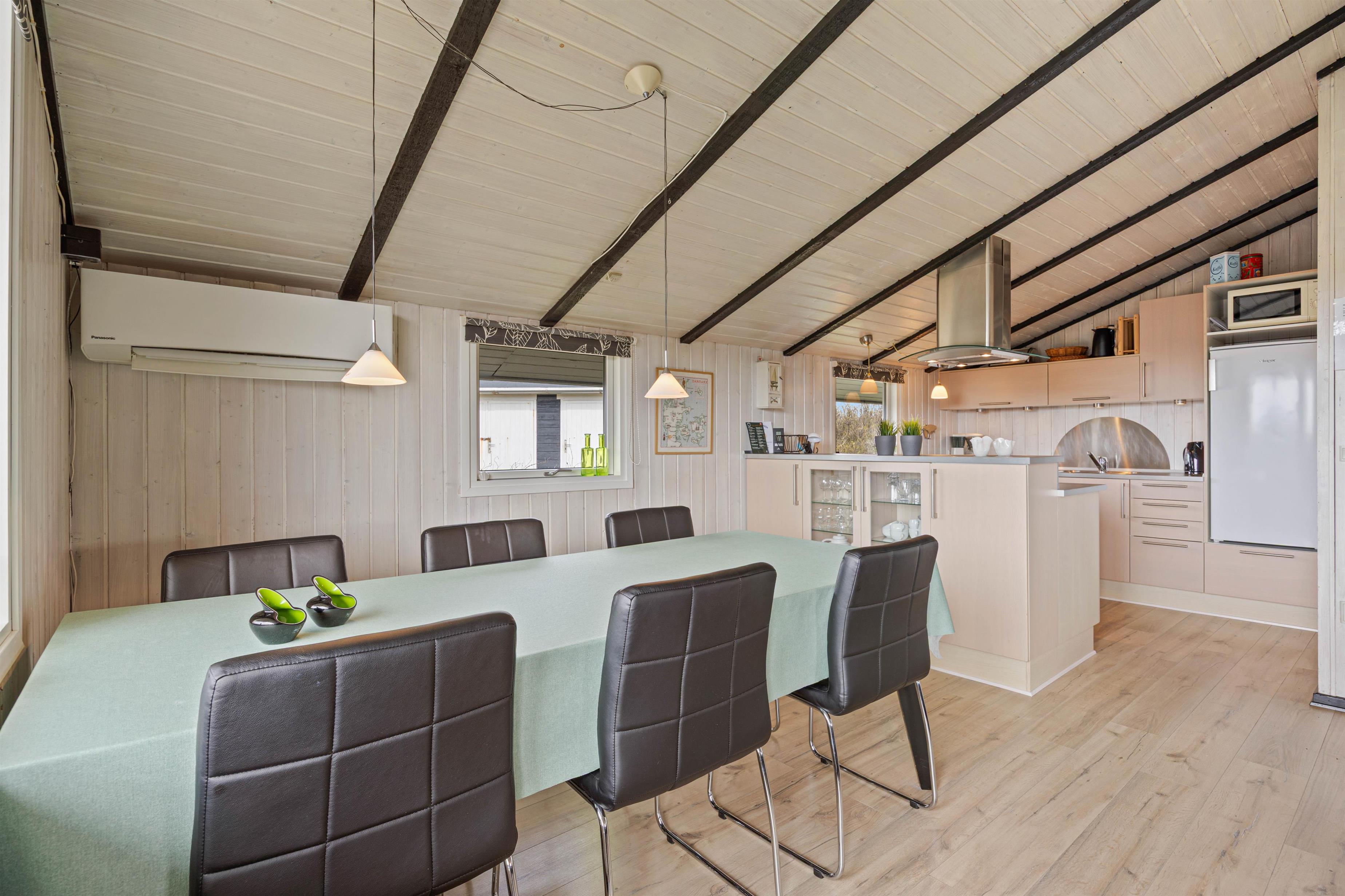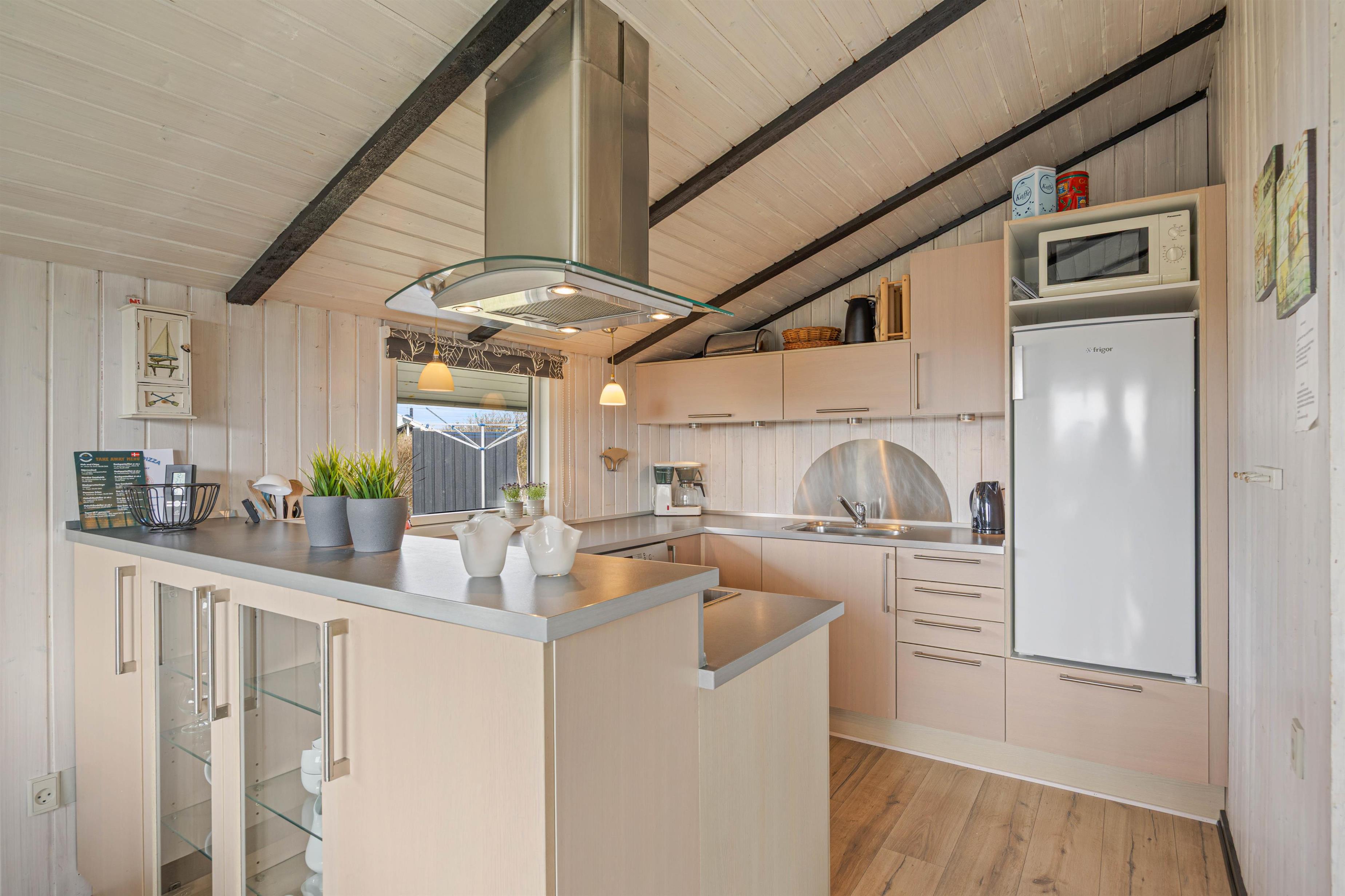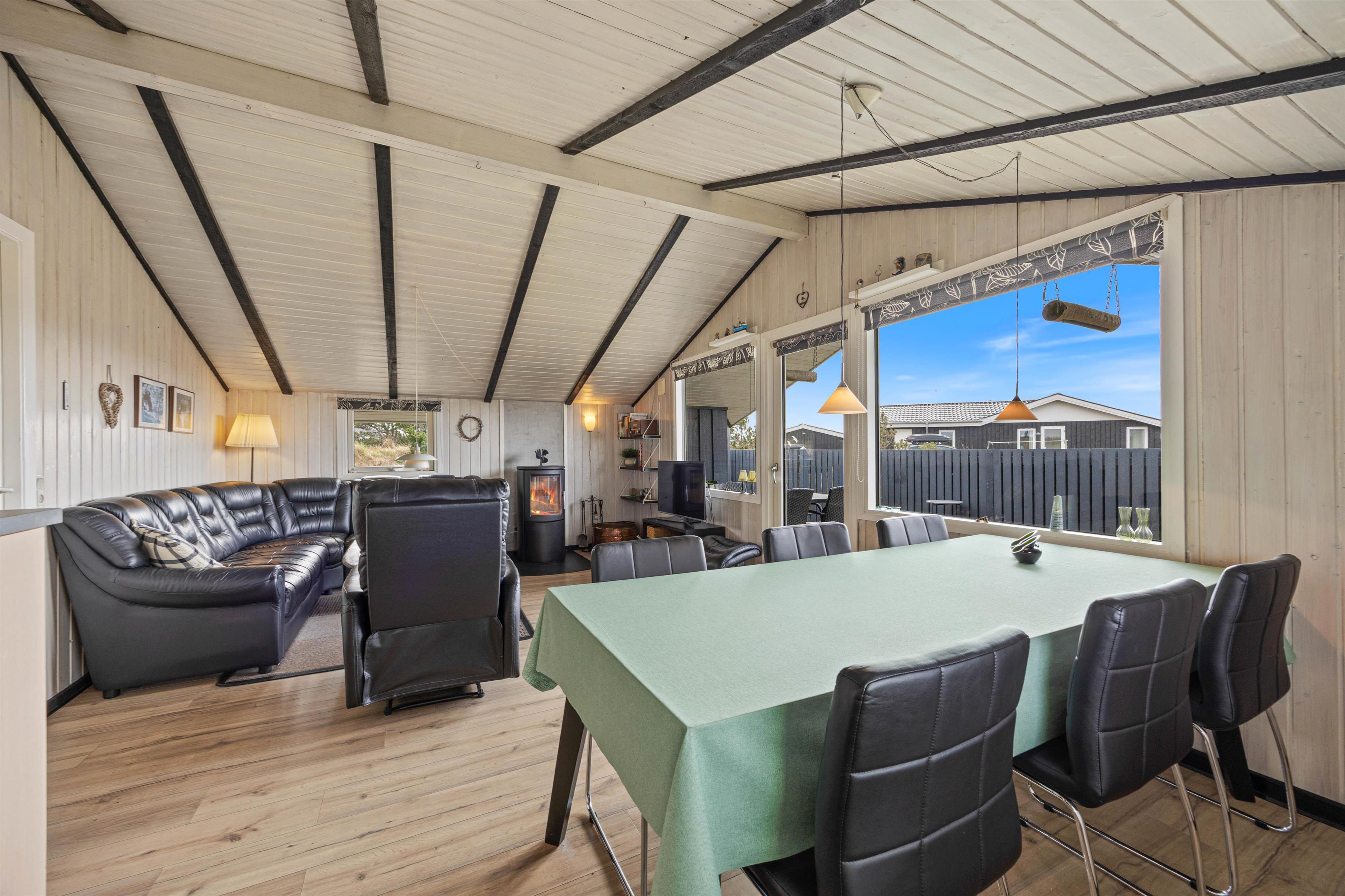 Sommerhuset byder på en varm og indbydende atmosfære. I stuen kan I tænde op i brændeovnen på kølige aftener, mens varmepumpen sørger for et behageligt indeklima året rundt. Den åbne planløsning mellem køkken, spiseplads og stue gør det nemt at være sammen og nyde ferien, hvad enten I vil lave mad, spise sammen eller bare slappe af i sofaen.