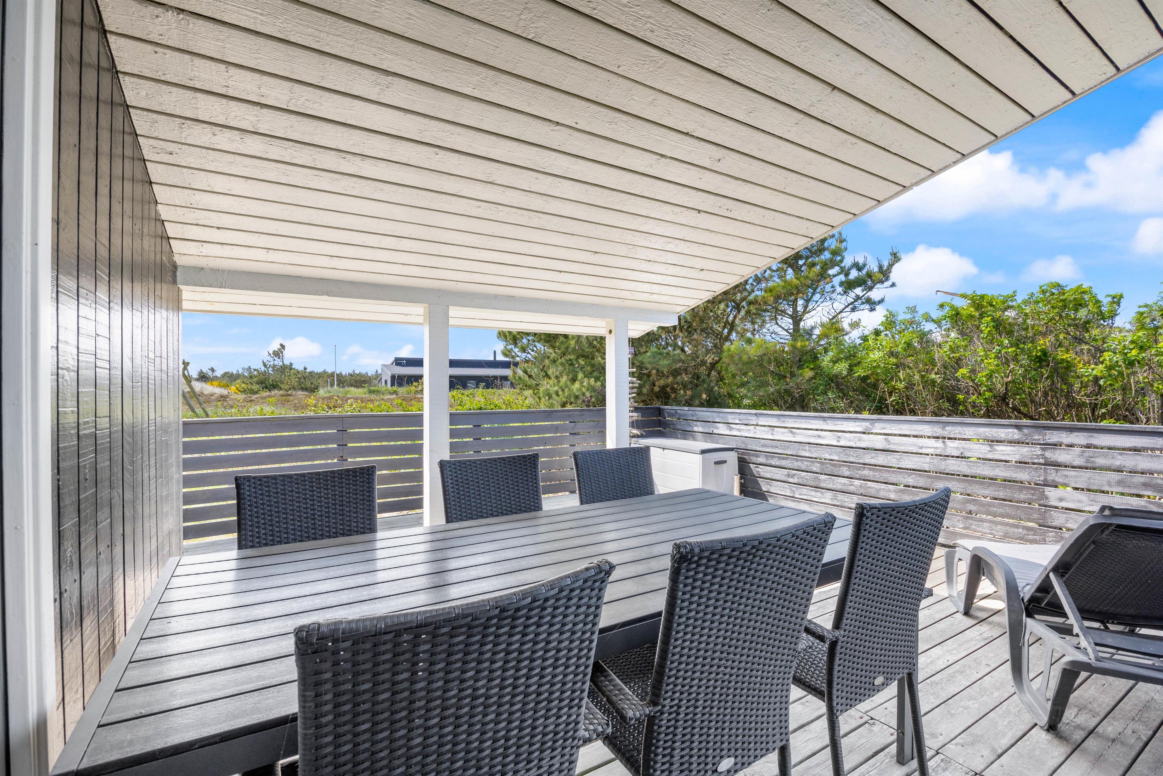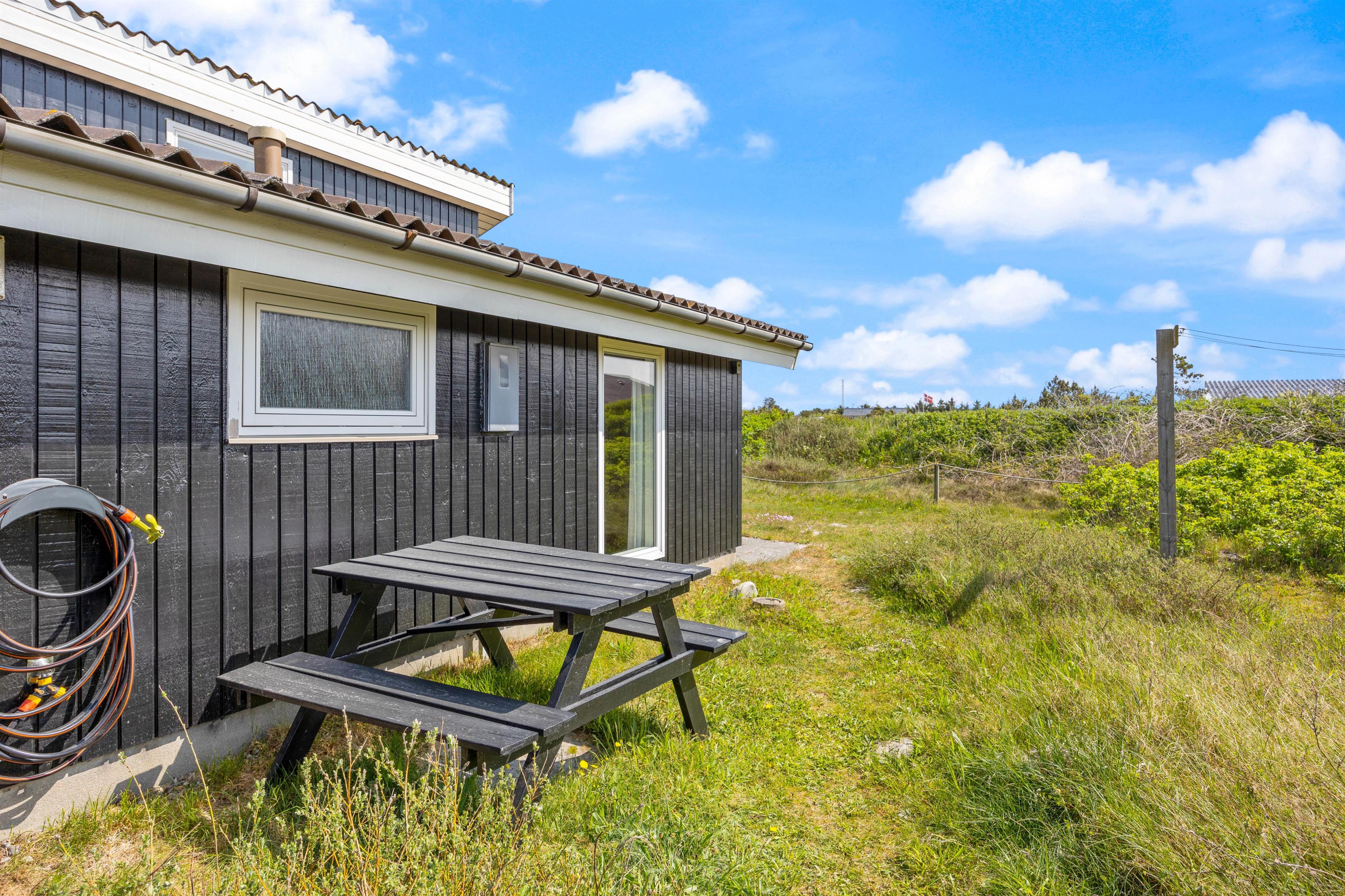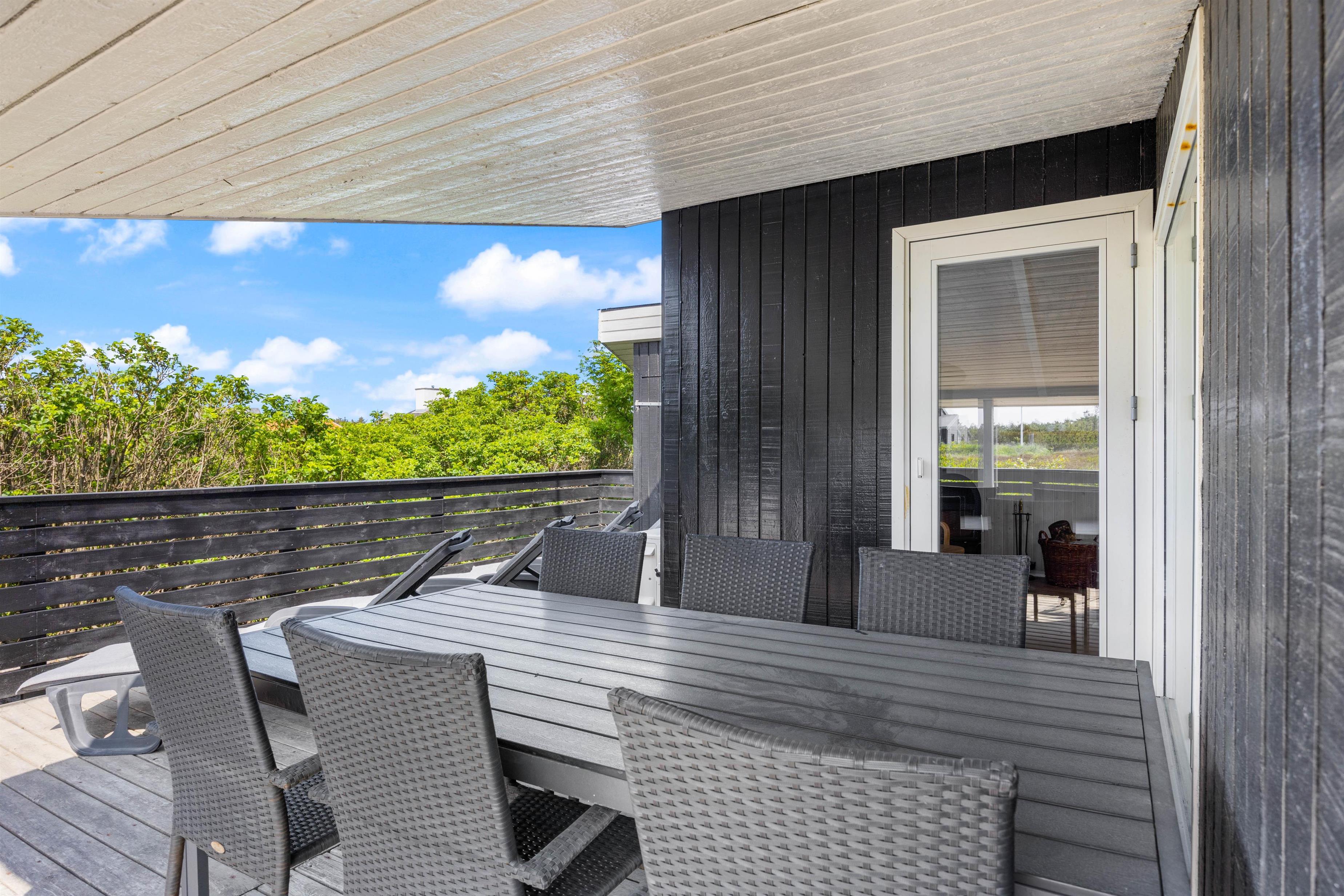 Sommerhuset på Julianevej 7 er omgivet af naturgrund. På den lukkede og delvist overdækkede terrasse kan du benytte de komfortable havemøbler. Her kan du slappe af og læse en bog, mens dine børn leger og brænder energi af. Om aftenen kan du tilberede en lækker grillmenu, og nyde den friske havluft.