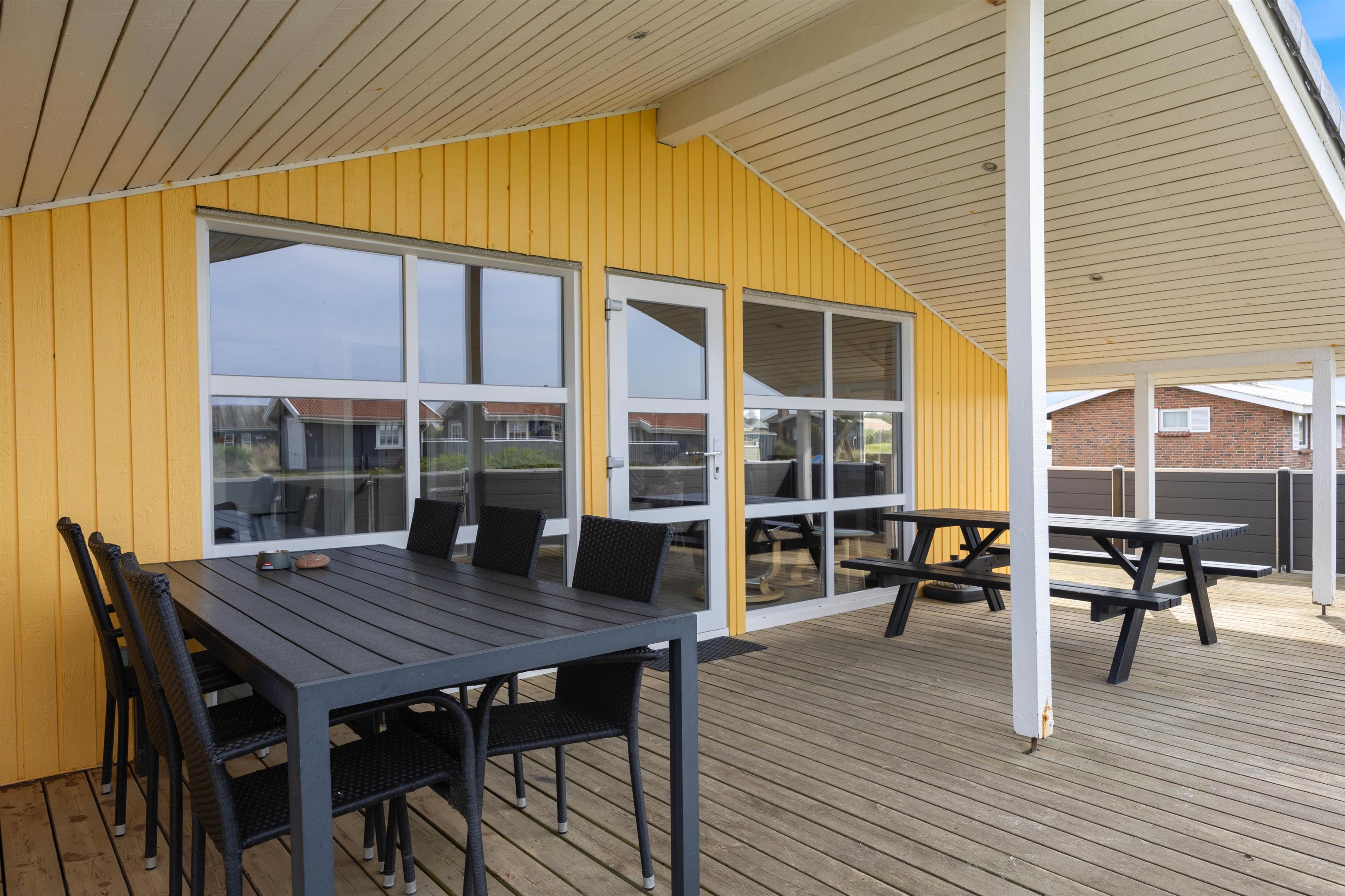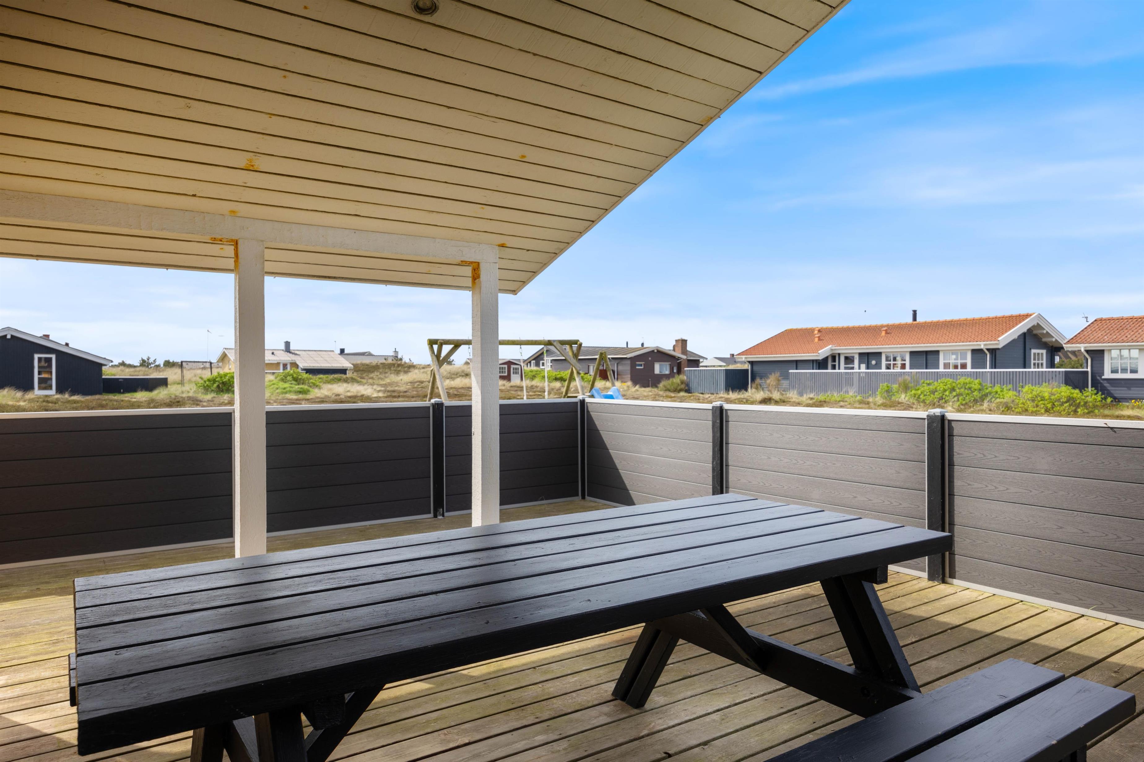 Sydvest for feriehuset har I en dejlig stor vinkelterrasse, hvor I har sol det meste af dagen, og hvor det også er muligt at sidde i læ. Og da terrassen er helt lukket af, kan I sagtens lade hunden gå rundt uden snor, mens I hygger jer i liggestolene med et par gode bøger.