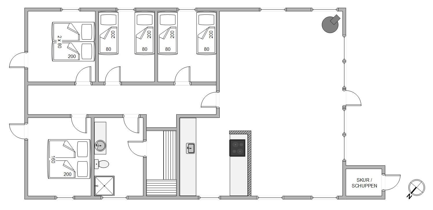 Efter en dejlig tur ved stranden kan I vende tilbage til feriehuset, tænde op i grillen og nyde en kølig drink på terrassen, mens I følger med i børnenes leg på gyngerne eller i sandkassen.