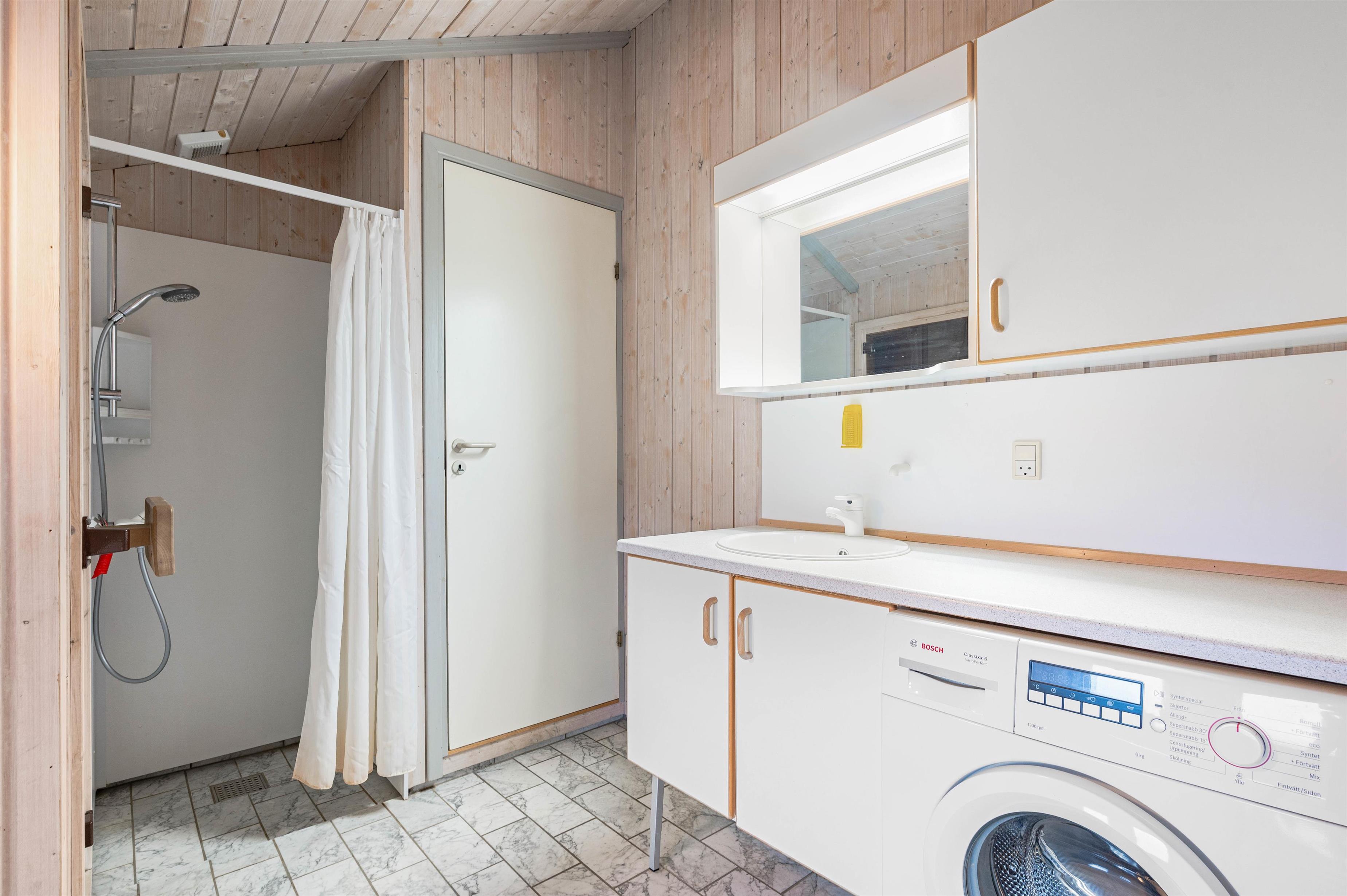 Badeværelse med spa og sauna indbyder til afslapning efter dagens oplevelser. Her findes også sommerhusets vaskemaskine.