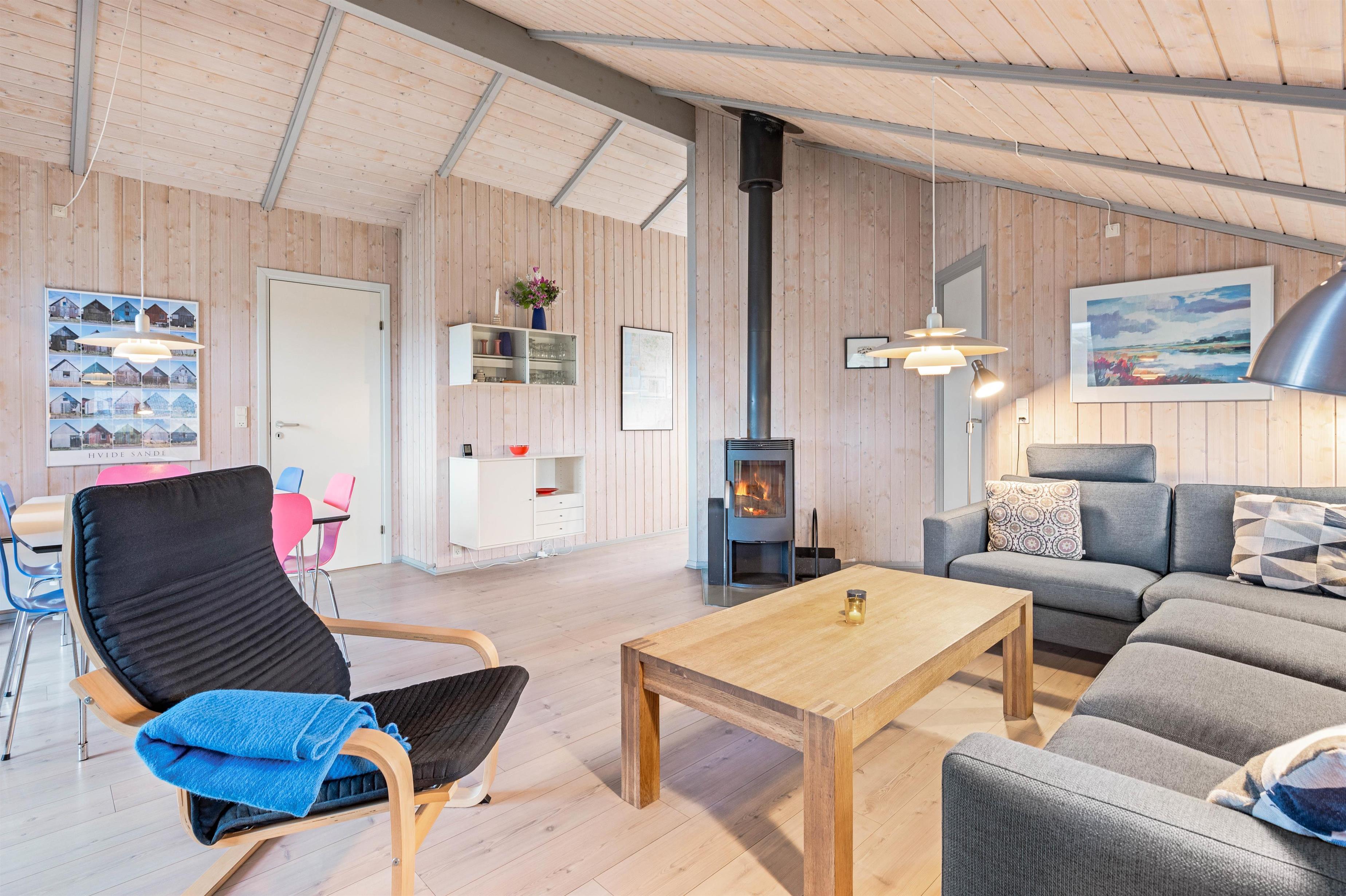 Her er lyse og venlige rum med træbeklædning på vægge og lofter og trægulv giver det første indtryk, når I træder ind i det praktiske køkken med alt i udstyr. Herfra er der adgang til den store møblerede stue, hvor brændeovnens flammer hygger om familien – eventuelt sammen med feriehusets TV med parabol og radio.