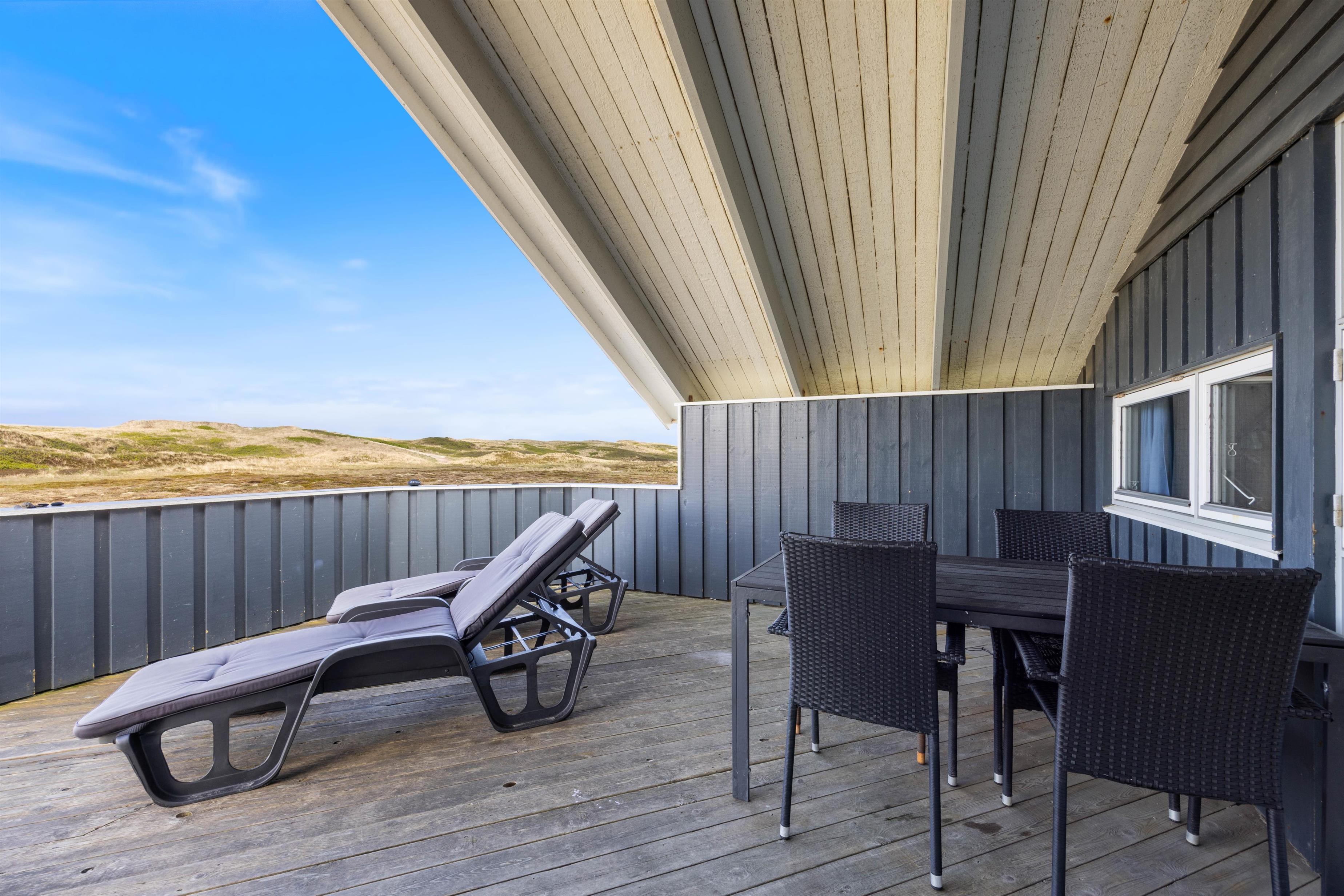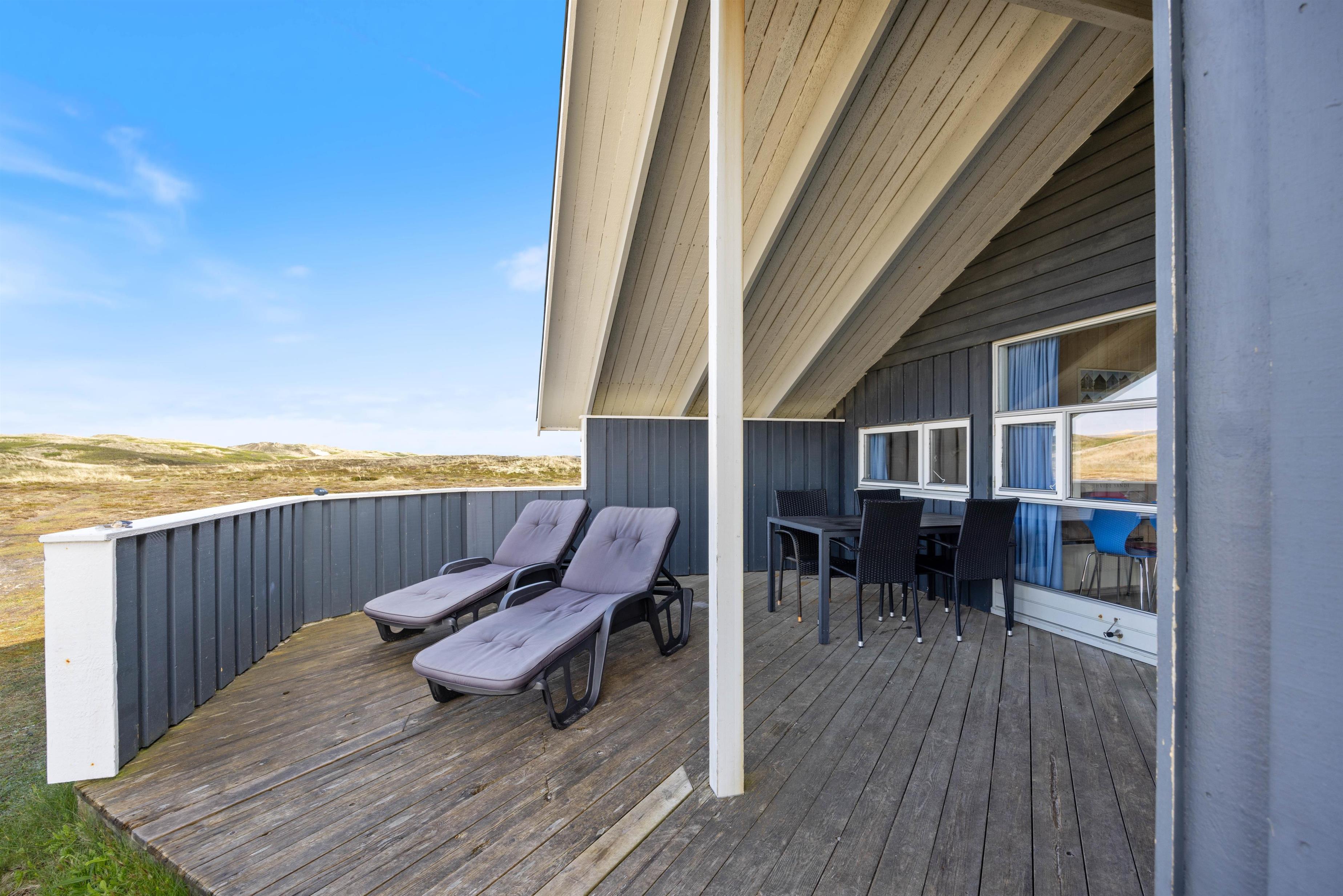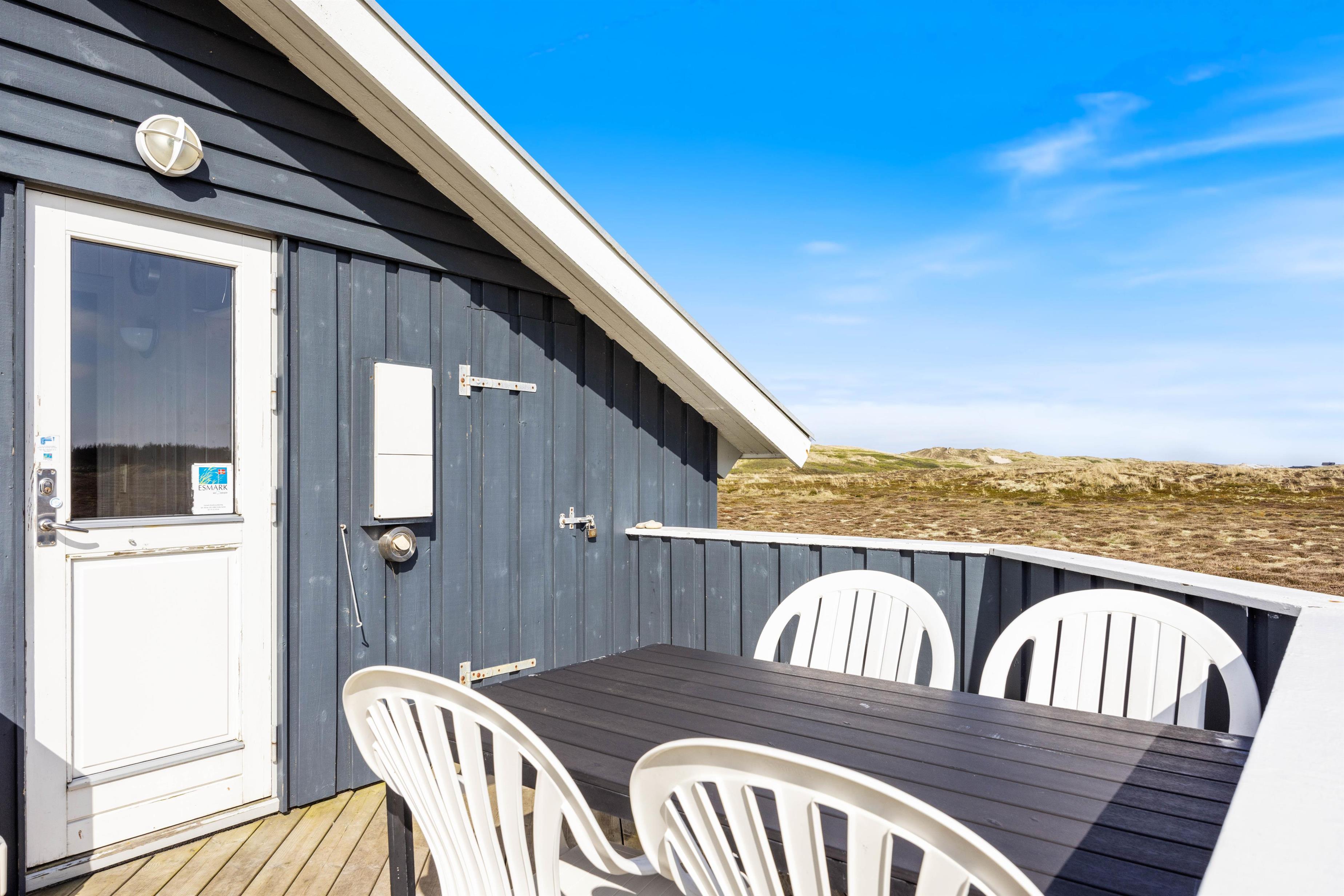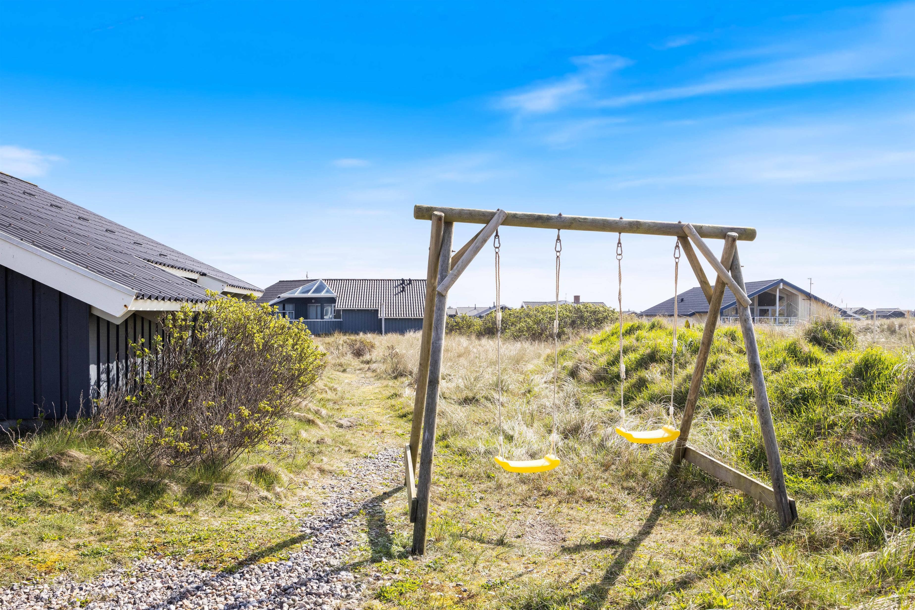 Fra den store naturgrund er der fri udsigt over klitter og hede og kun et par minutters gang til den skønne badestrand i Bjerregård. På feriehusets velafskærmede terrasse kan I hygge jer med mad fra feriehusets grill. Solen kan nydes i liggestolene, mens der for børnene både er gynger og sandkasse.