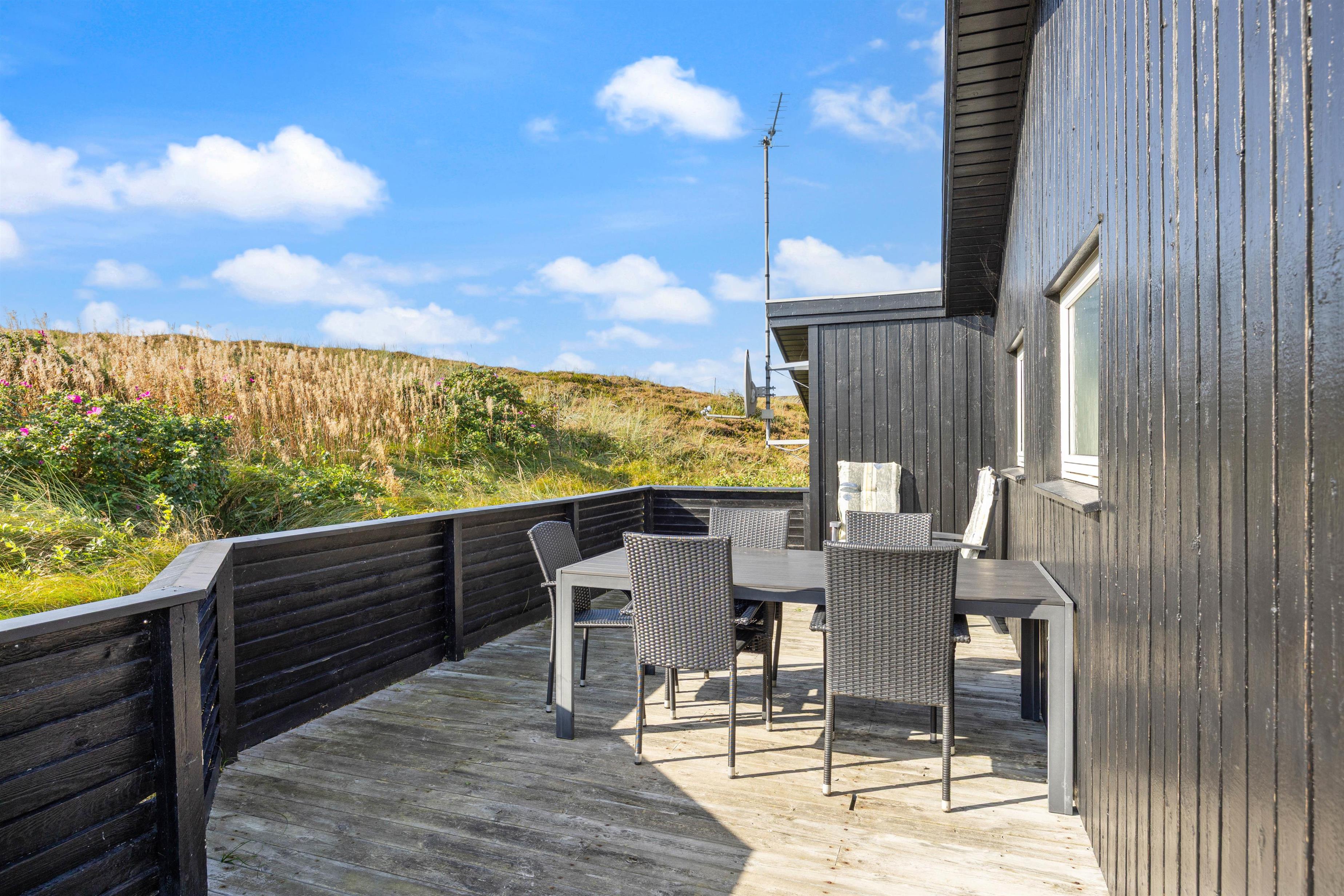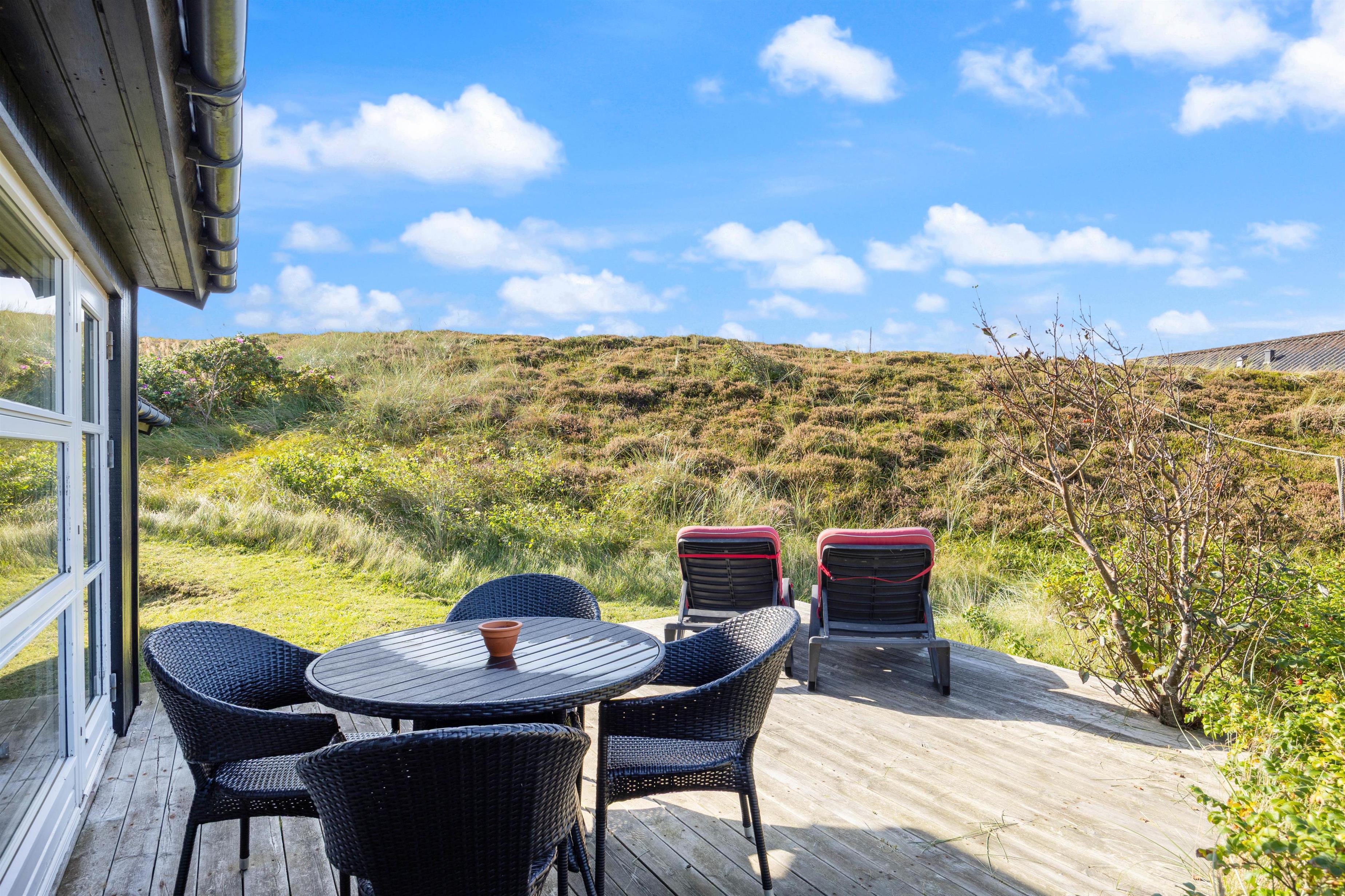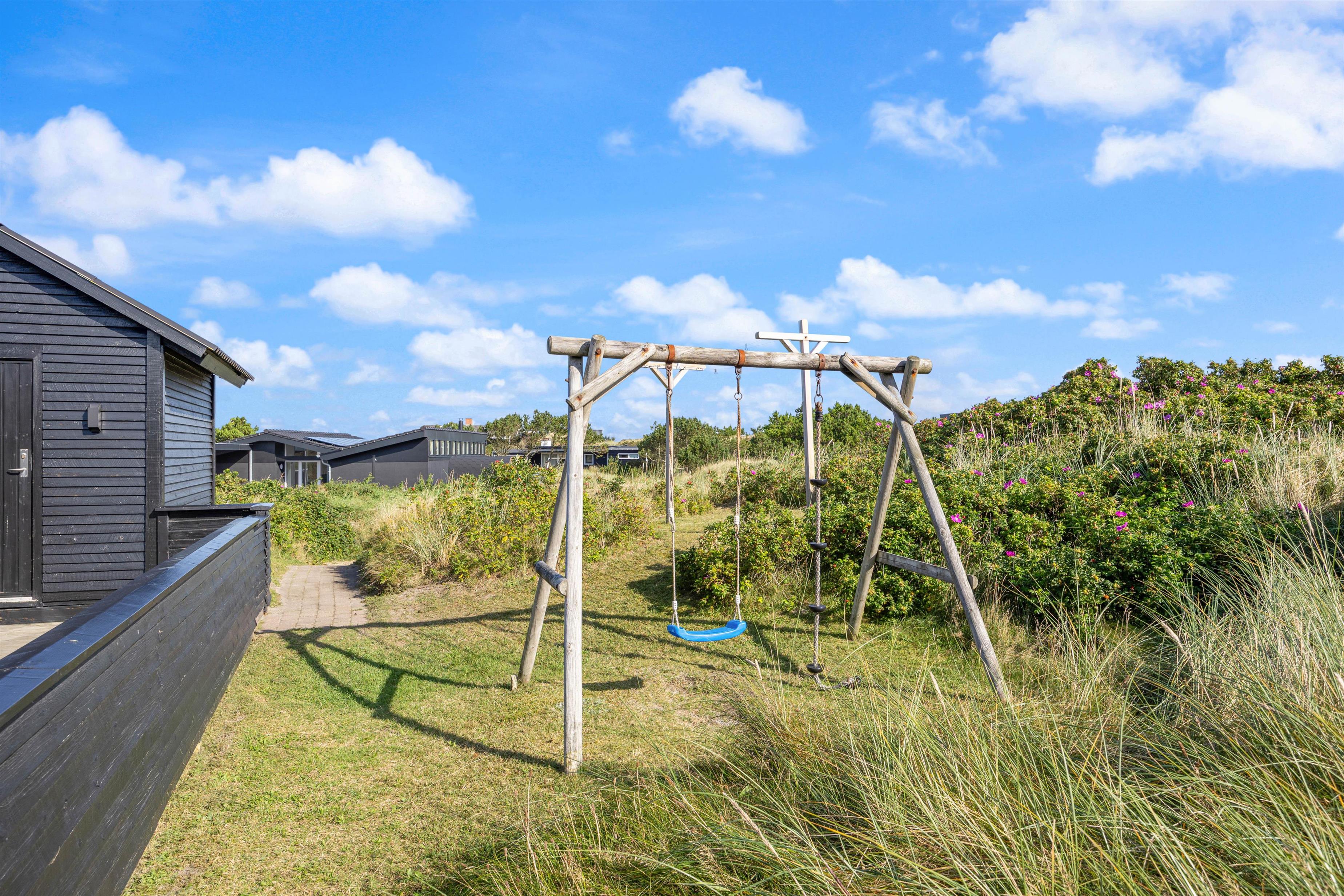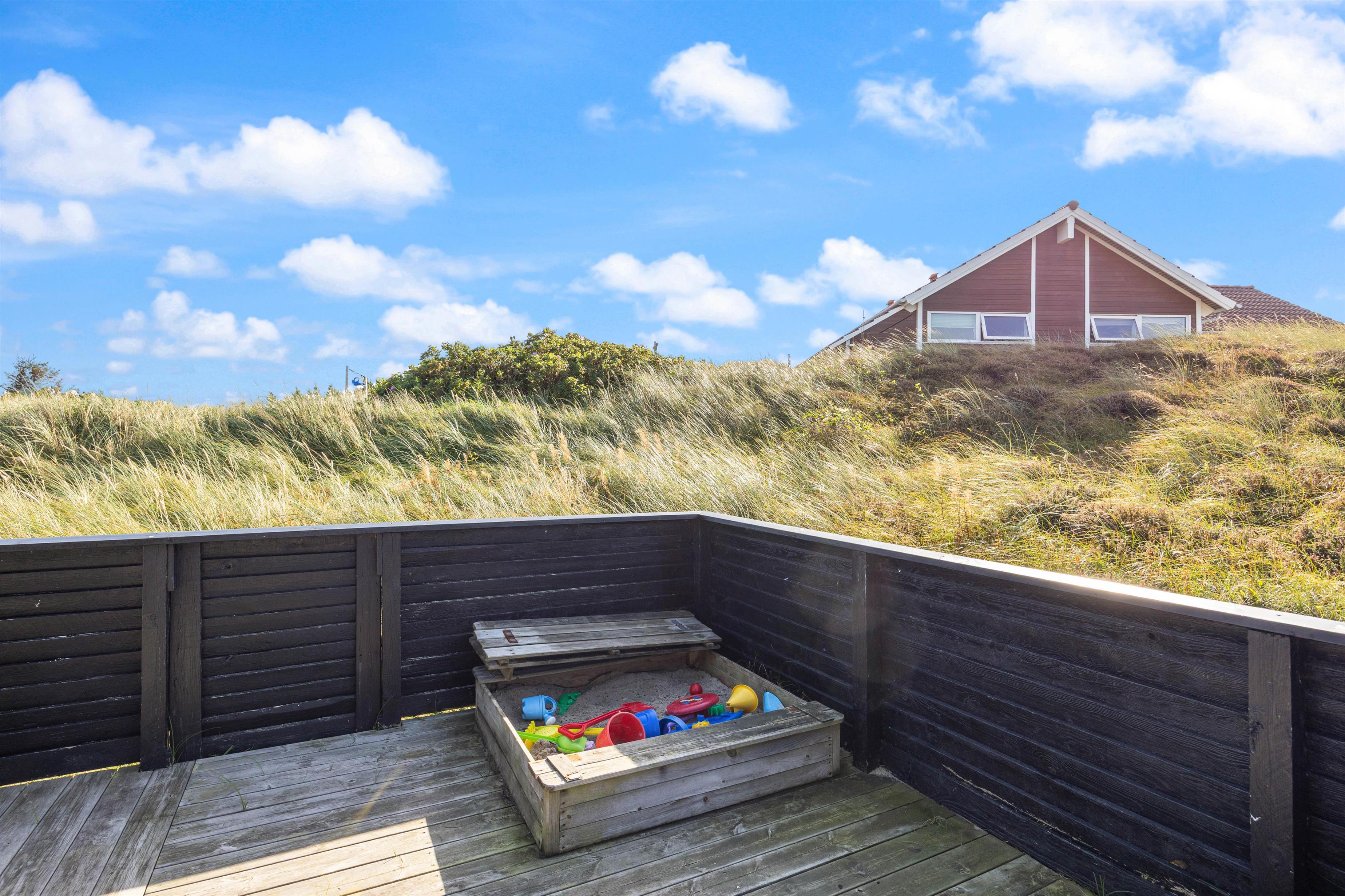 Sommerhuset har en fin læfyldt terrasse mod vest og en stor og helt lukket terrasse mod øst og syd, hvor familiens mindste kan boltre sig. Her er også gyngestativ og sandkasse, som er et absolut hit blandt de yngste.