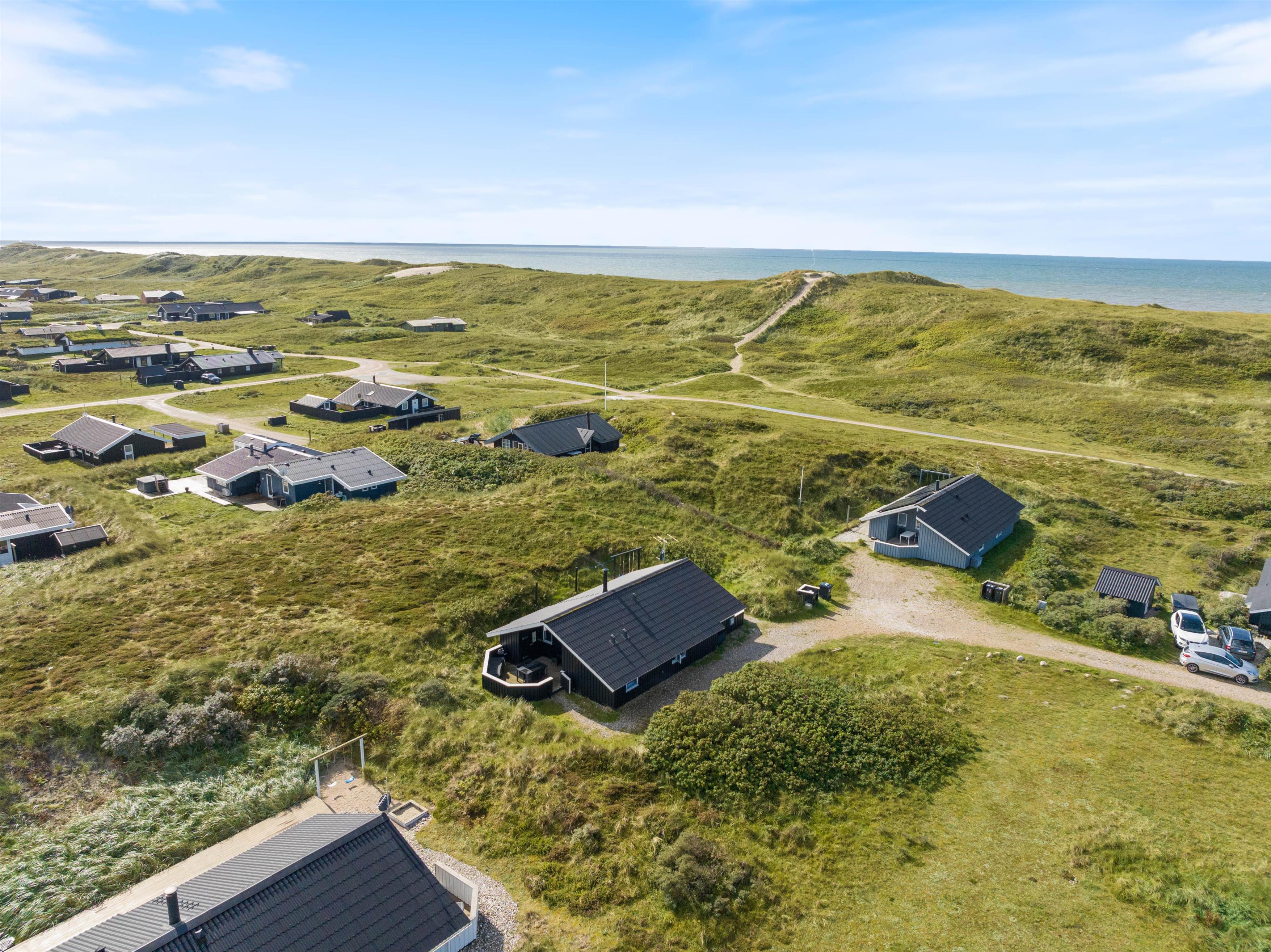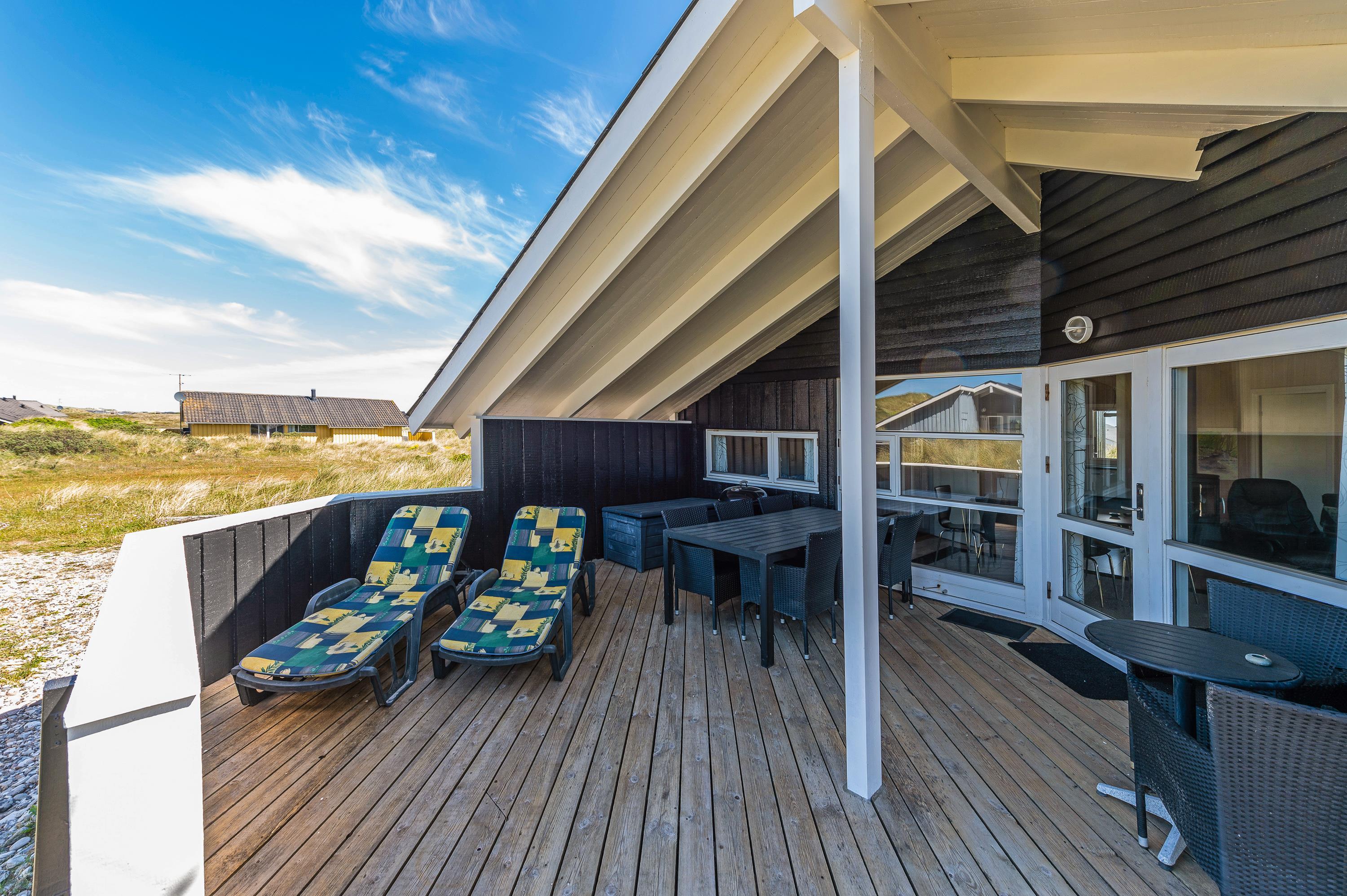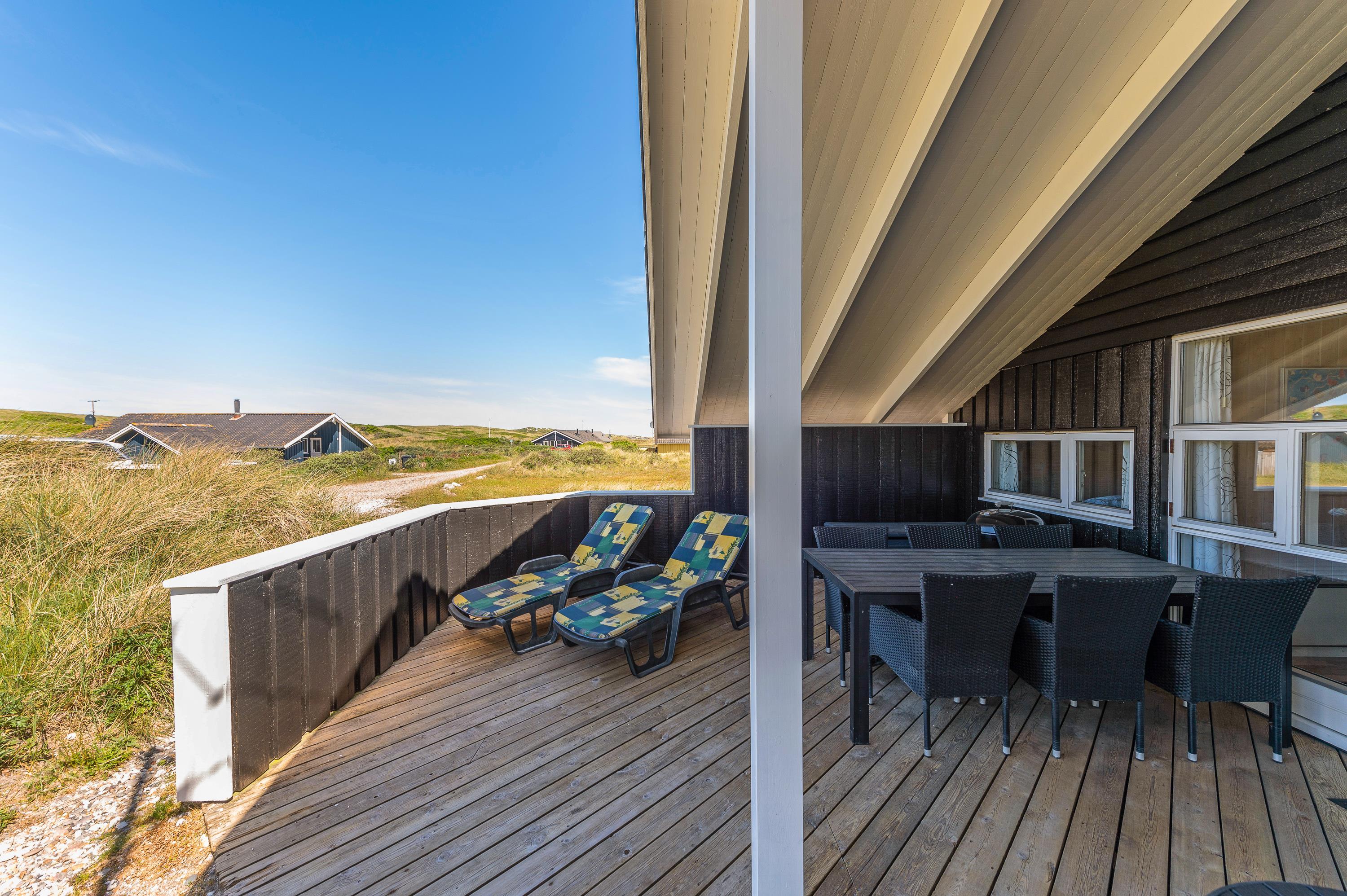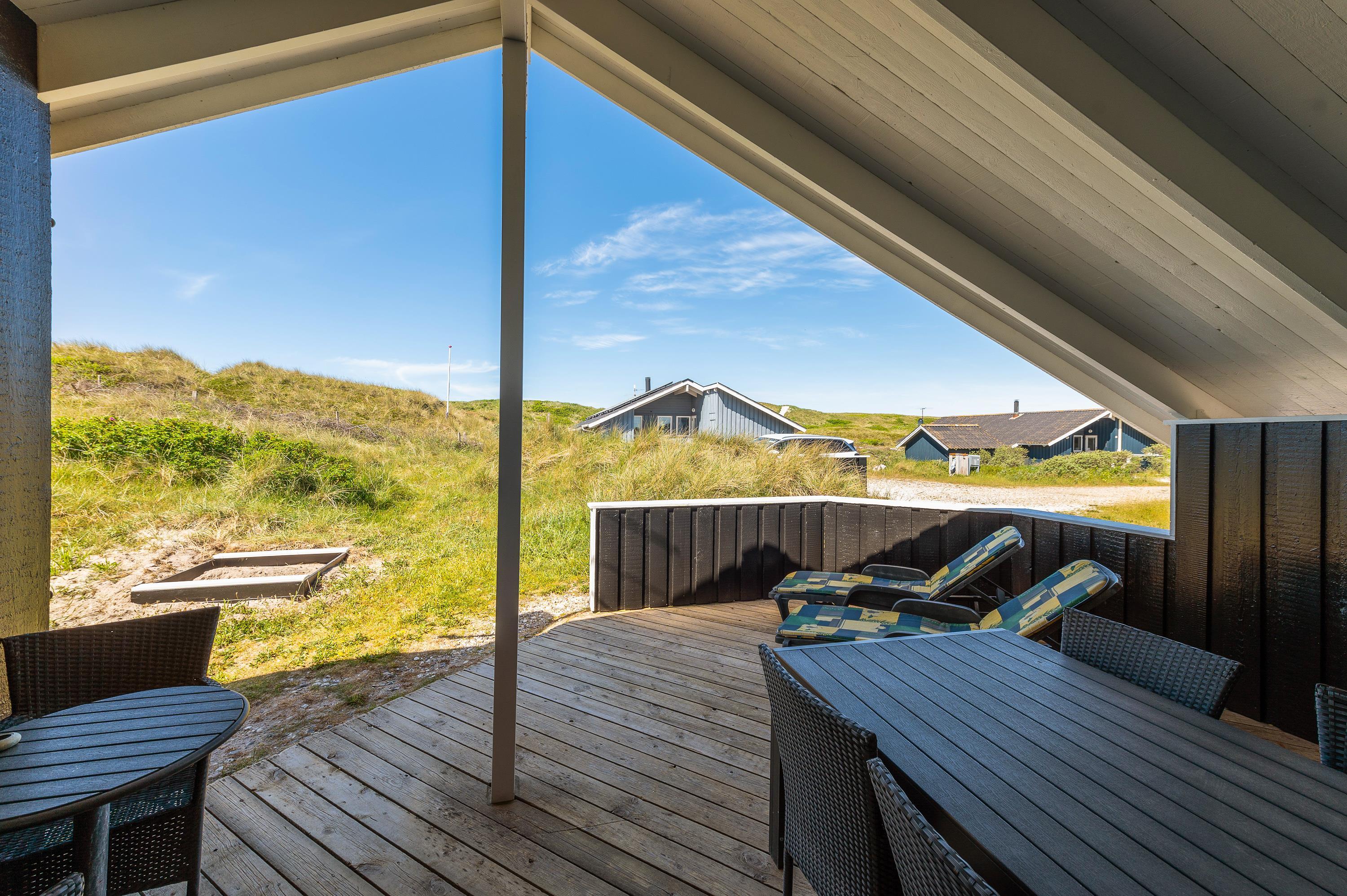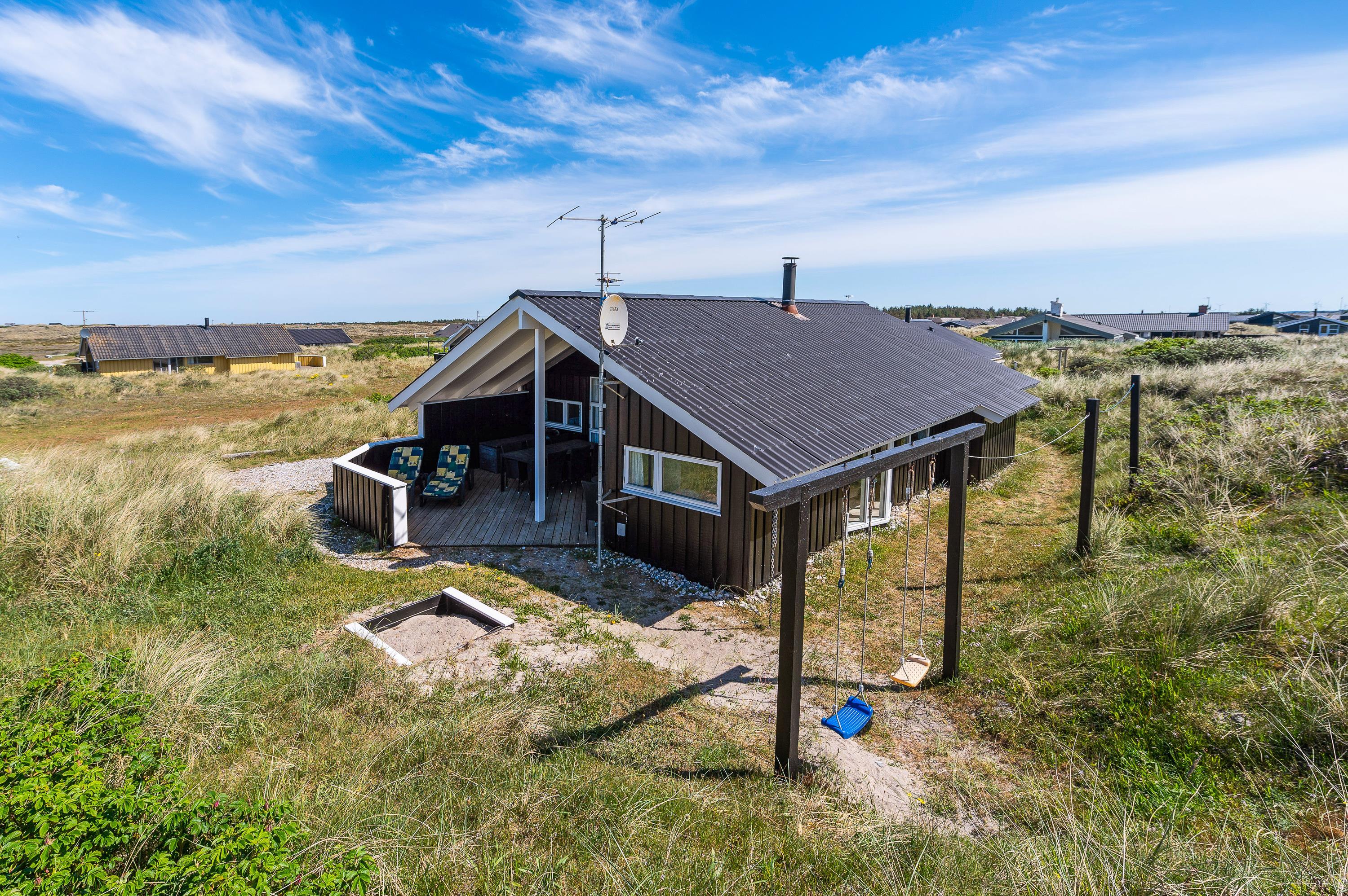 I dette hyggelige feriehus bor familien midt i den storslåede natur på Holmsland Klit kun et stenkast fra stranden med de fantastiske bademuligheder i Vesterhavet. De store fredede hedearealer giver helt sikkert lyst til en travetur med familiens hund. Den store overdækkede og afskærmede terrasse indbyder til afslapning i de gedigne havemøbler og liggestole. Her kan maden tilberedes på sommerhusets grill, mens de mindste leger med sandkasse og gynger.