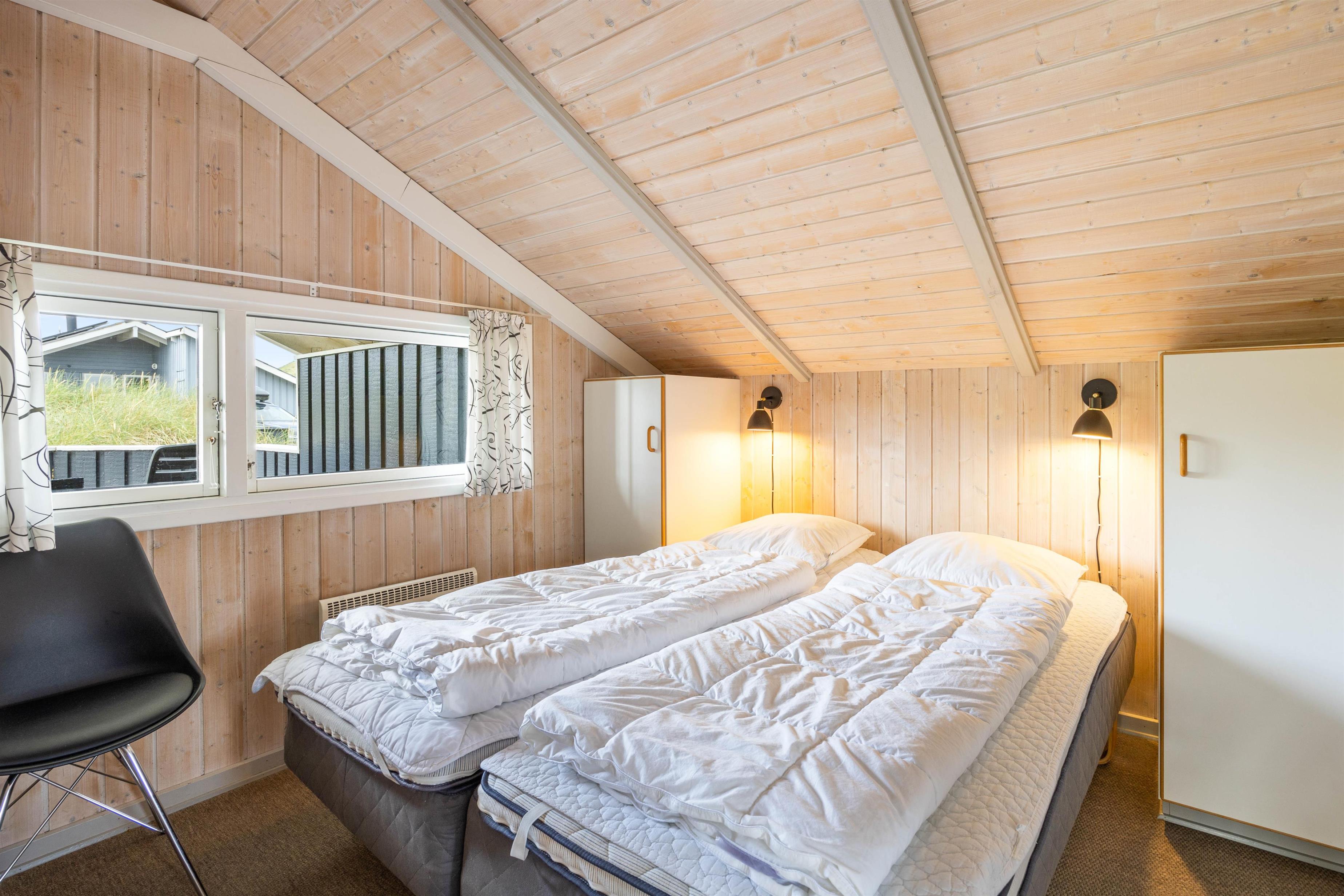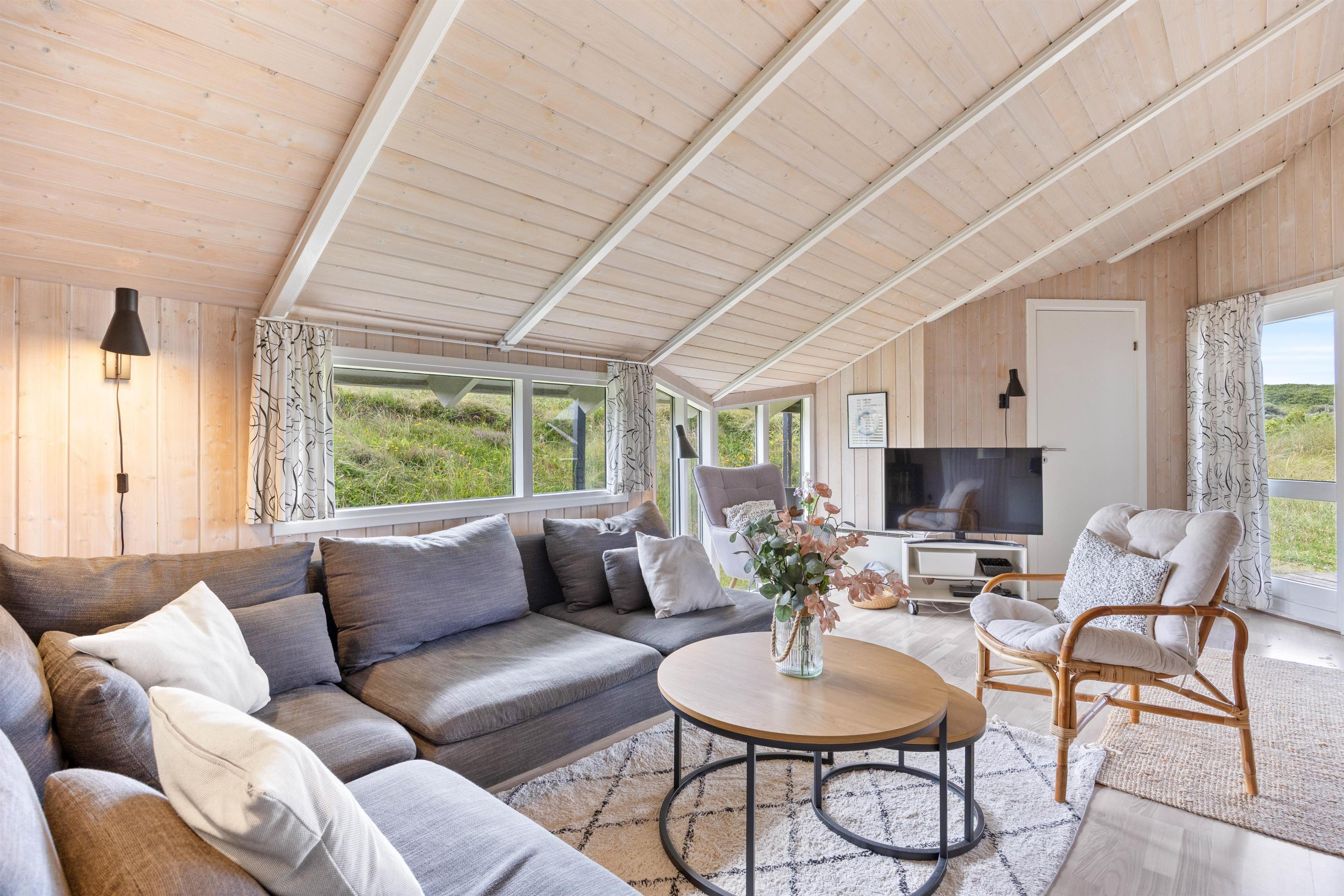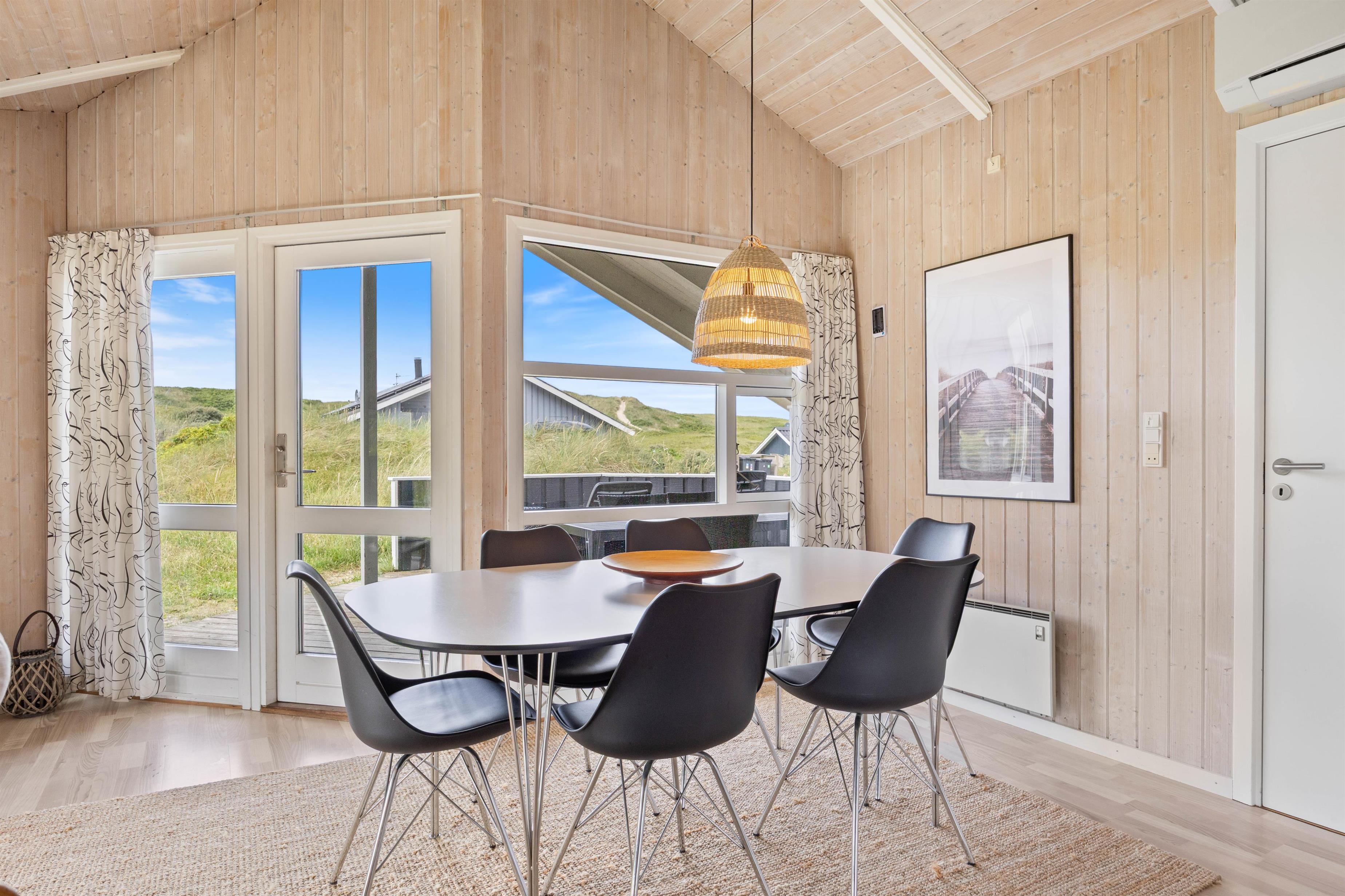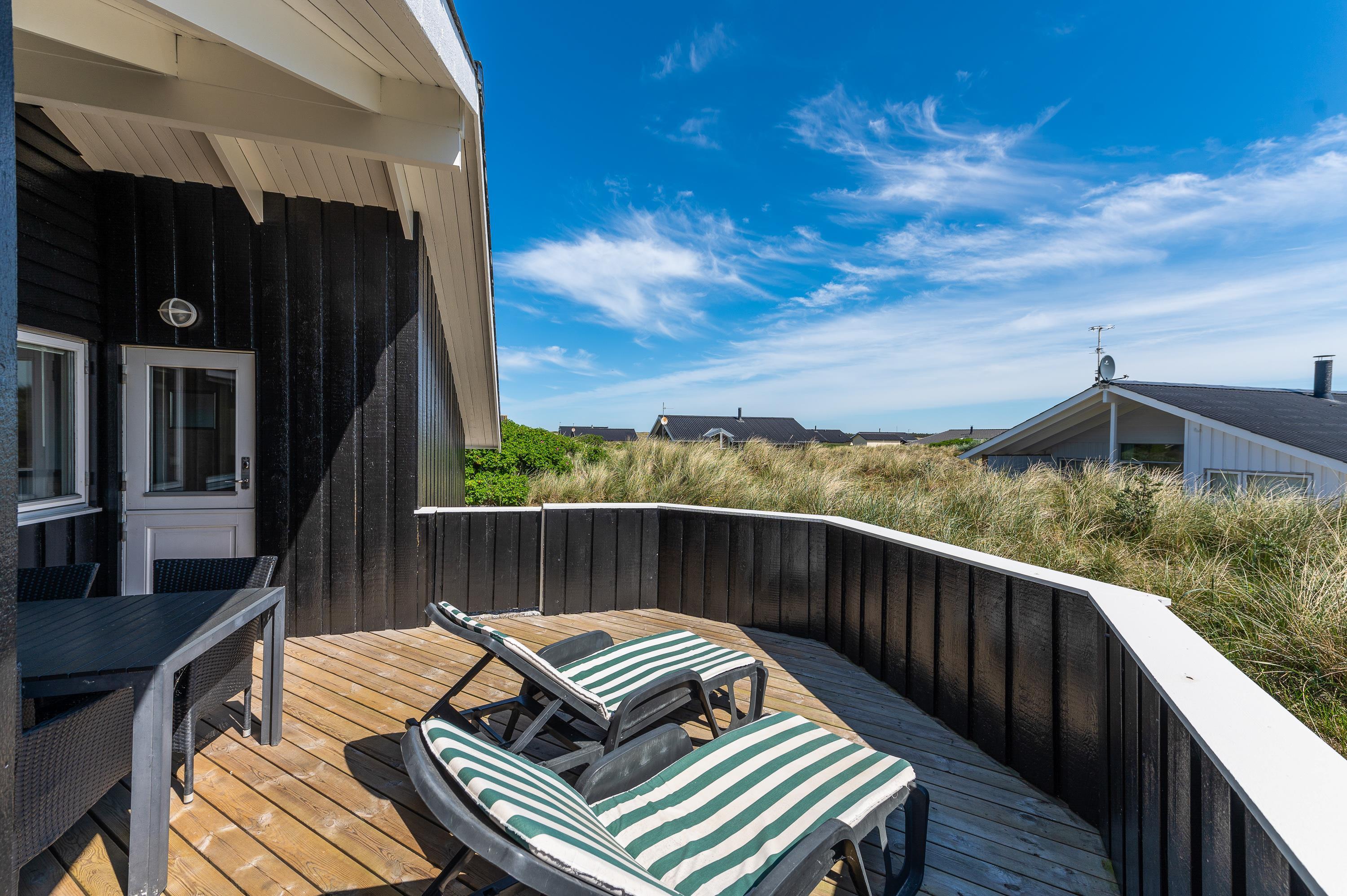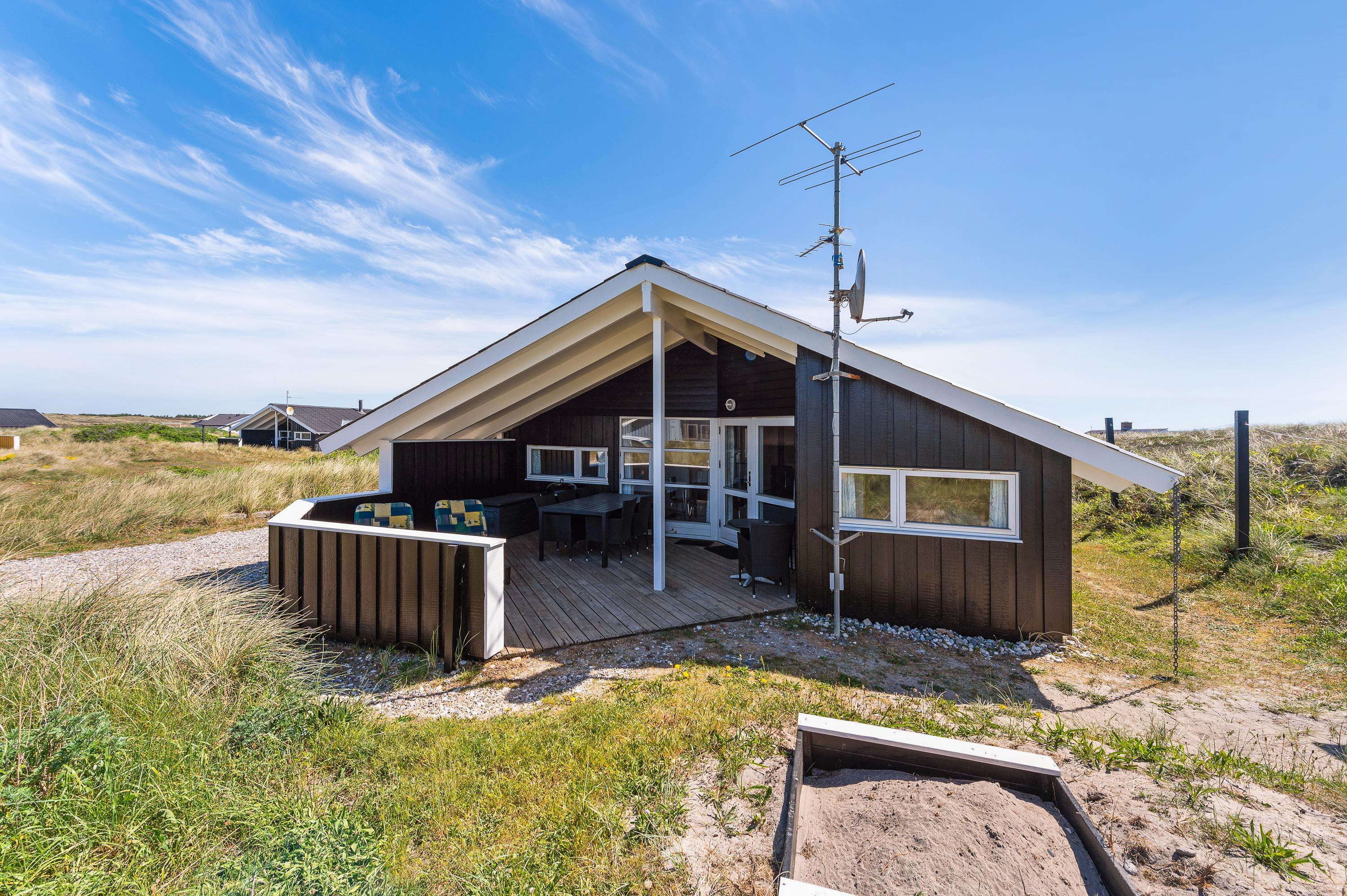 I dette hyggelige feriehus bor familien midt i den storslåede natur på Holmsland Klit kun et stenkast fra stranden med de fantastiske bademuligheder i Vesterhavet. De store fredede hedearealer giver helt sikkert lyst til en travetur med familiens hund. Den store overdækkede og afskærmede terrasse indbyder til afslapning i de gedigne havemøbler og liggestole. Her kan maden tilberedes på sommerhusets grill, mens de mindste leger med sandkasse og gynger.