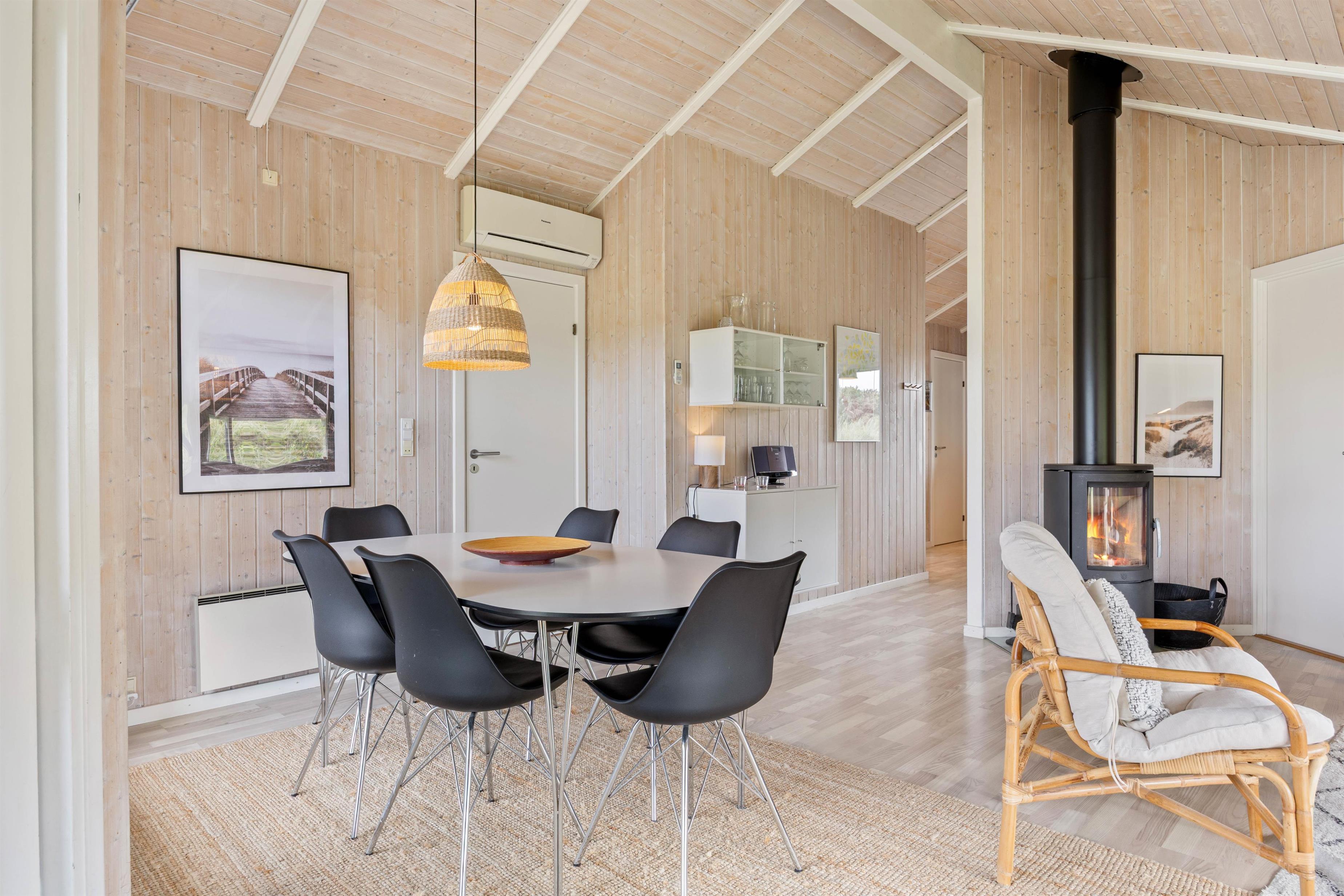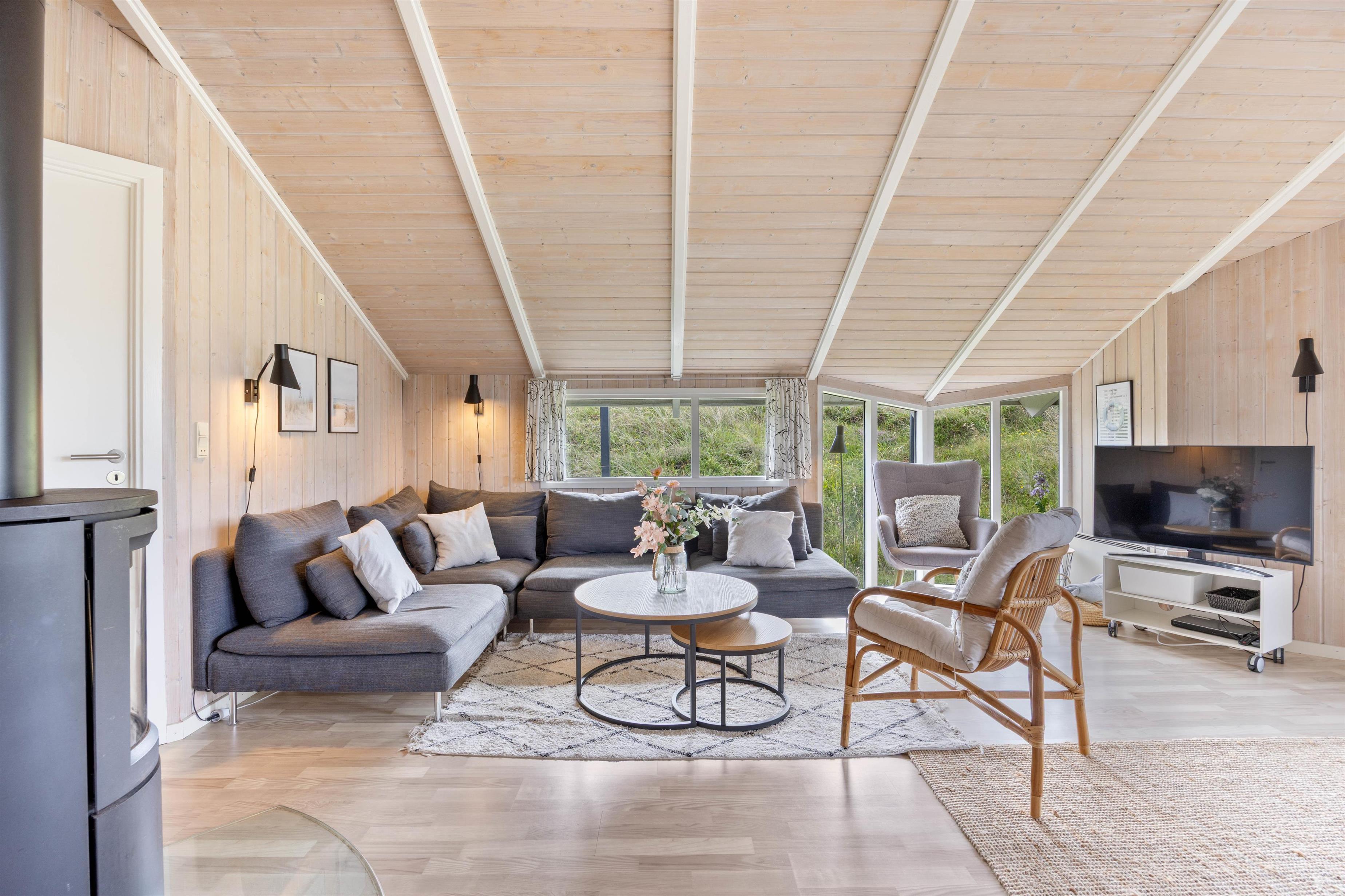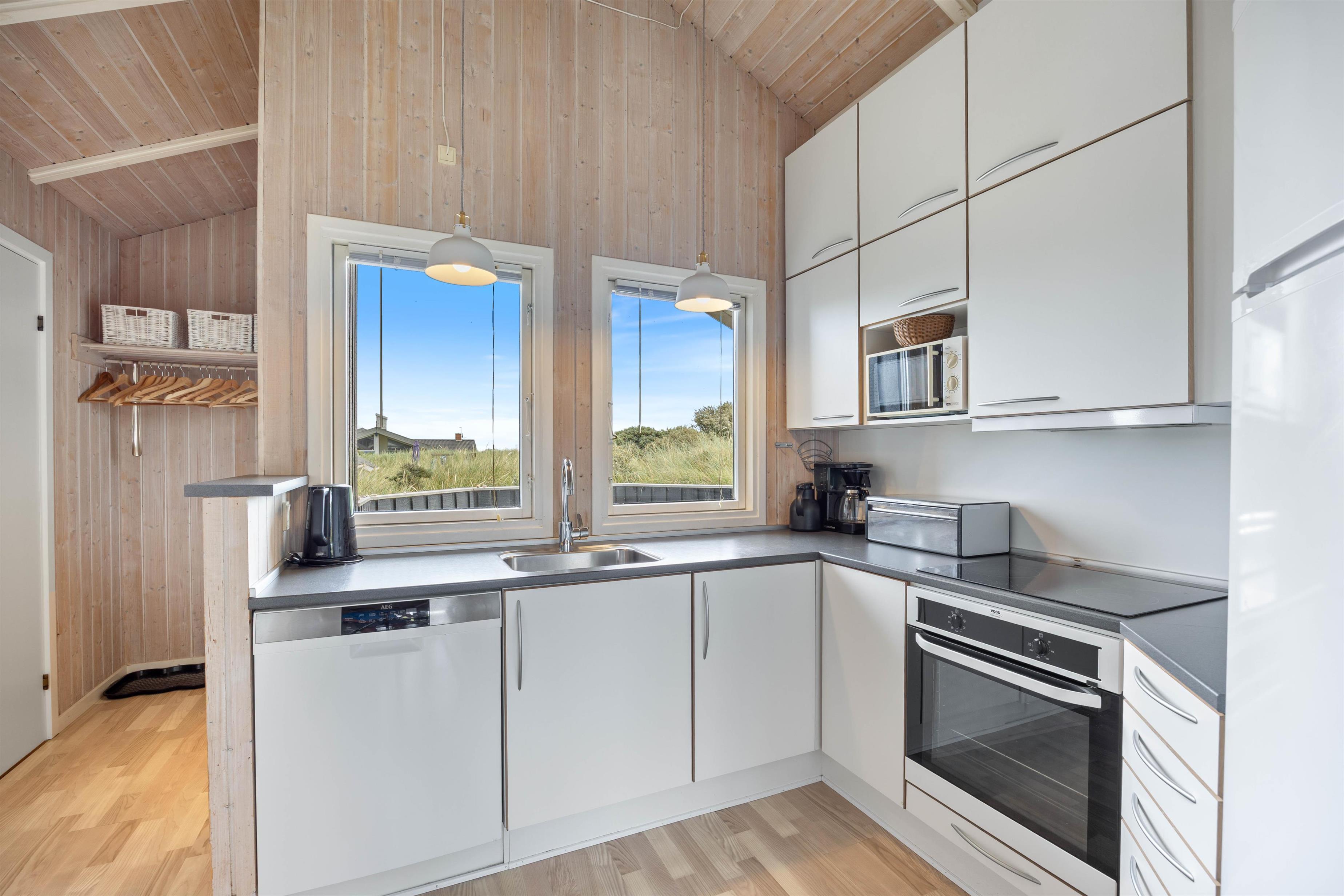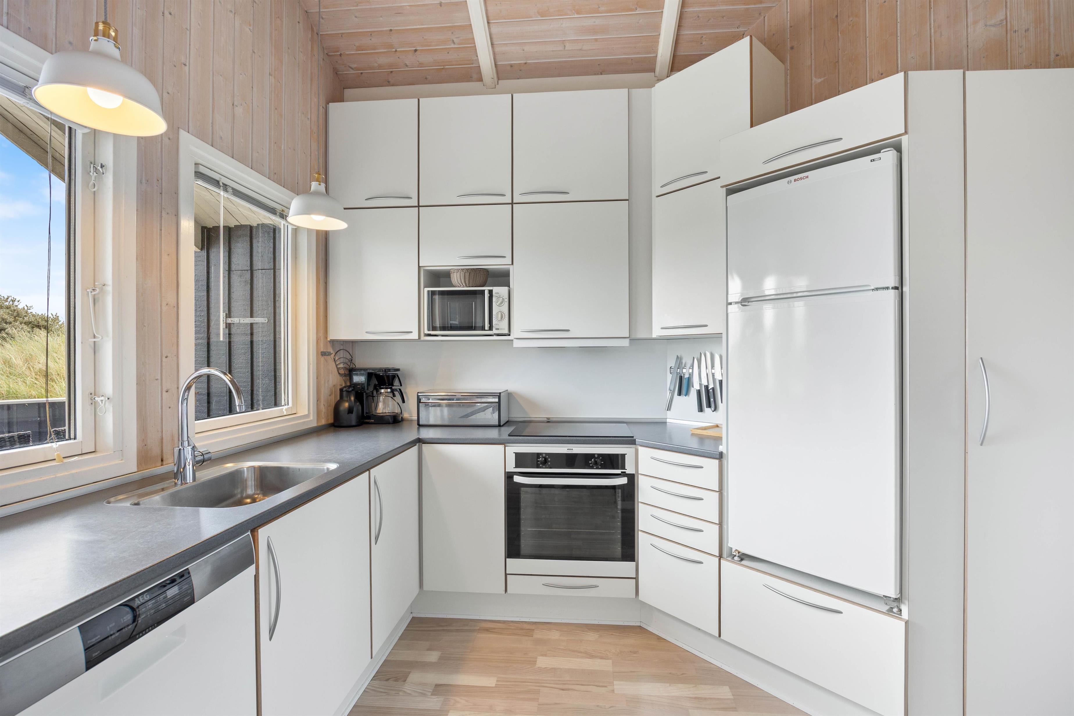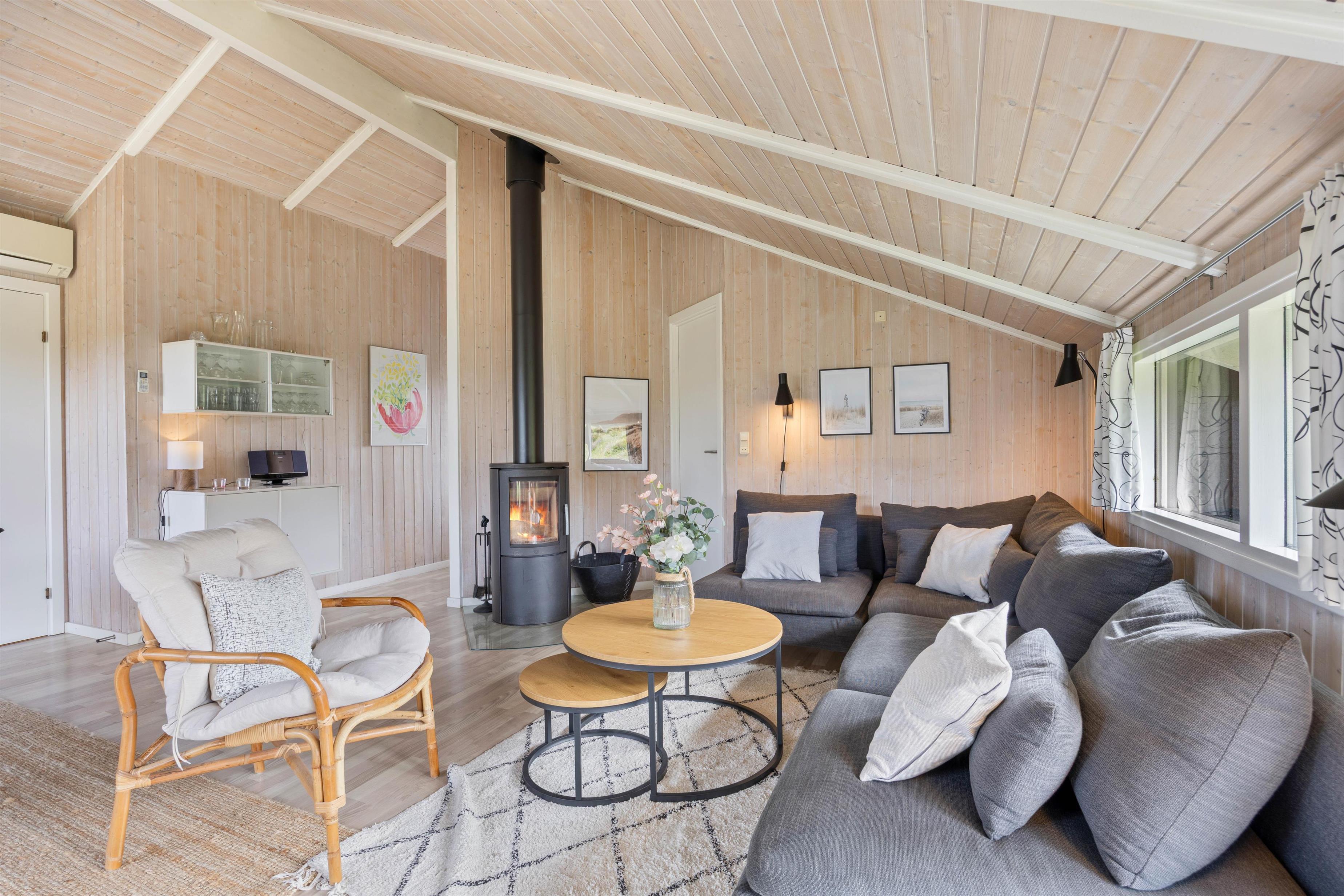 De lyse, træbeklædte lofter og vægge giver et indbydende indtryk af feriehuset, hvor køkkenet i lyse venlige farver er udstyret med køleskab, fryser(50L), mikrobølgeovn og opvaskemaskine. Stuen er indrettet med komfortable møbler i både spise- og opholdsafdeling, hvor brændeovnens flammer understreger feriens hyggestemning. Her kan også slappes af med TV, parabol, DVD og CD-radio. - I finder også et cromcast i sommerhuset, så yndlingsserien kan streames. Det trådløse internet kan benyttes gratis.