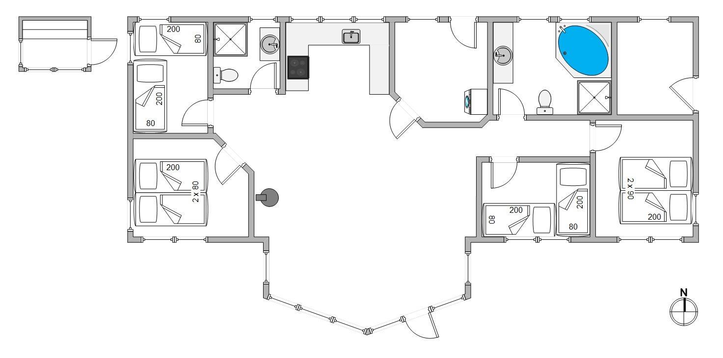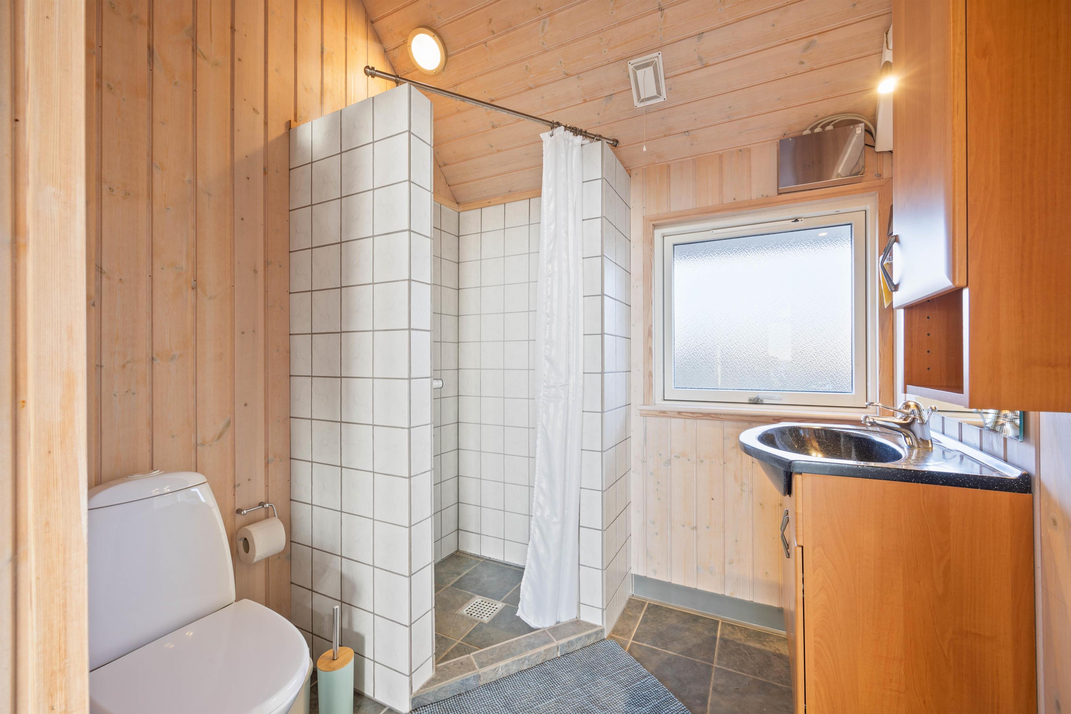 Huset er fint indrettet med 4 soverum og et badeværelse på hver side af stuen. Begge badeværelser har toilet, bruseniche og gulvvarme, hvoraf det ene badeværelse er udstyret med spa, som er perfekt til afslapning efter en lang dag i naturen. Feriehuset er derudover udstyret med både vaskemaskine, tørretumbler og opvaskemaskine, således at I altid har rent og tørt tøj, samt ikke selv behøver at stå for opvasken.