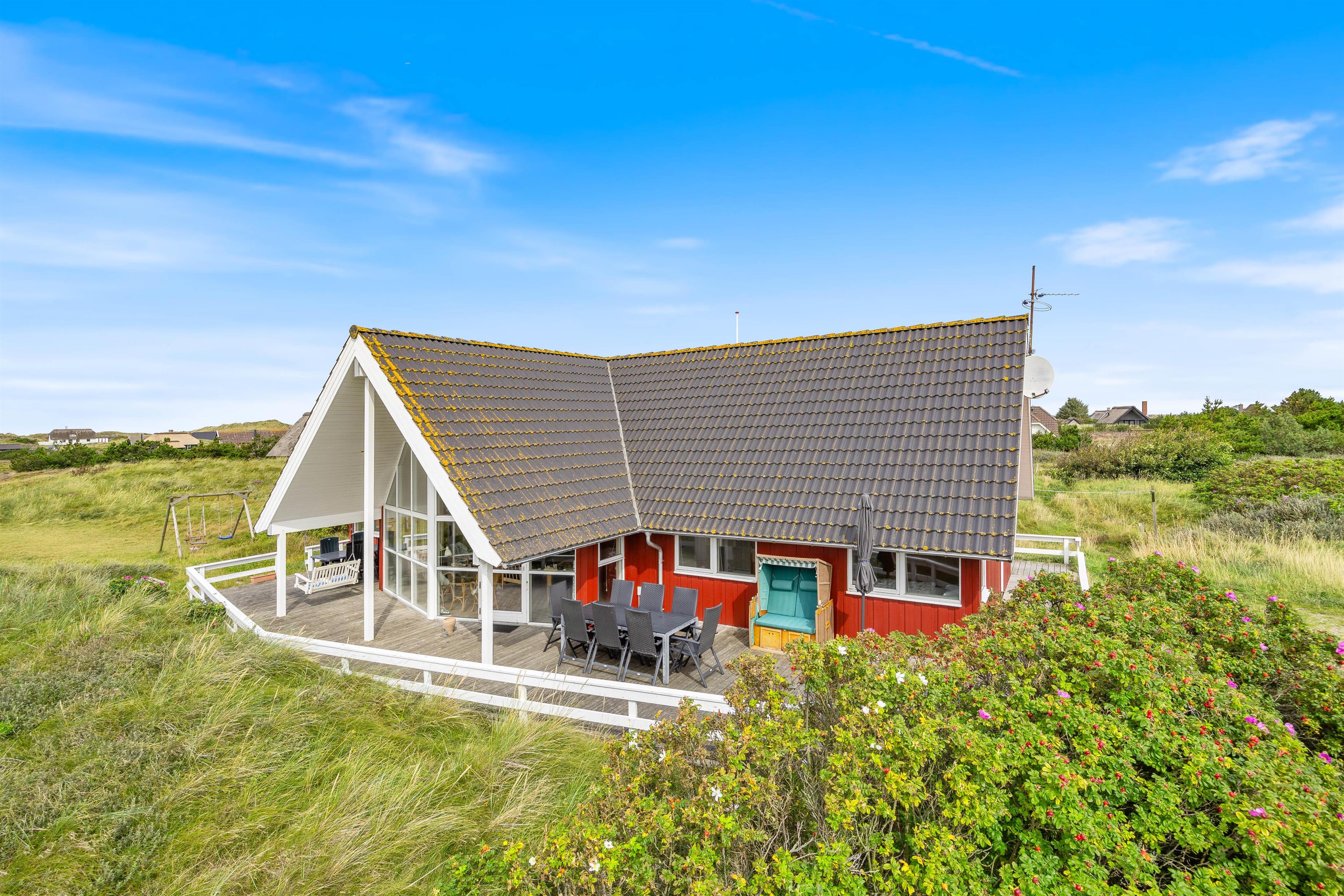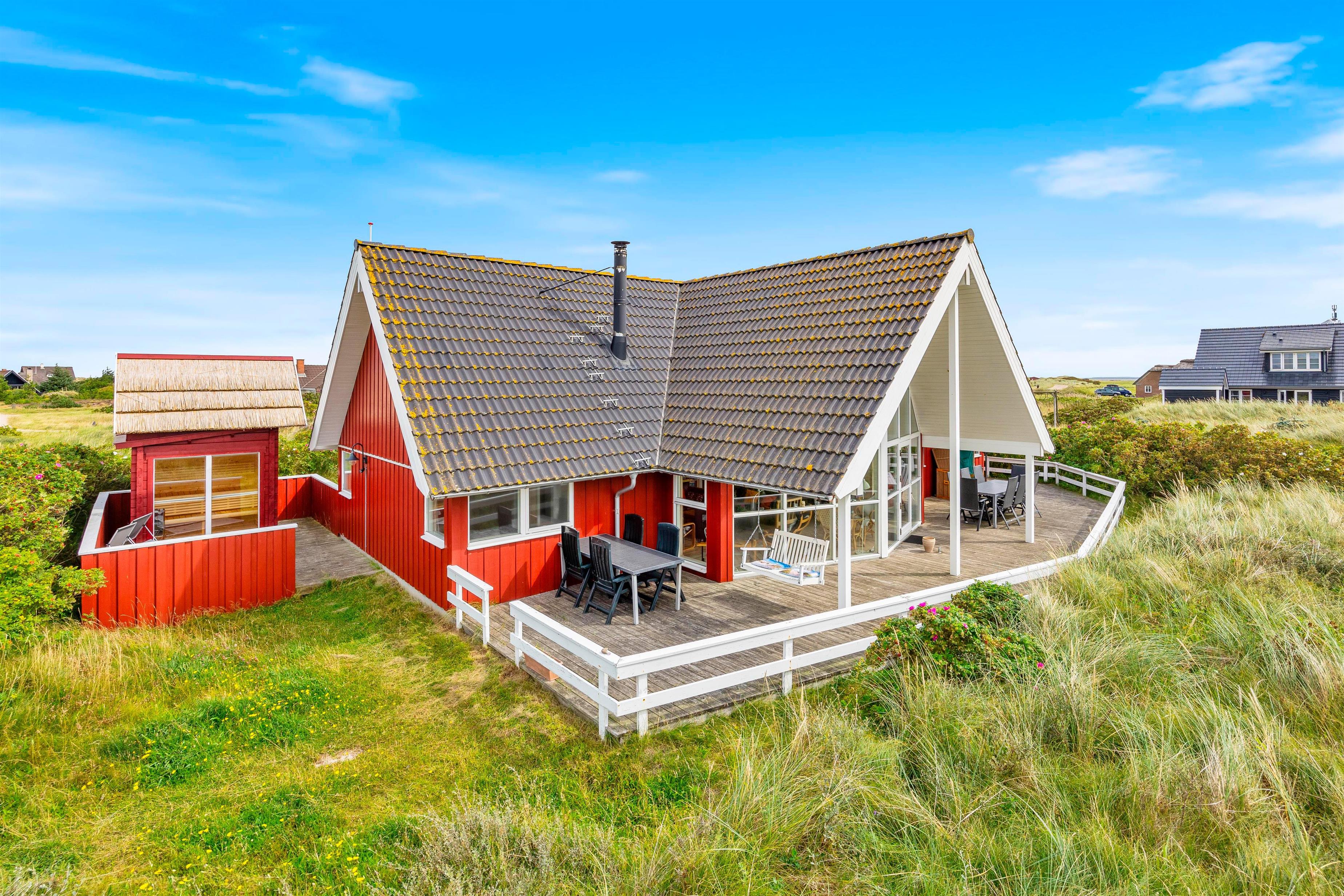 Fantastisk flot og velplejet sommerhus med smuk og rolig beliggenhed. Fra den store dejlige opholdsstue og fra soveværelserne har man en vidunderlig udsigt over det store fredede hedeareal. I huset kan der bo 8 personer og 2 hunde, hvorfor huset er idéelt for 2 små familier. Huset er beliggende på en flot naturgrund og har en udesauna, hvor man kan dampe af og få varmen efter en forfriskende dukkert i det brusende Vesterhav.