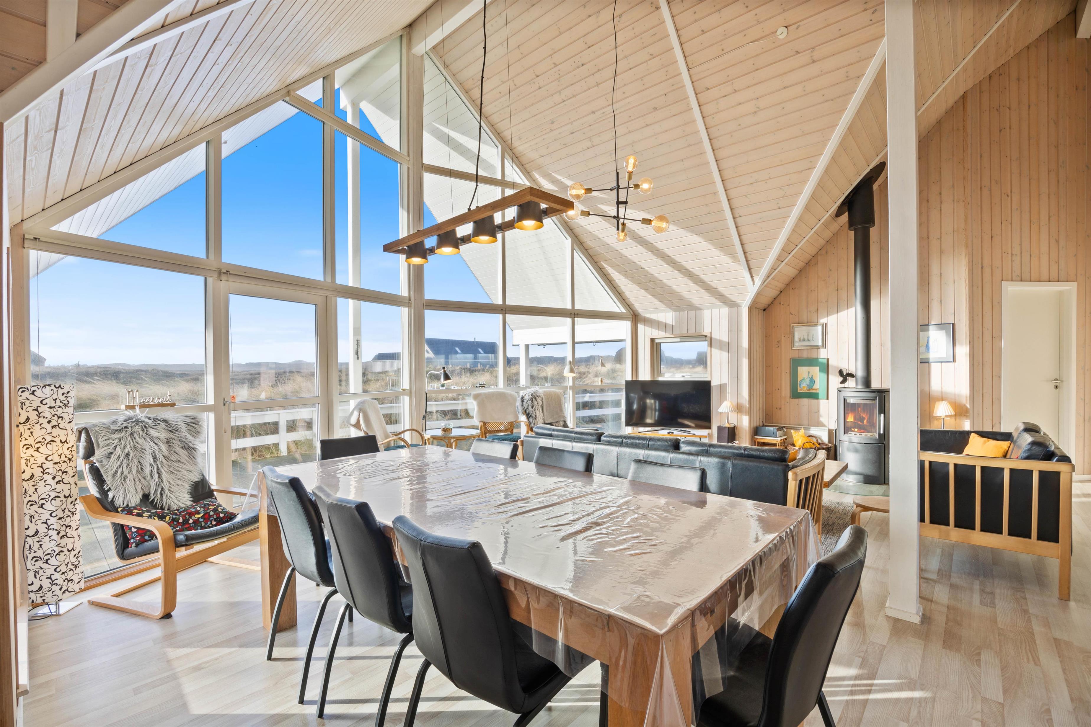 Fra den store stue og fra den sydvendte terrasse kan du nyde den smukke udsigt over heden til klitterne. Husets centrum; det store opholdsrum og stue er udstyret med fladskærm, store vinduespartier og er åbent til kip. Det giver et skønt rum, hvor naturen er en uundgåelig del af oplevelsen. Her kan I tænde op i brændeovnen og nyde hinandens samvær.