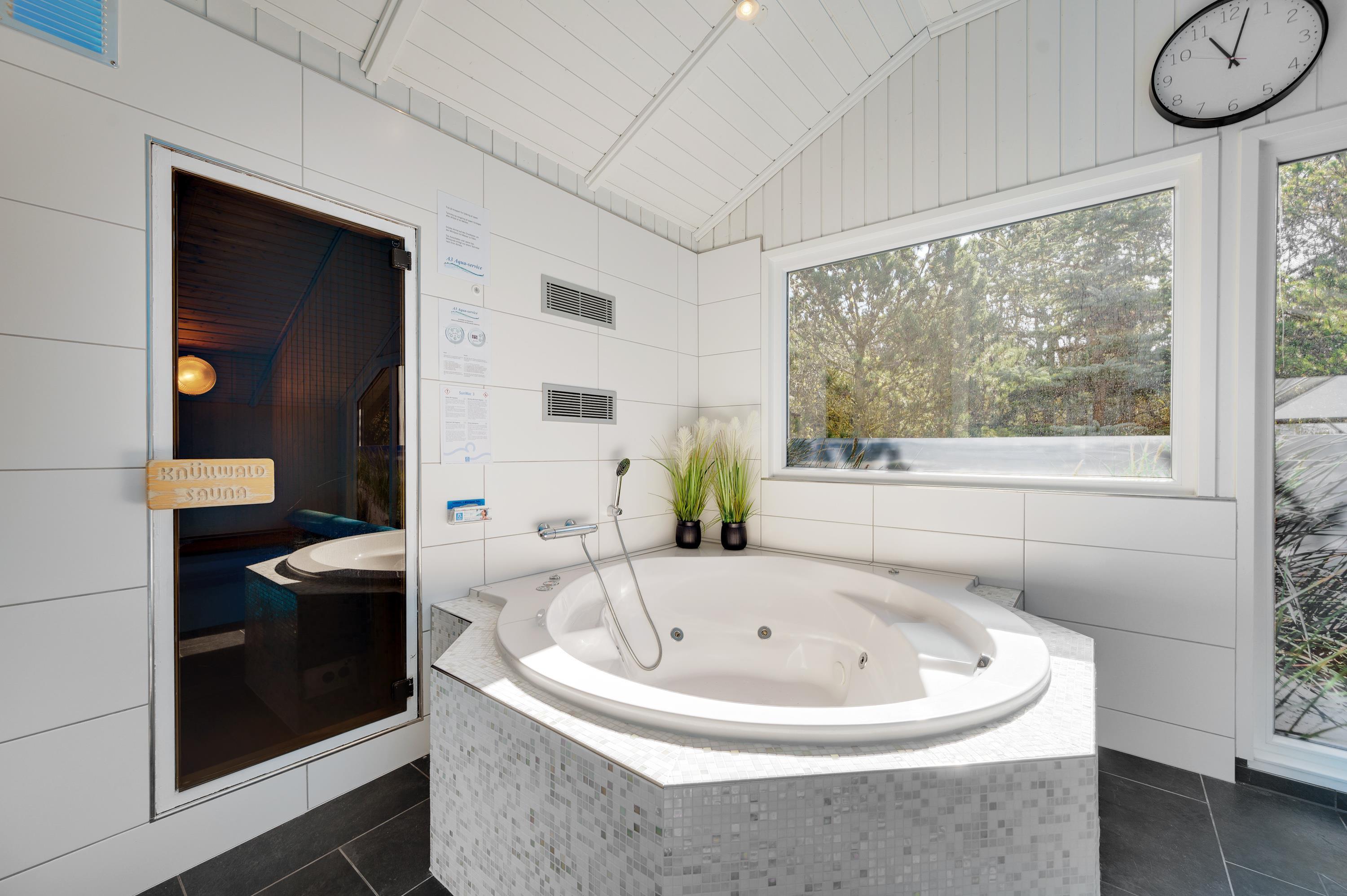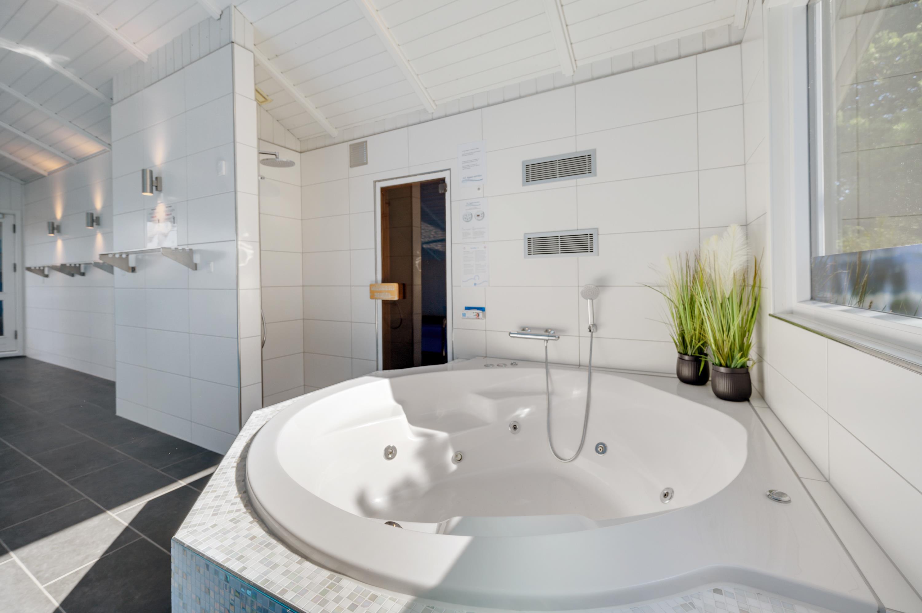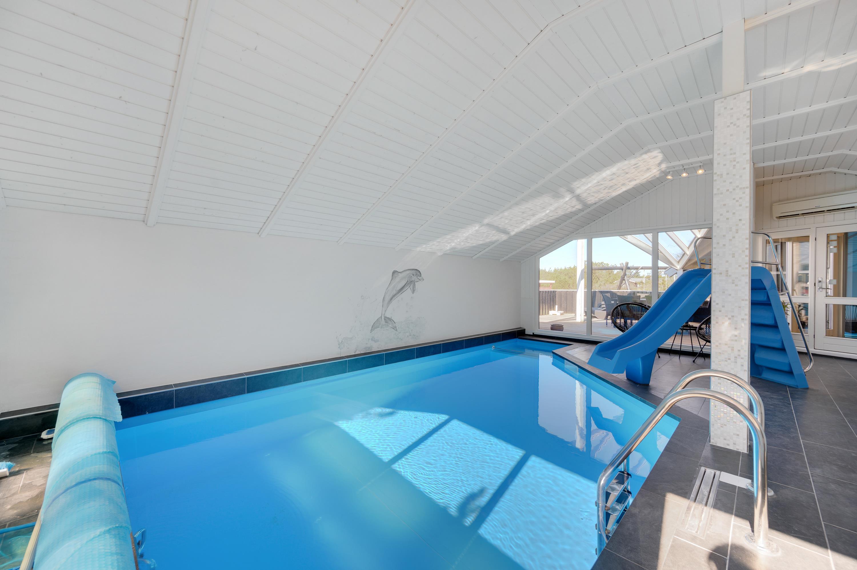 Feriehuset til 9 personer er indrettet med en dejlig poolafdeling med rutsjebane, der indbyder til sjov og leg for hele familien. Børnene vil med sikkerhed elske at boltre sig i swimmingpoolen og spaens varme bobler, mens de voksne sikkert vil nyde at slappe af i spaen og saunaen om aftenen.