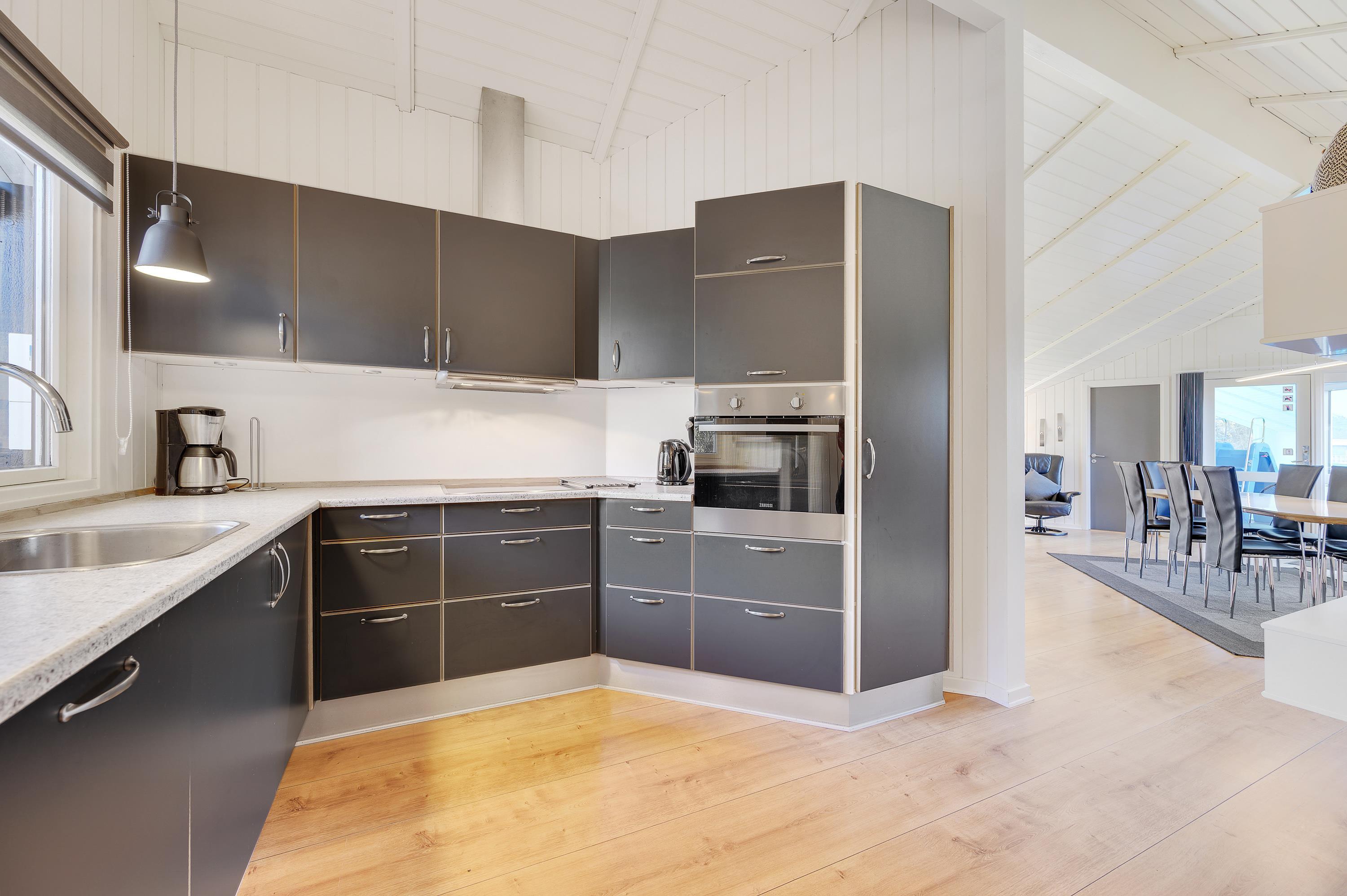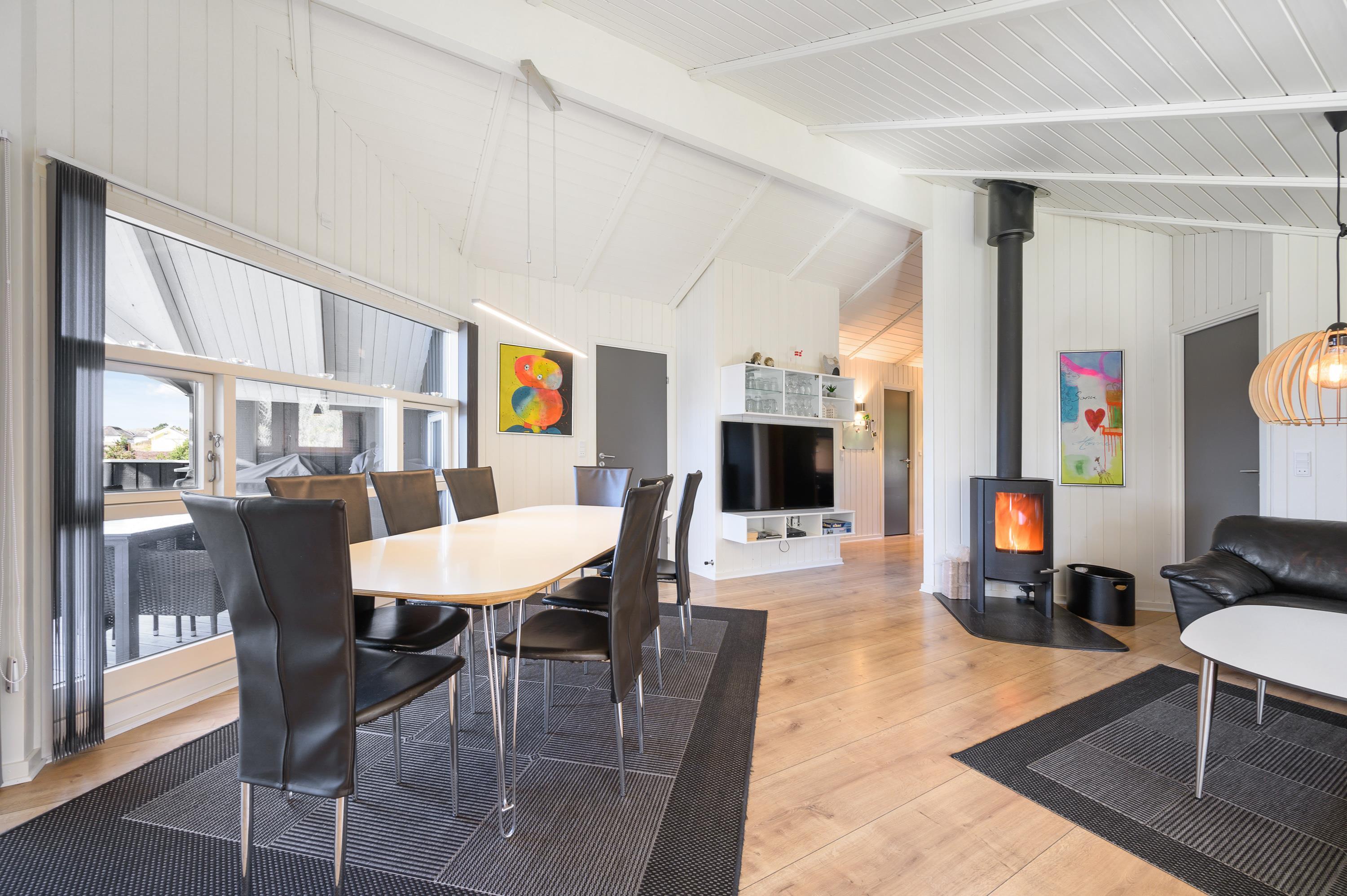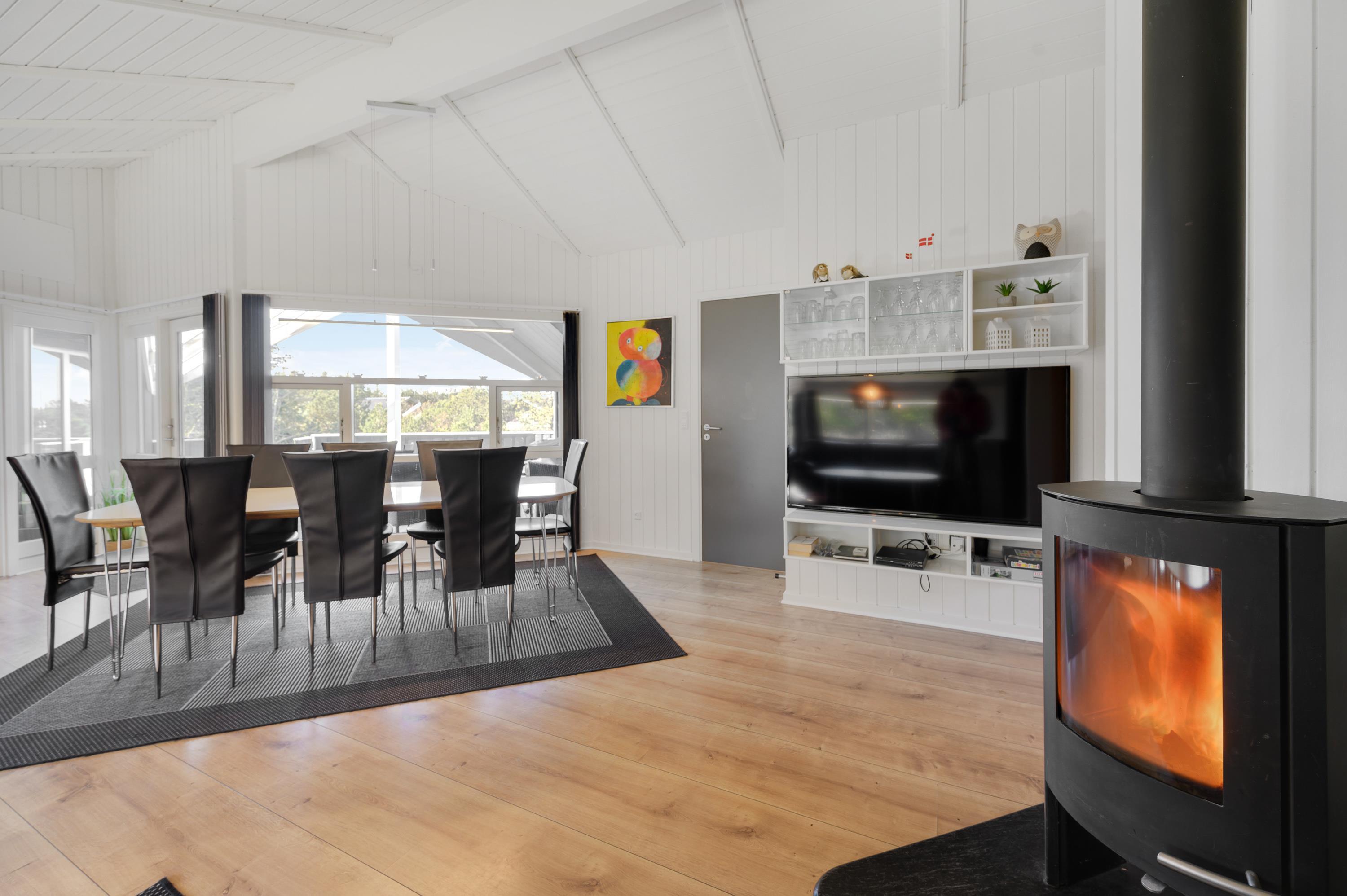 Resten af feriehuset er rummeligt og indbydende indrettet, så I sammen kan hygge jer med at lave mad, spille spil eller bare slappe af. Opholsrummet er indrettet med en fin brændeovn, som spreder varme og ekstra hygge til jeres ferie. Her er også en varmepumpe, som I med fordel kan bruge.