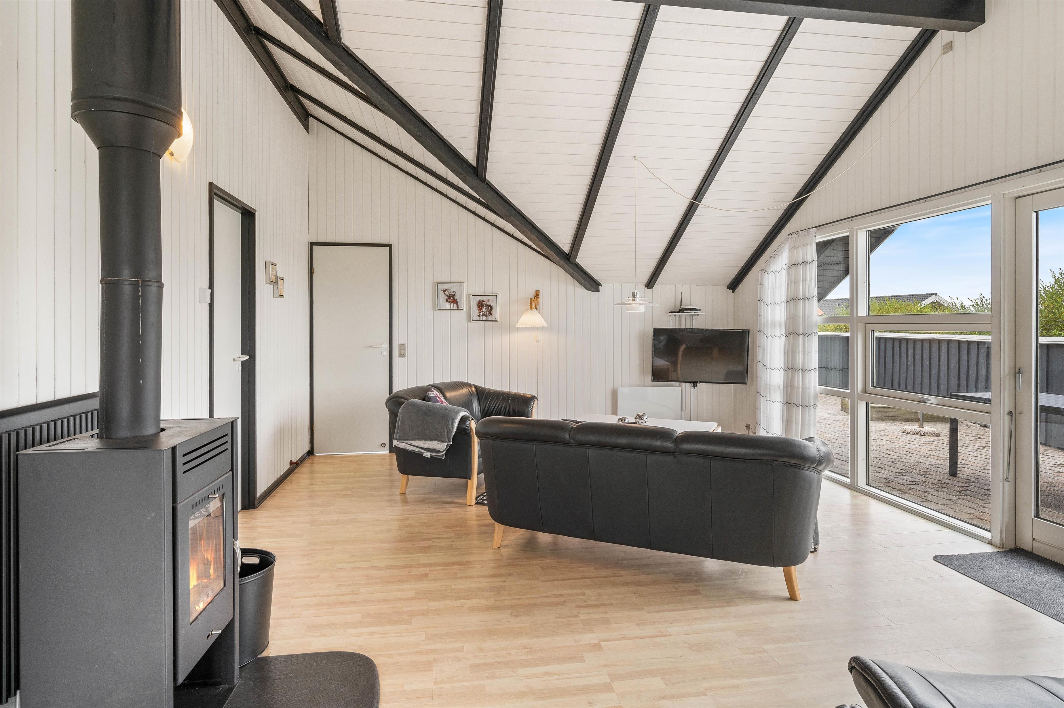 Opholdsområdet udgør sommerhusets hyggelige hjerte. Her skaber brændeovnen især på kølige dage en behagelig stemning, mens I slapper af på sofaen og nyder dagen. Den åbne planløsning giver et dejligt rummeligt indtryk, hvor køkken og opholdsrum smelter sammen.