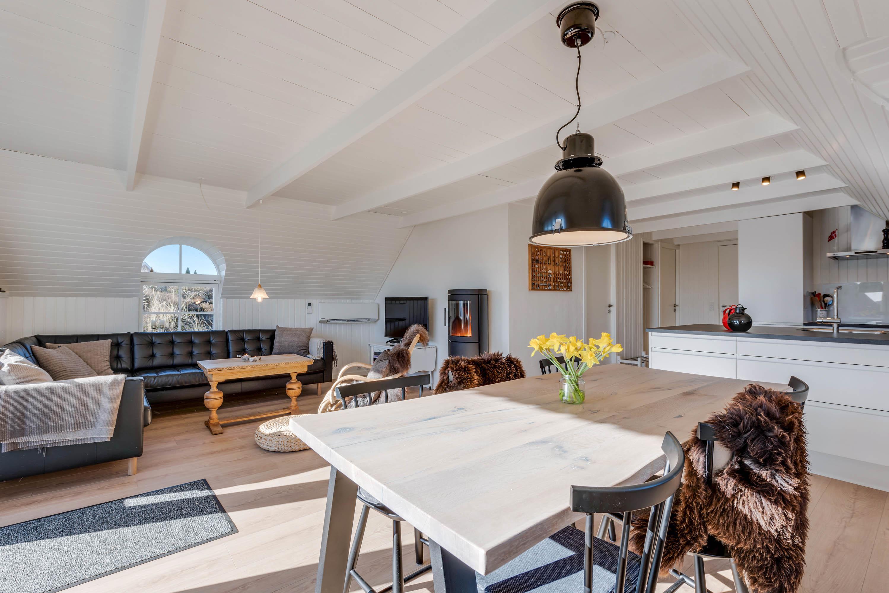 Opholdsstuen ligger i åben forbindelse med køkkenalrummet. Det dejlige køkken byder på moderne faciliteter som opvaskemaskine, mikroovn og induktionskomfur, der tilgodeser familiens kok. Mens der kokkereres i køkkenet, kan der hygges med resten af familien, der spiller spil ved det flotte spisebord.