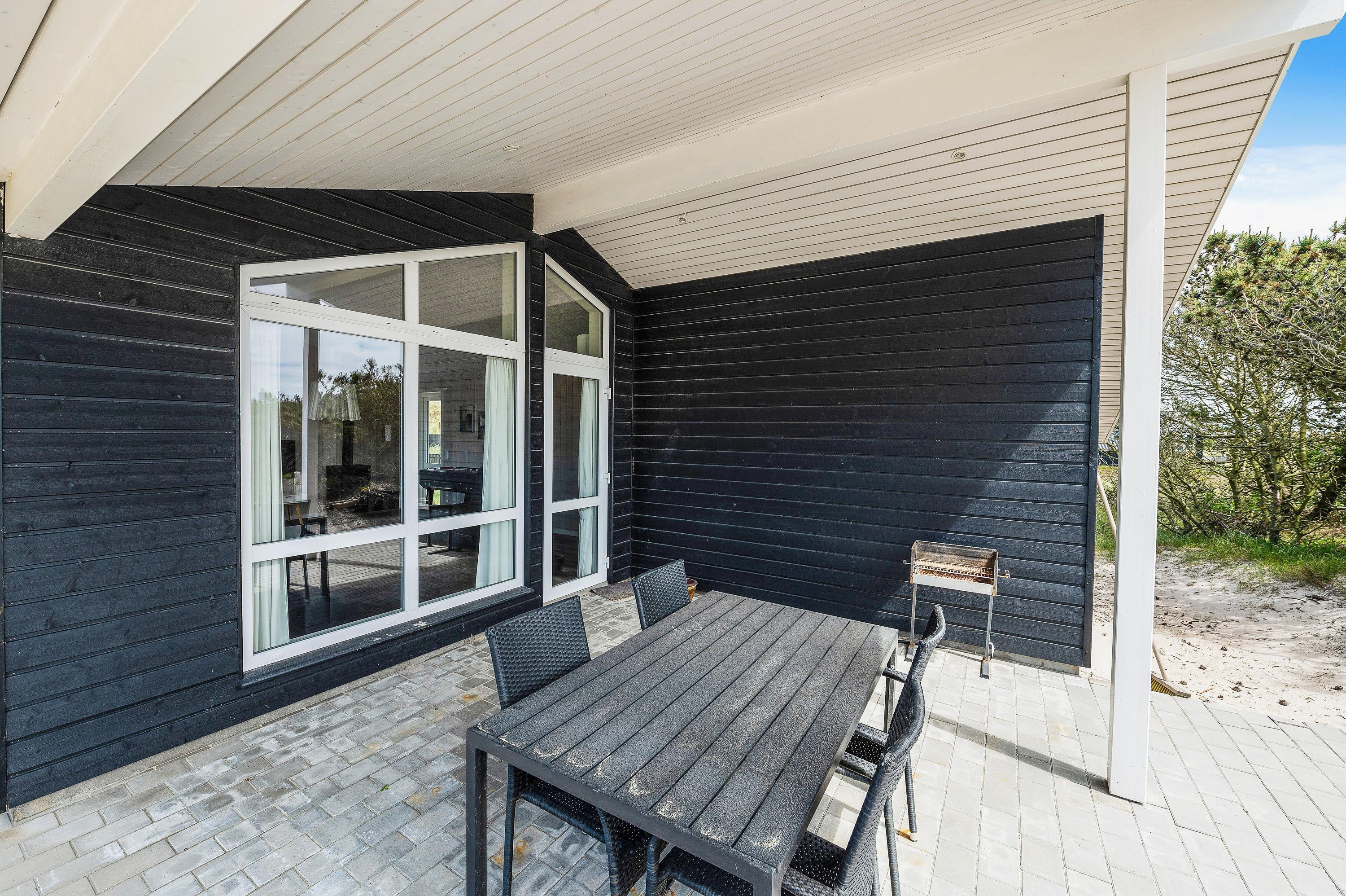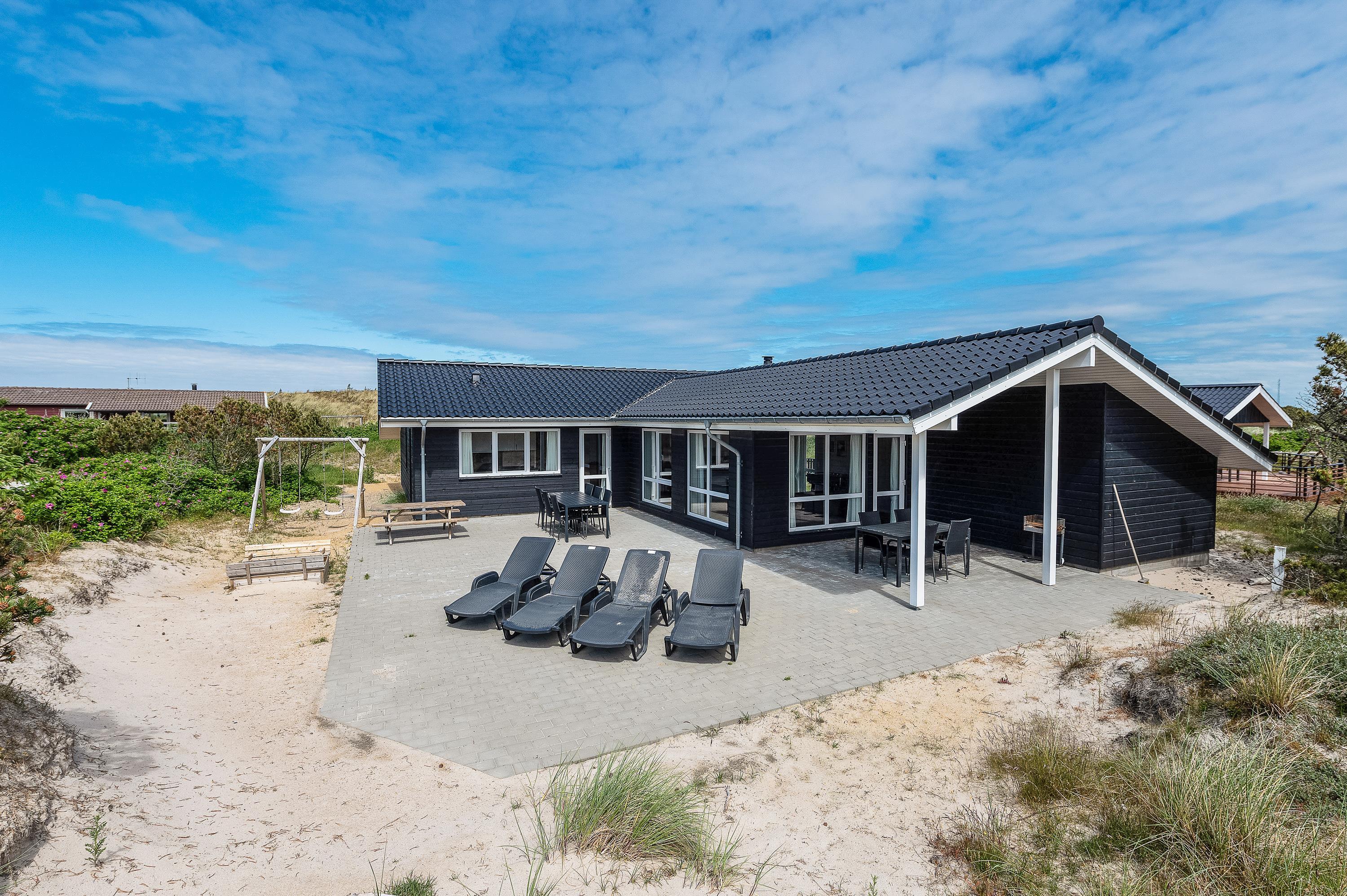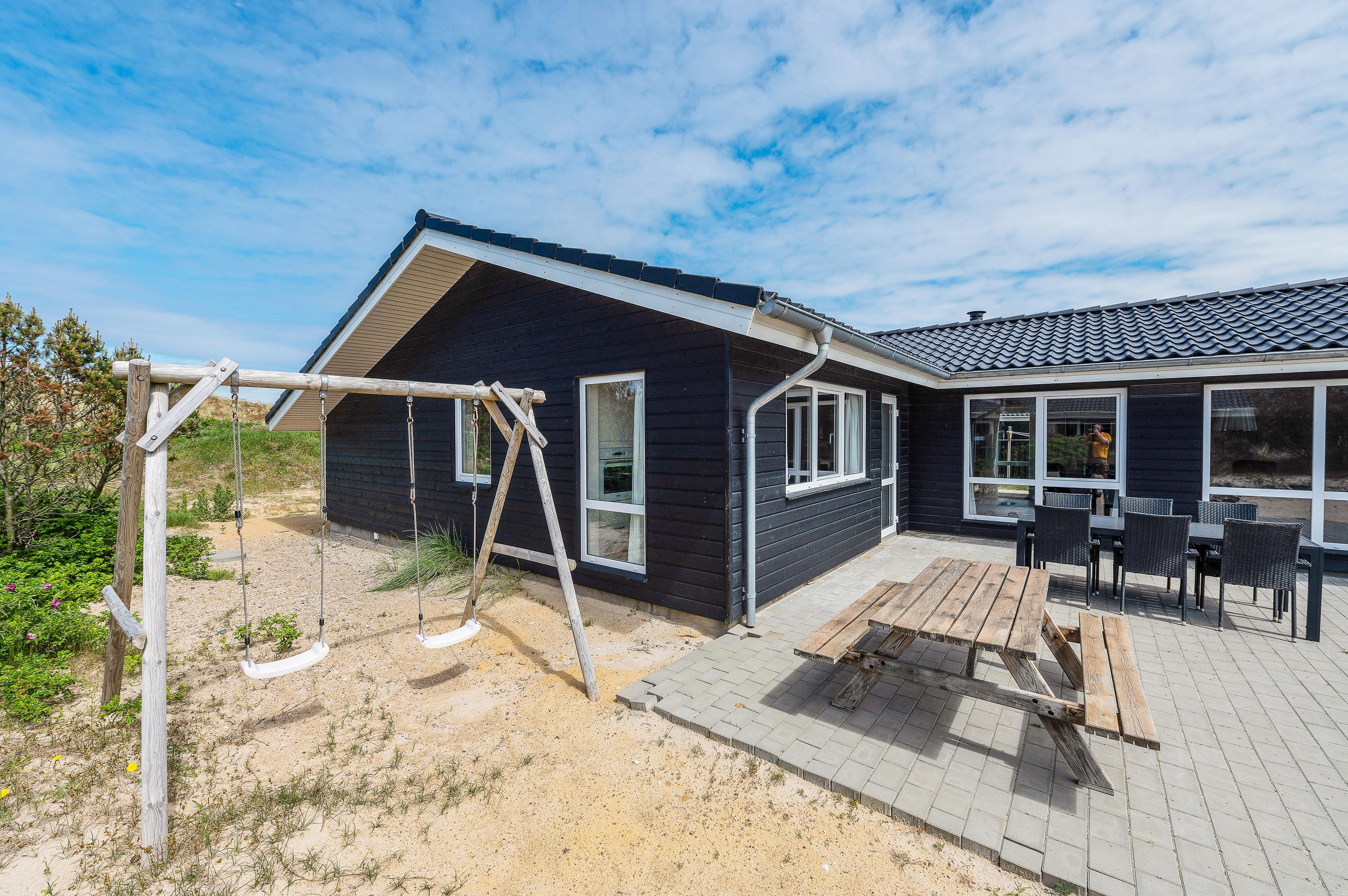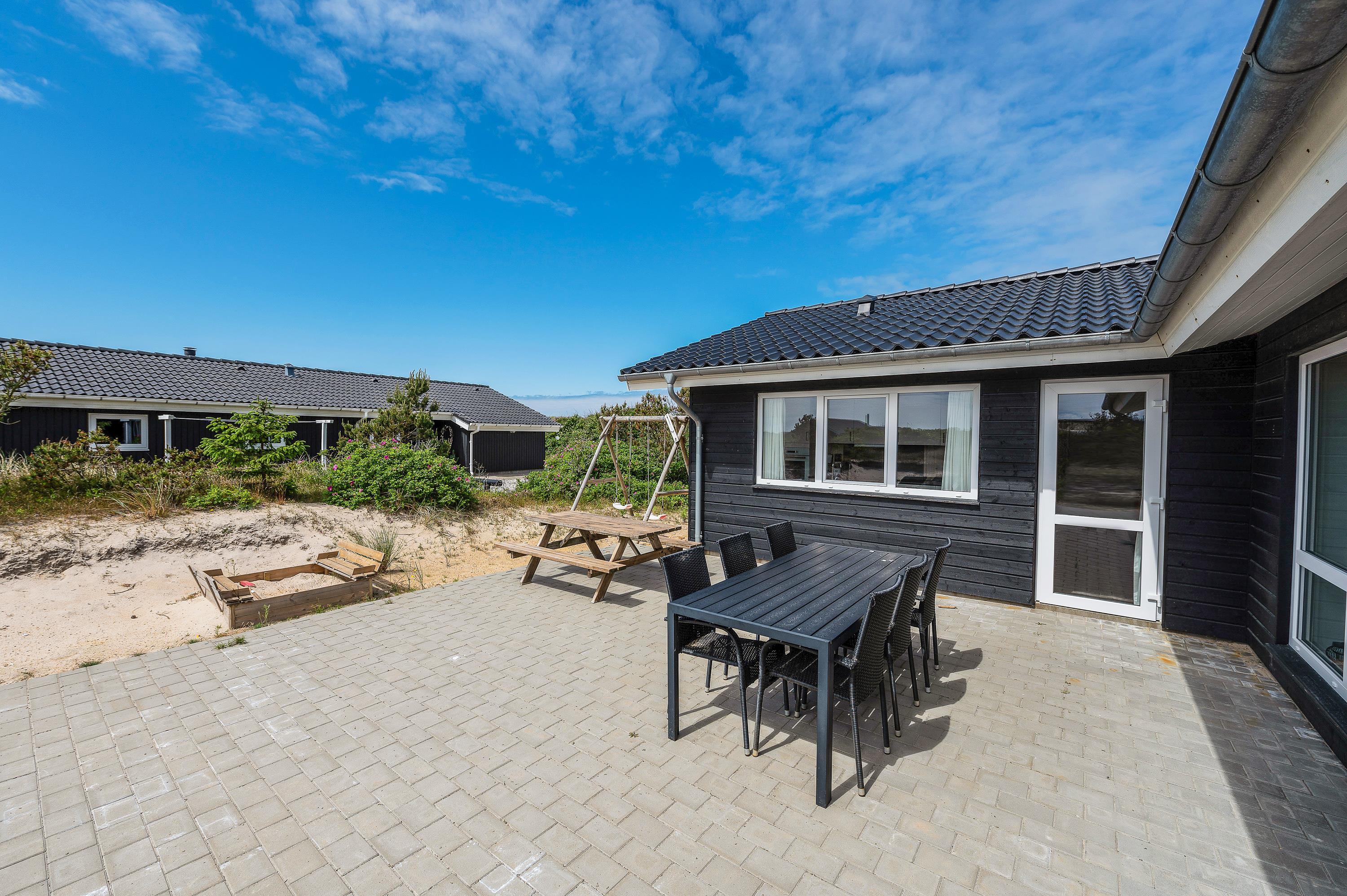 Omkring feriehuset på Julianevej 21 er der to flisebelagt terrasser, og der er rig mulighed for at finde både sol og skygge. Den overdækkede del af terrassen gør det muligt at bruge grillen en stor del af året, og det er også hertil I kan trække jer tilbage, når duggen falder på de lange og lyse sommeraftner. Mens bøfferne bliver færdige på grillen, kan børnene hygge sig med gynger og sandkasse.