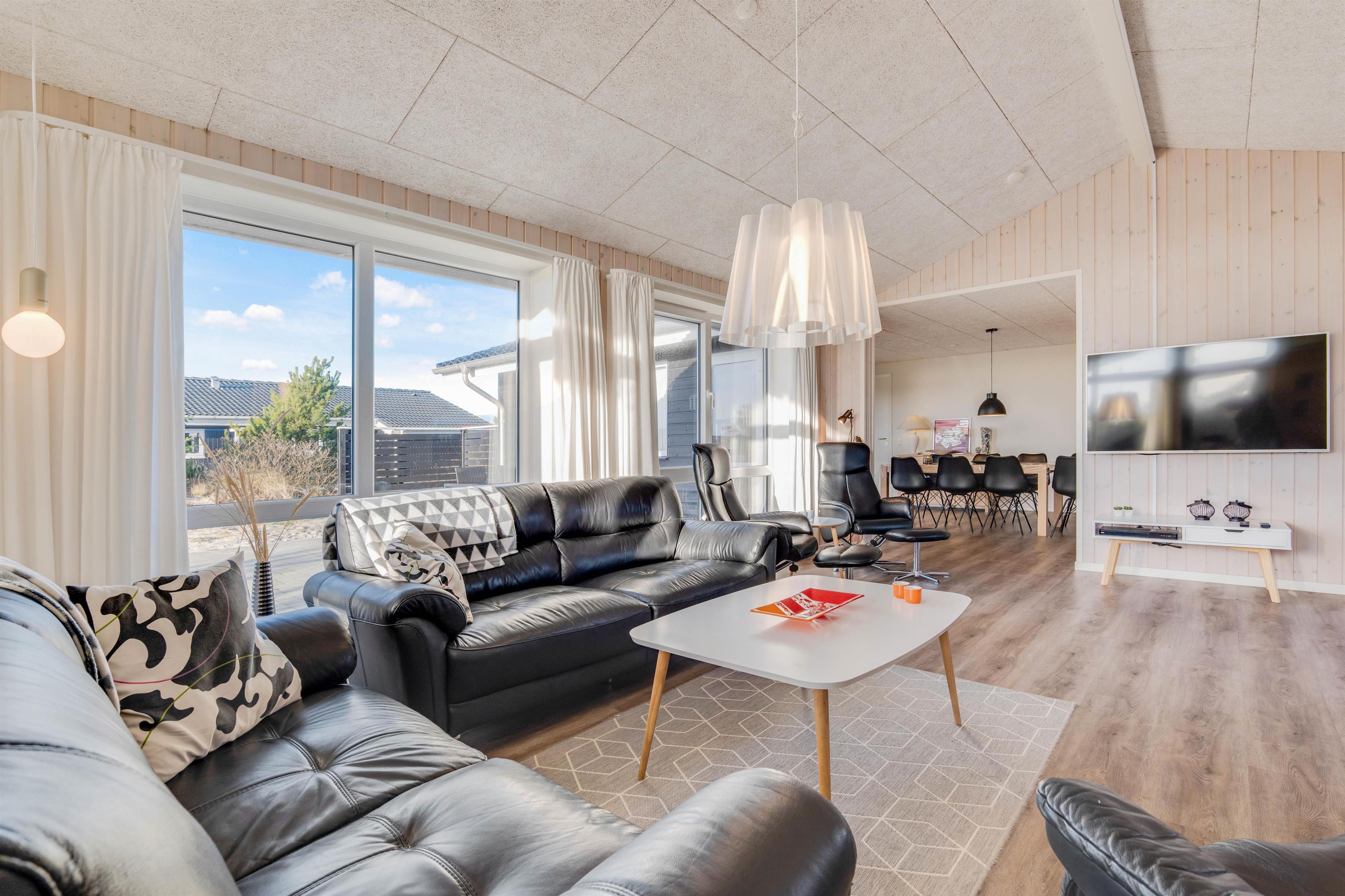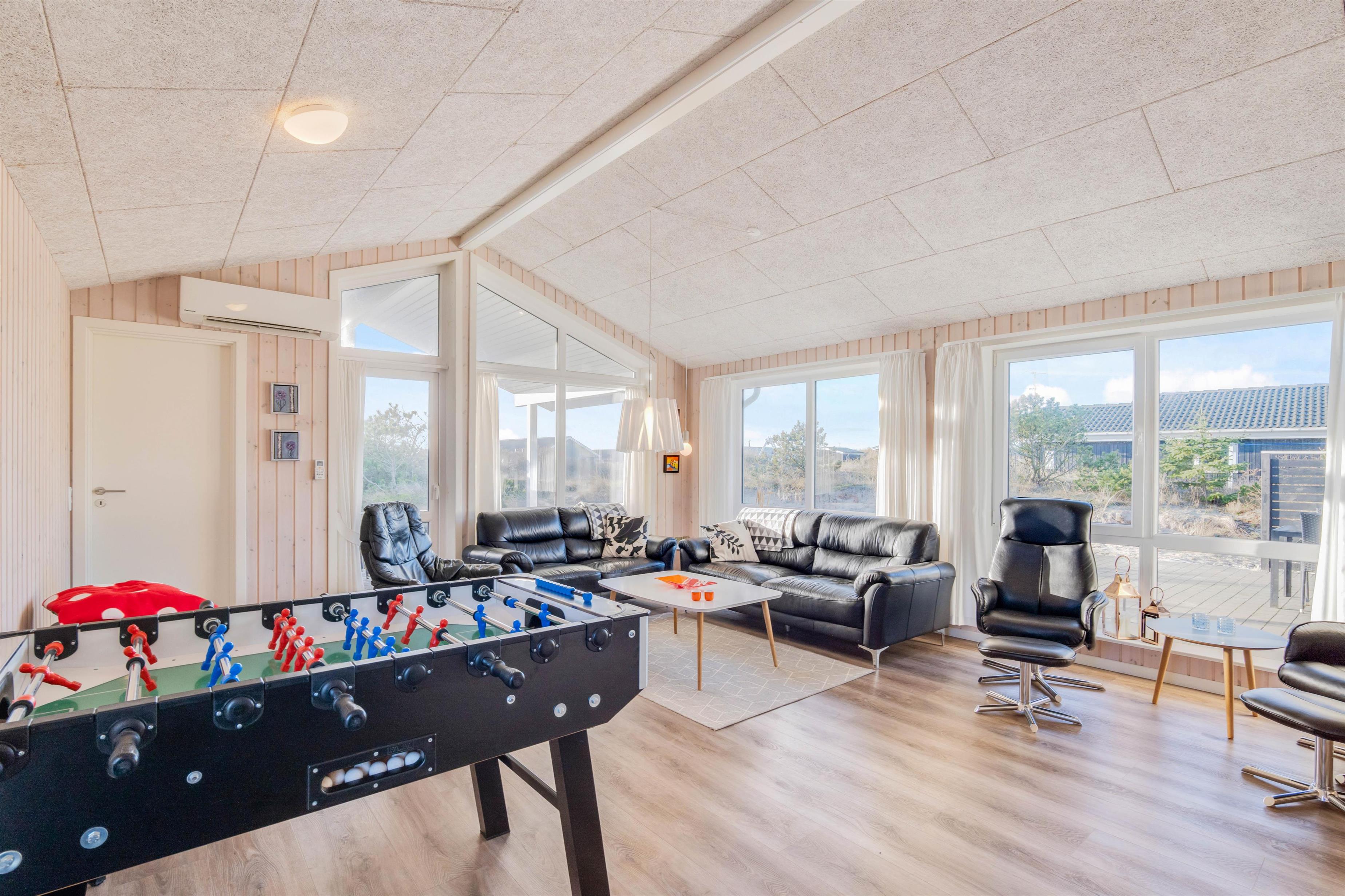 I både køkken og stue står sommerhusets gennemgående mørkere gulve i flot kontrast til de lyse vægge og hvide lofter. Ud ad de store vinduer i stuen, der giver et flot lysindfald, kan den smukke natur nydes i fulde drag, mens der slappes af i de lækre lædermøbler og børnene dyster i bordfodbold. Det hyggelige skær og den knitrende lyd fra brændeovnen fuldender scenariet for en hyggelig aften, og på de kølige dage og aftner sørger varmepumpen for en behagelig temperatur døgnet rundt.
