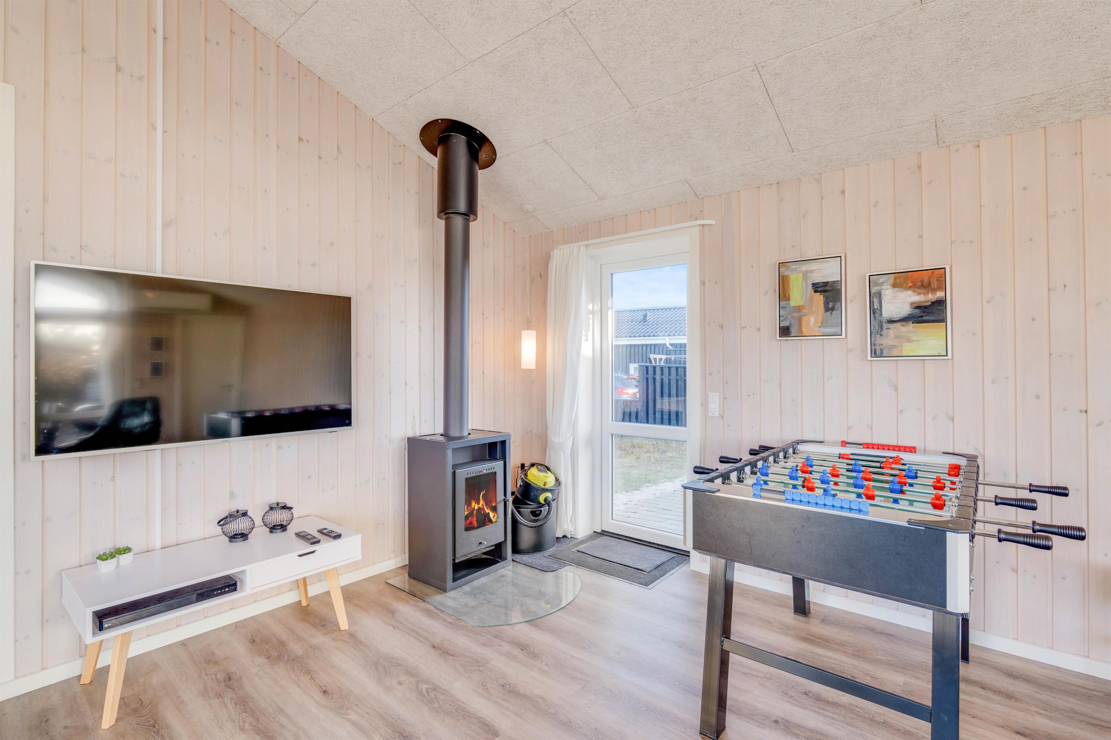 Flot og hyggelig stue med brændeovn – bordfodbold til de aktive
