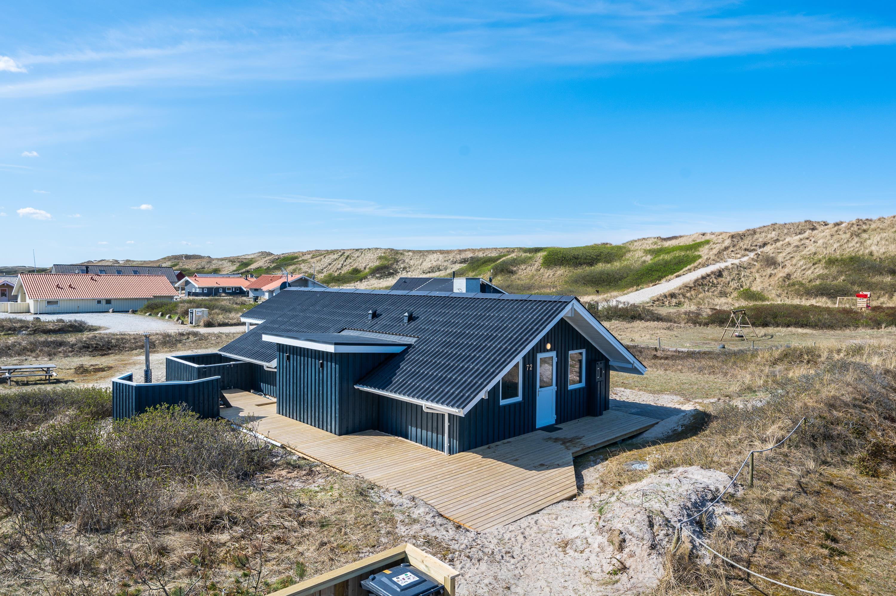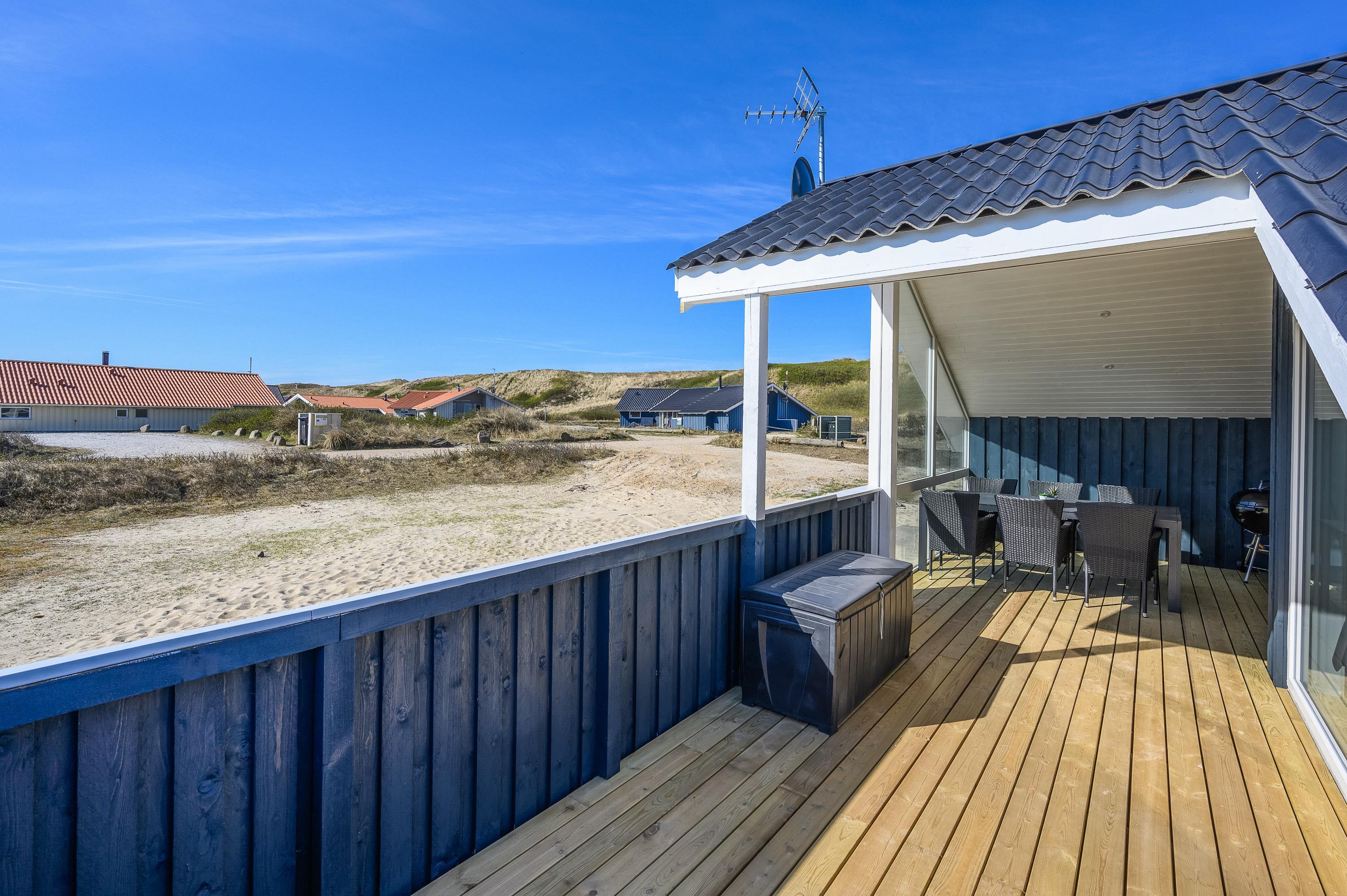 En stor terrasse omgiver feriehuset, og mod vest er der en læfyldt, overdækket del. Her kan I sidde udenfor og nyde udsigten til klitlandskabet i al slags vejr. Terrassen gemmer også på et ekstra feriehighlight i form af vildmarksbadet.