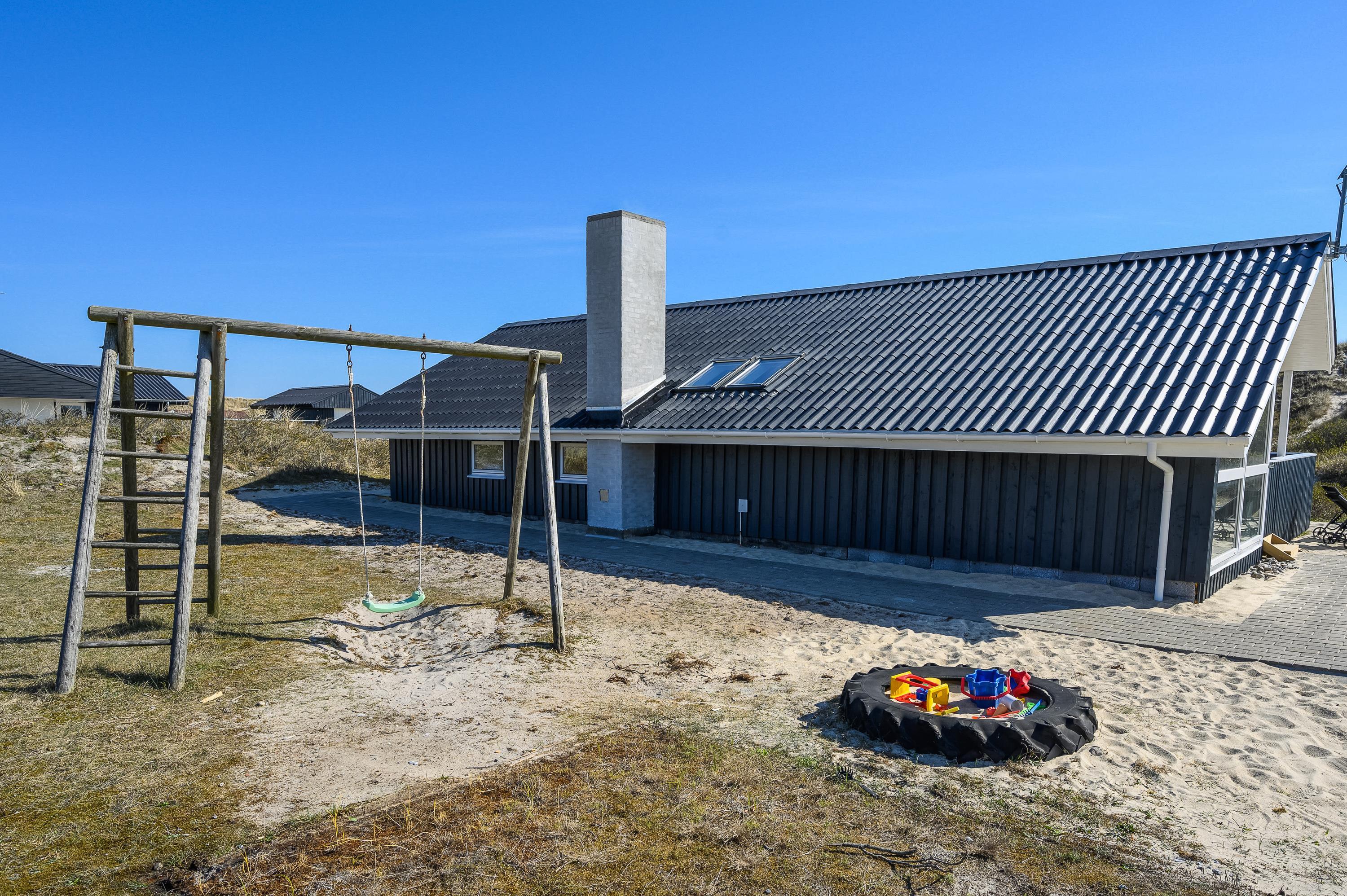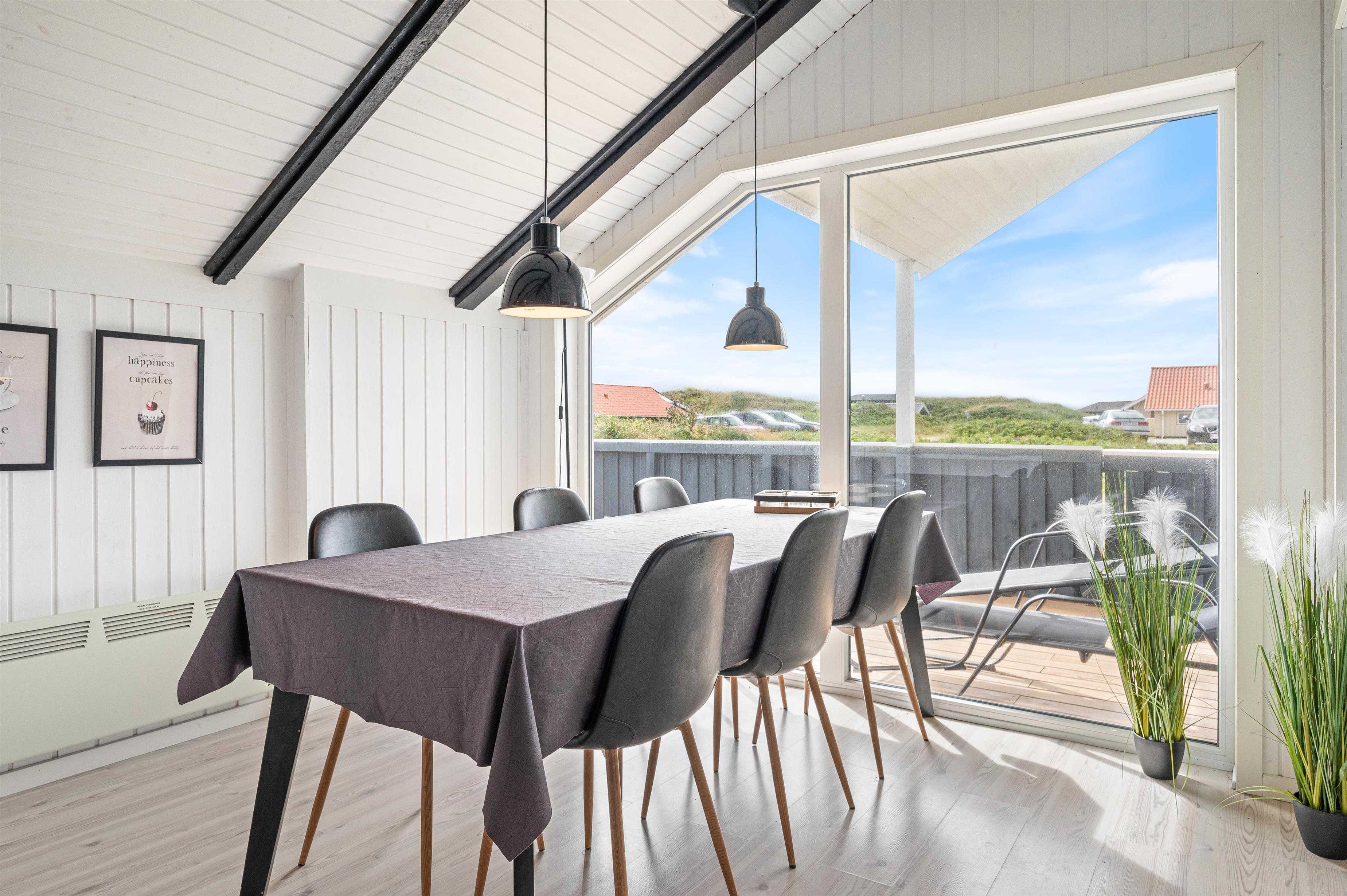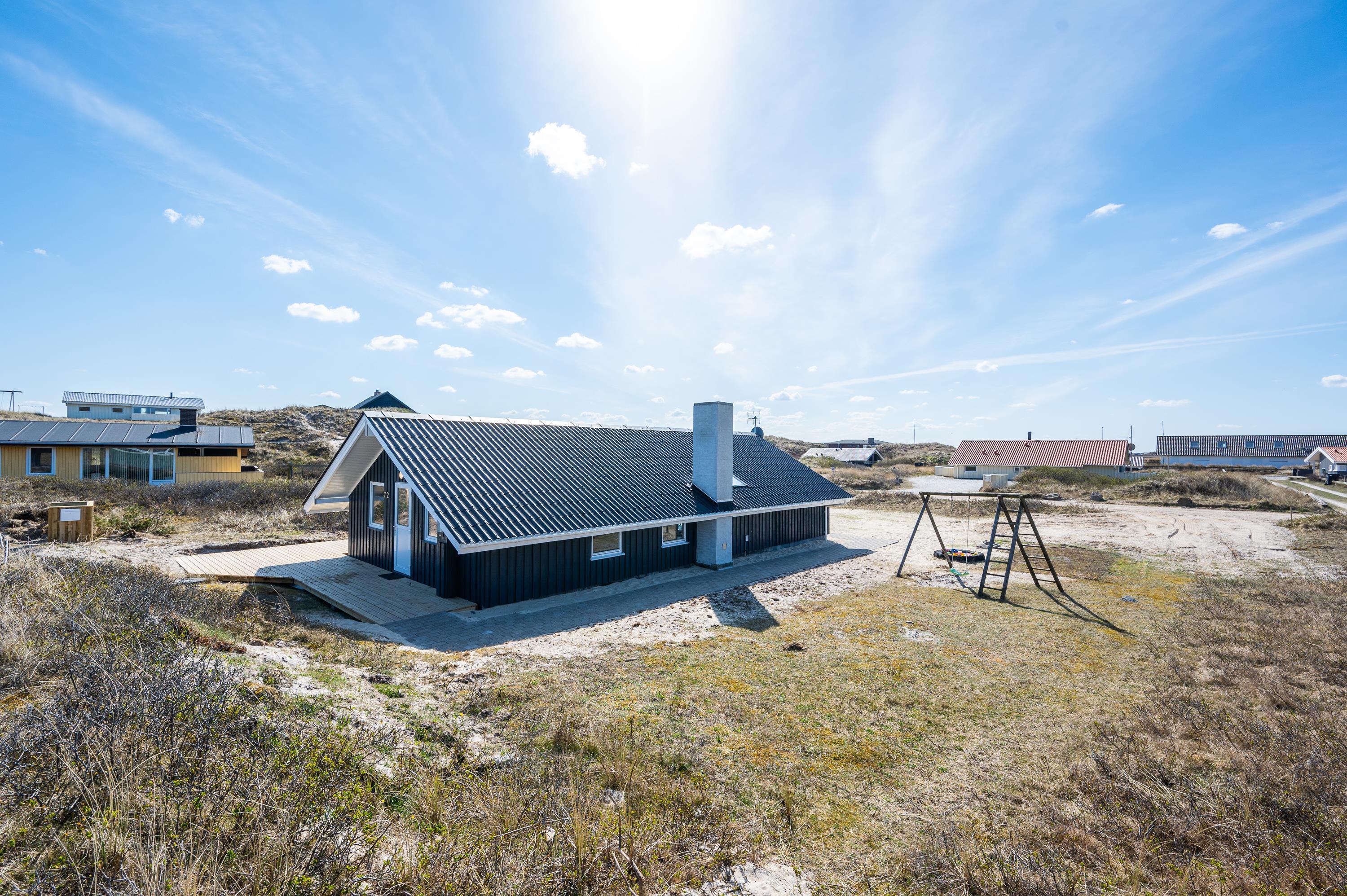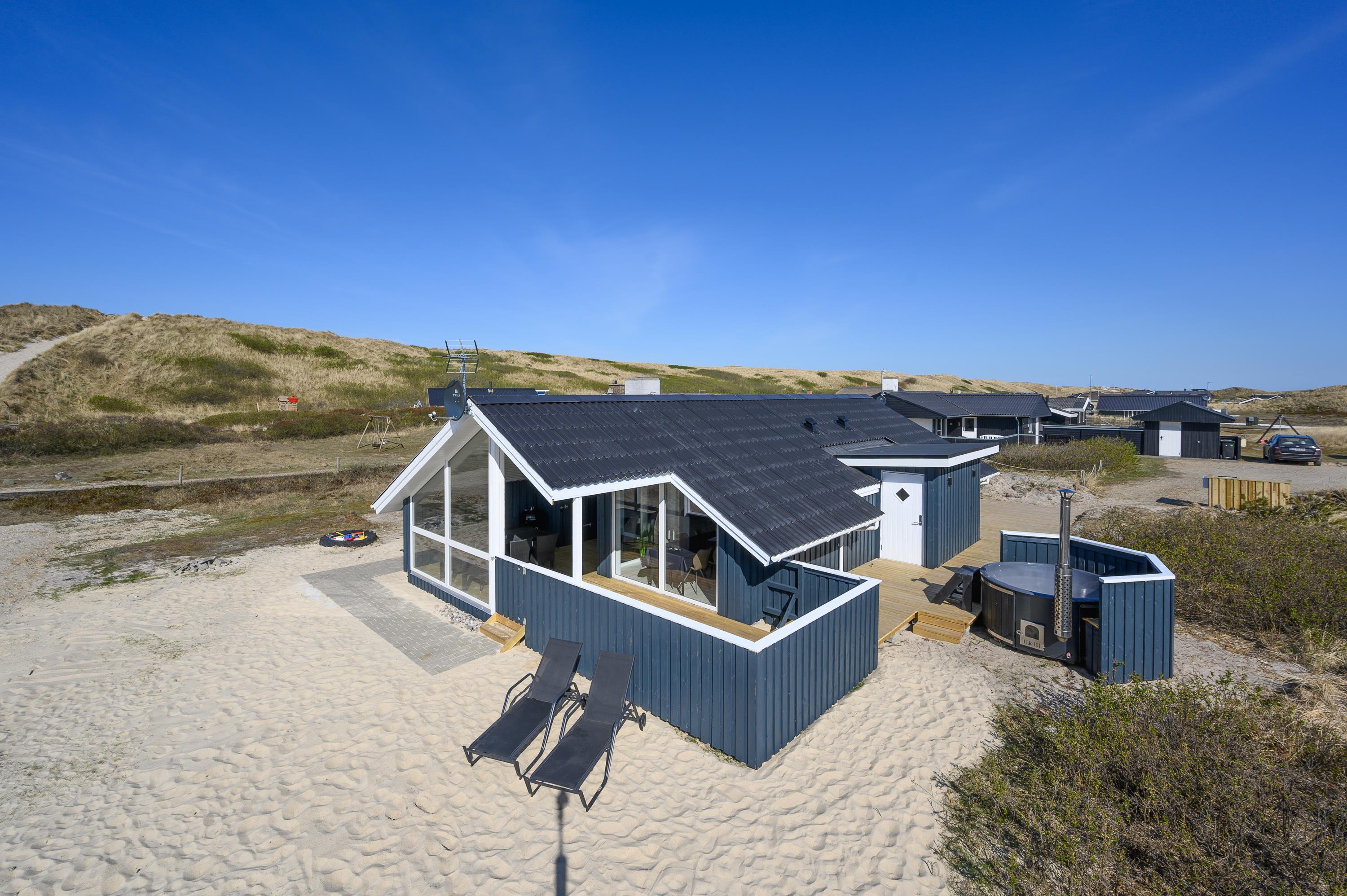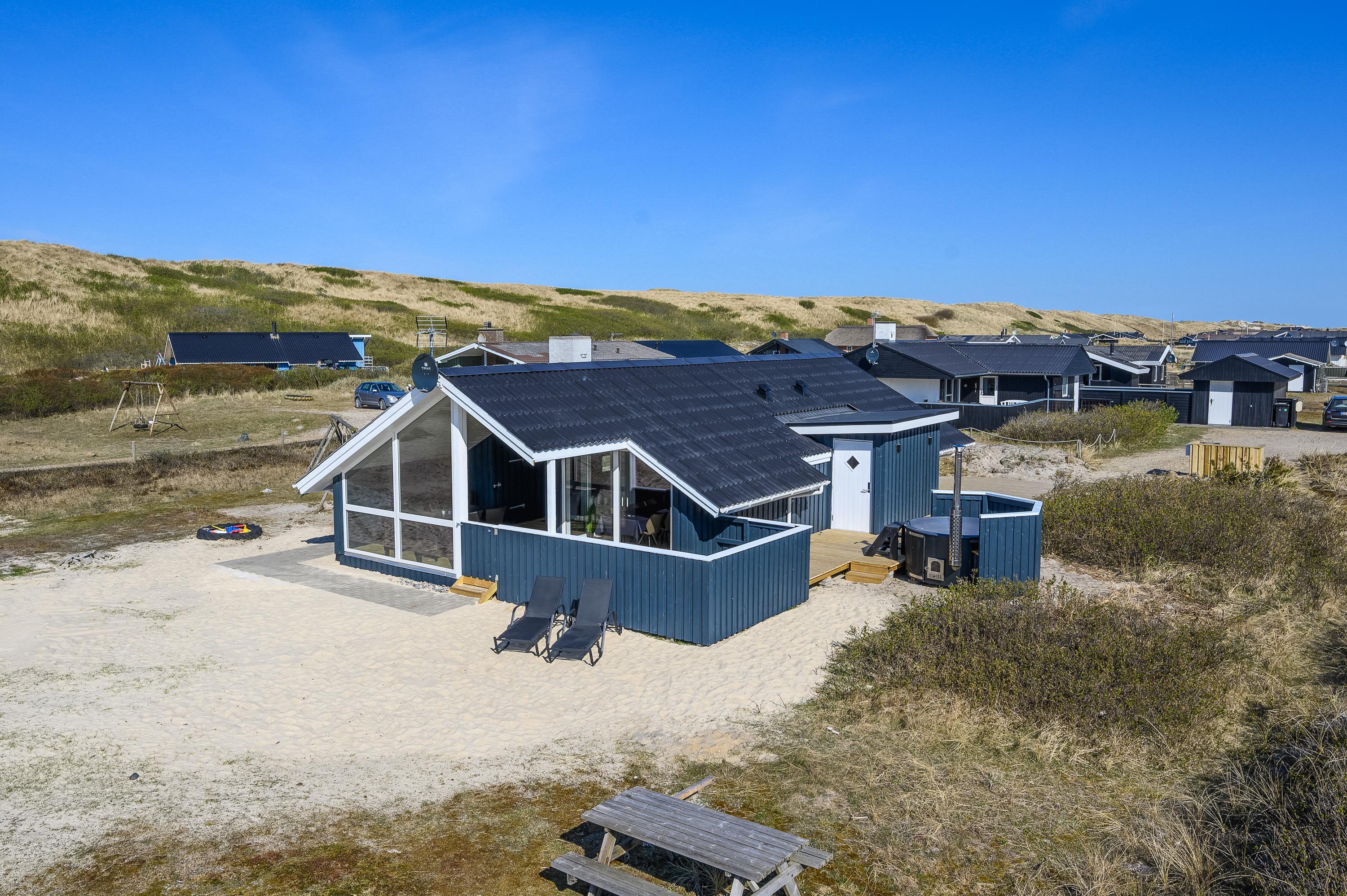 I får ikke kun et gennemført sommerhus, men også en helt fantastisk beliggenhed kun 100 meter fra Vesterhavet. Den nærmeste strandopgang ligger blot et stenkast fra feriematriklen, og en tur over klittoppen bringer jer hurtigt ned til vandet og den brede sandstrand. Stranden er altid en fascinerende oplevelse, og hele året rundt viser den mægtige natur nye sider af sig selv.