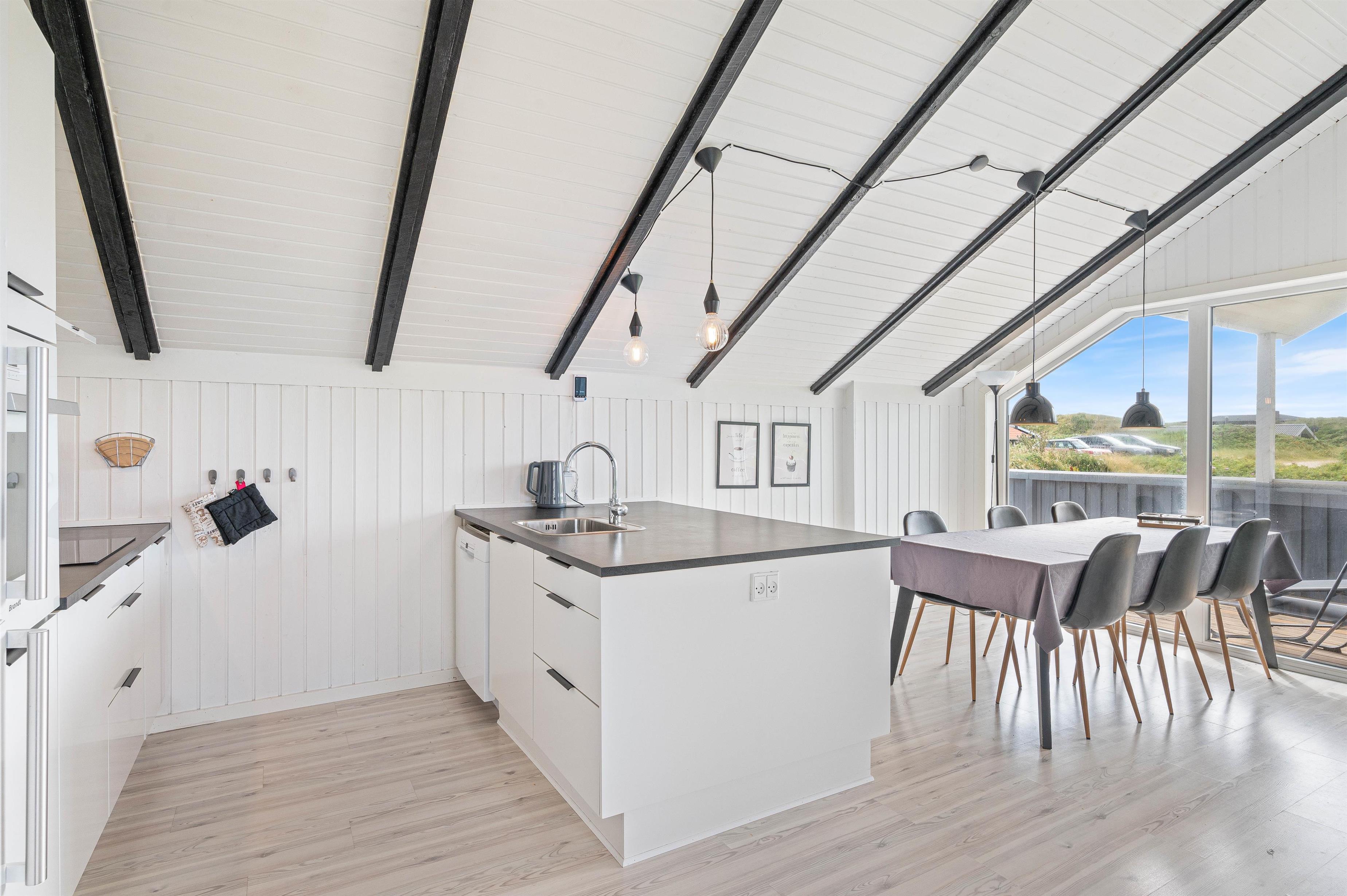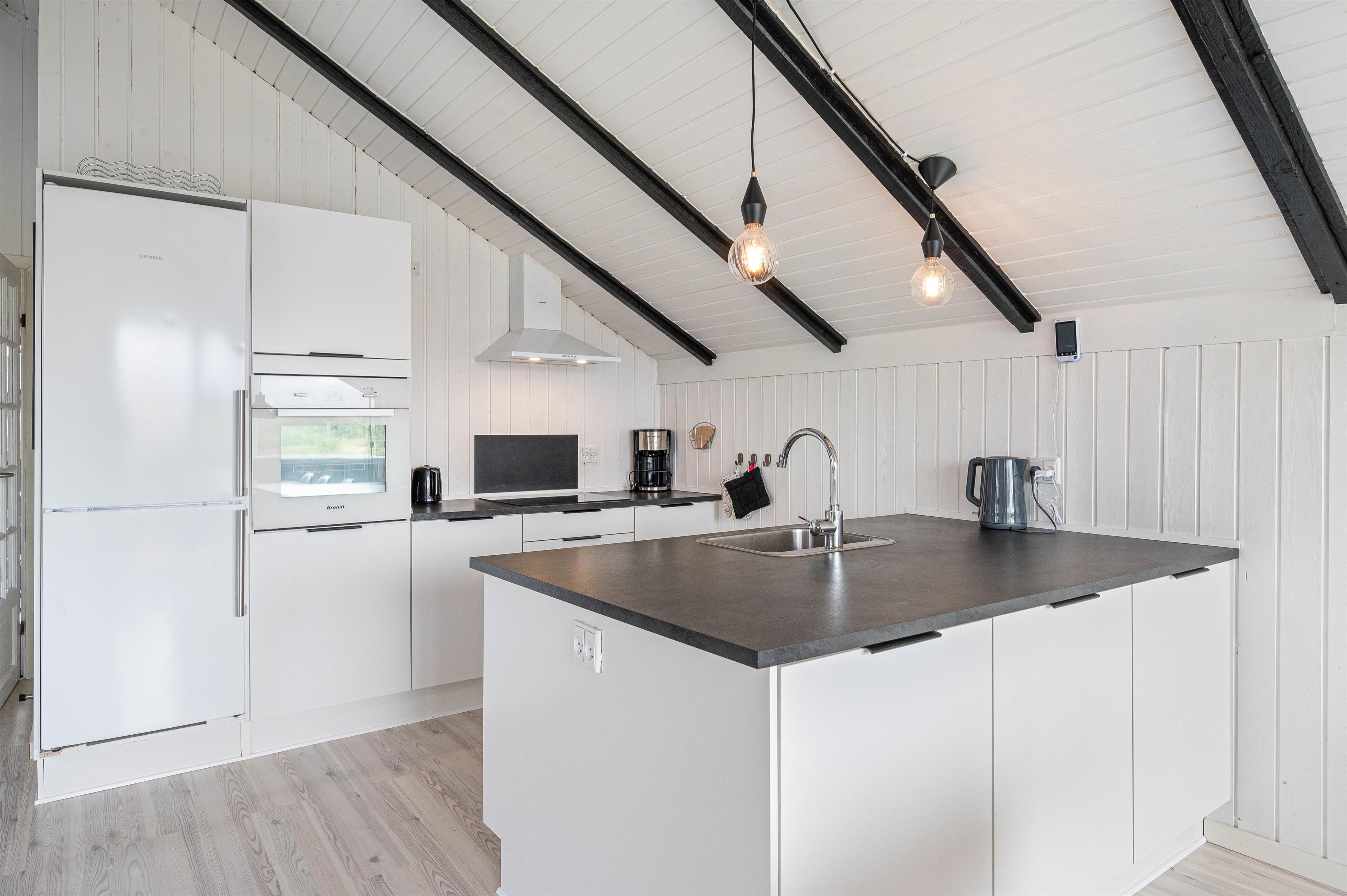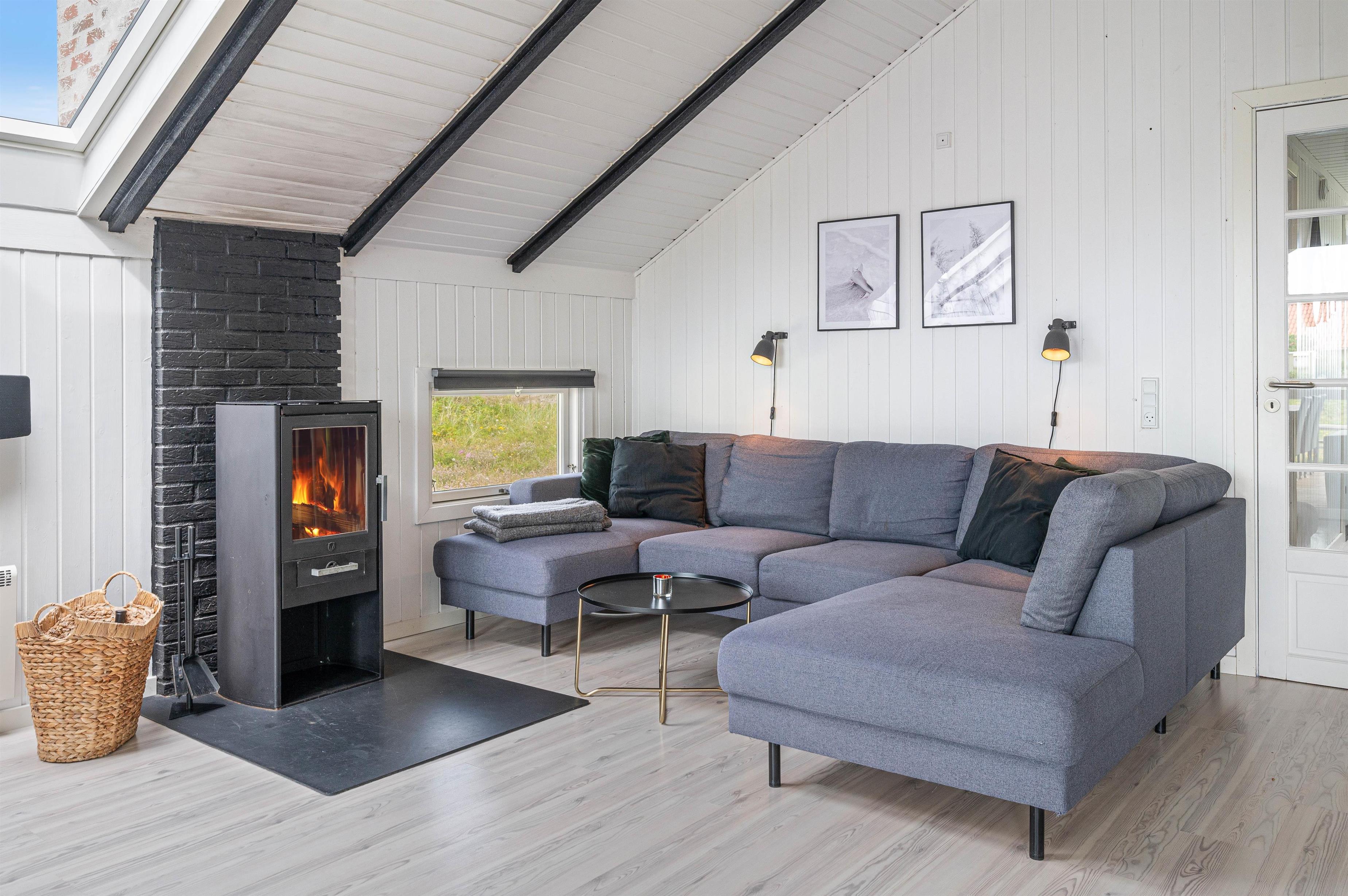 I vil blive mødt af et virkelig indbydende og moderne indre. Store ovenlysvinduer sørger for et fantastisk lysindfald, og det smagfulde interiør sætter den helt rigtige feriestemning – selvfølgelig også hjulpet på vej af den hyggelige brændeovn.