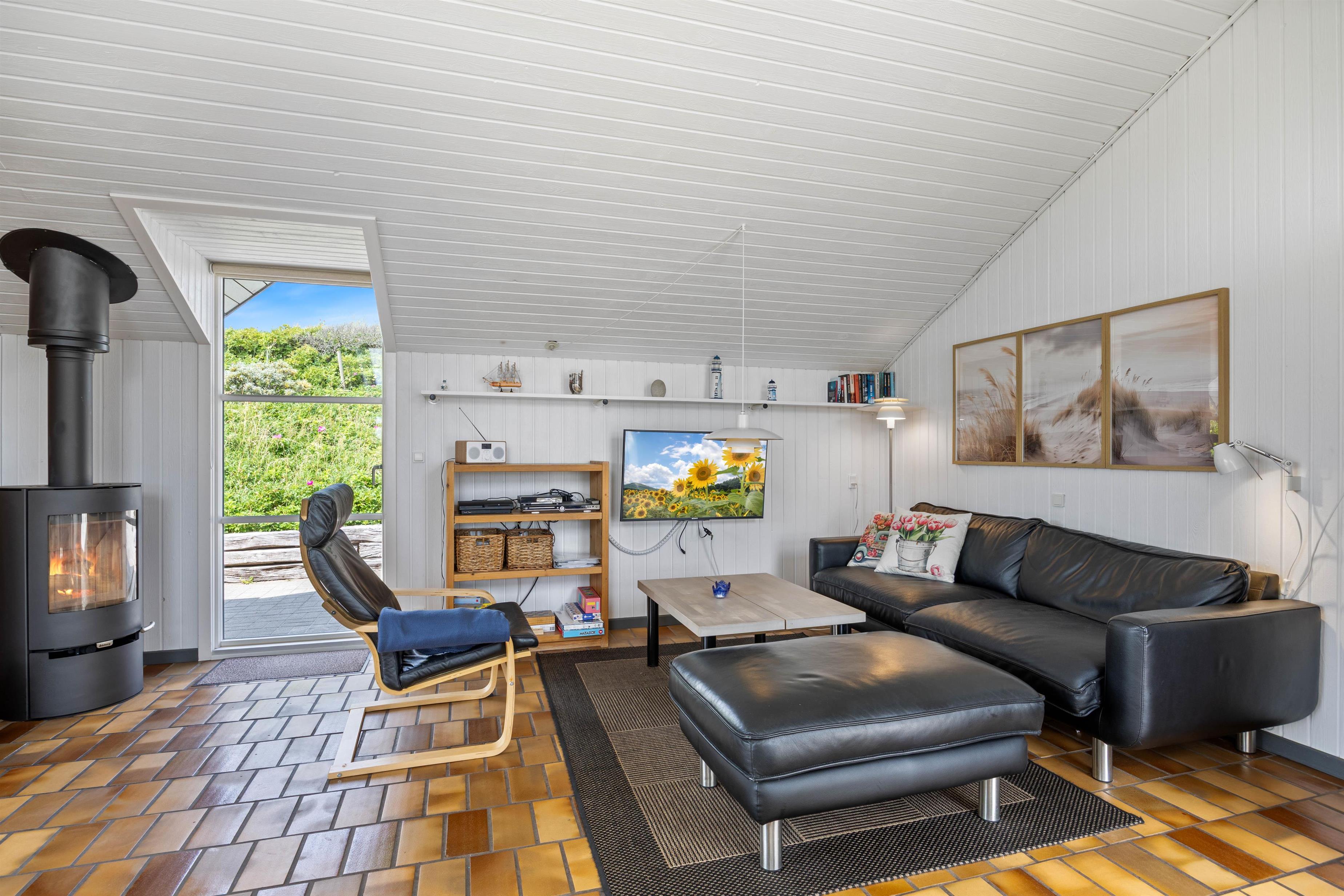 Køkkenet ligger i åben forbindelse med stuen; De høje lofter til kip og ovenlysvinduerne lukker naturen ind og gør rummet lyst og indbydende. Stuen er smagfuldt indrettet, har klinkegulv og brændeovn, som både spreder varme og ekstra hyggelig feriestemning. Der er gratis trådløs internetadgang.