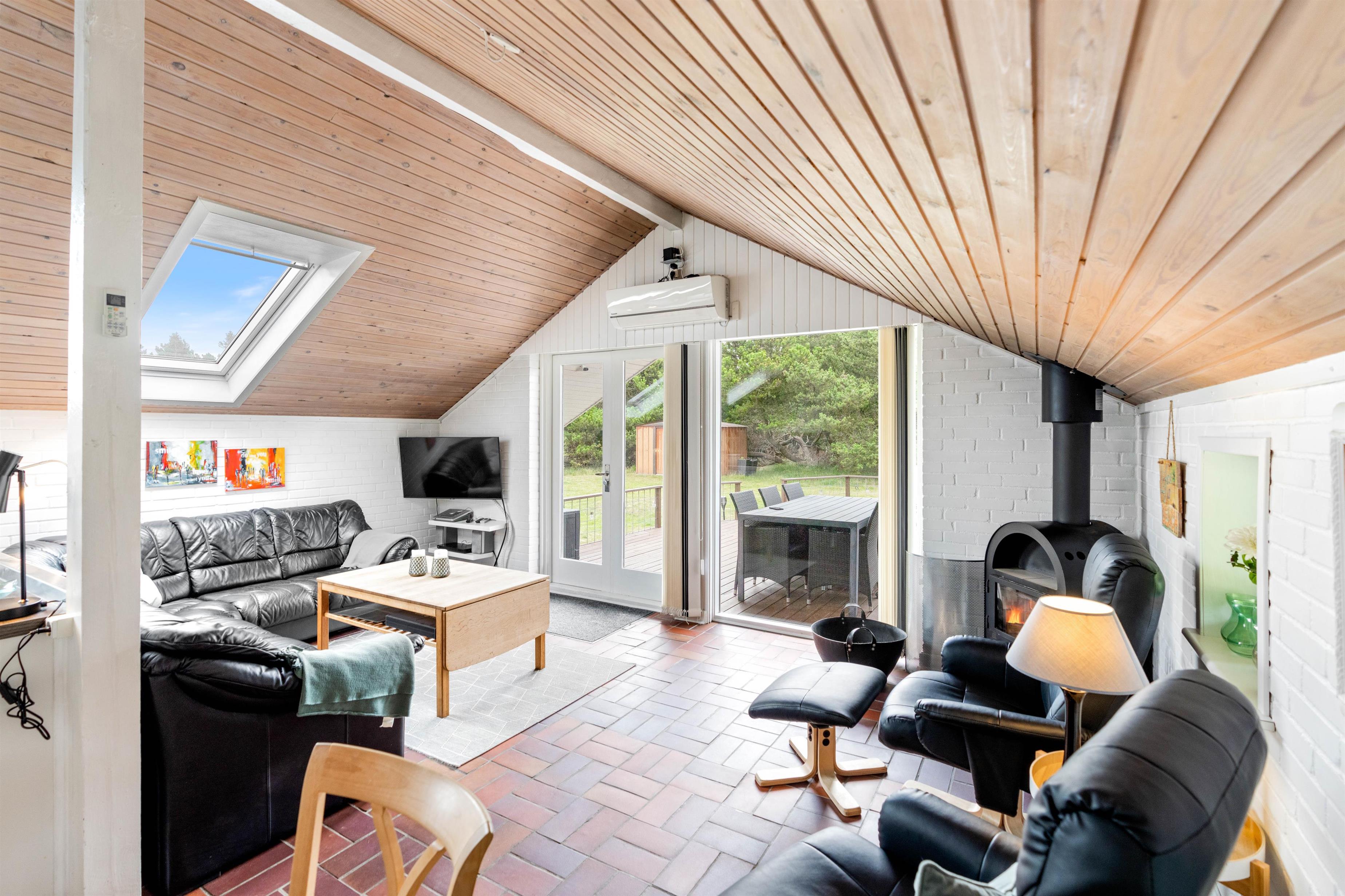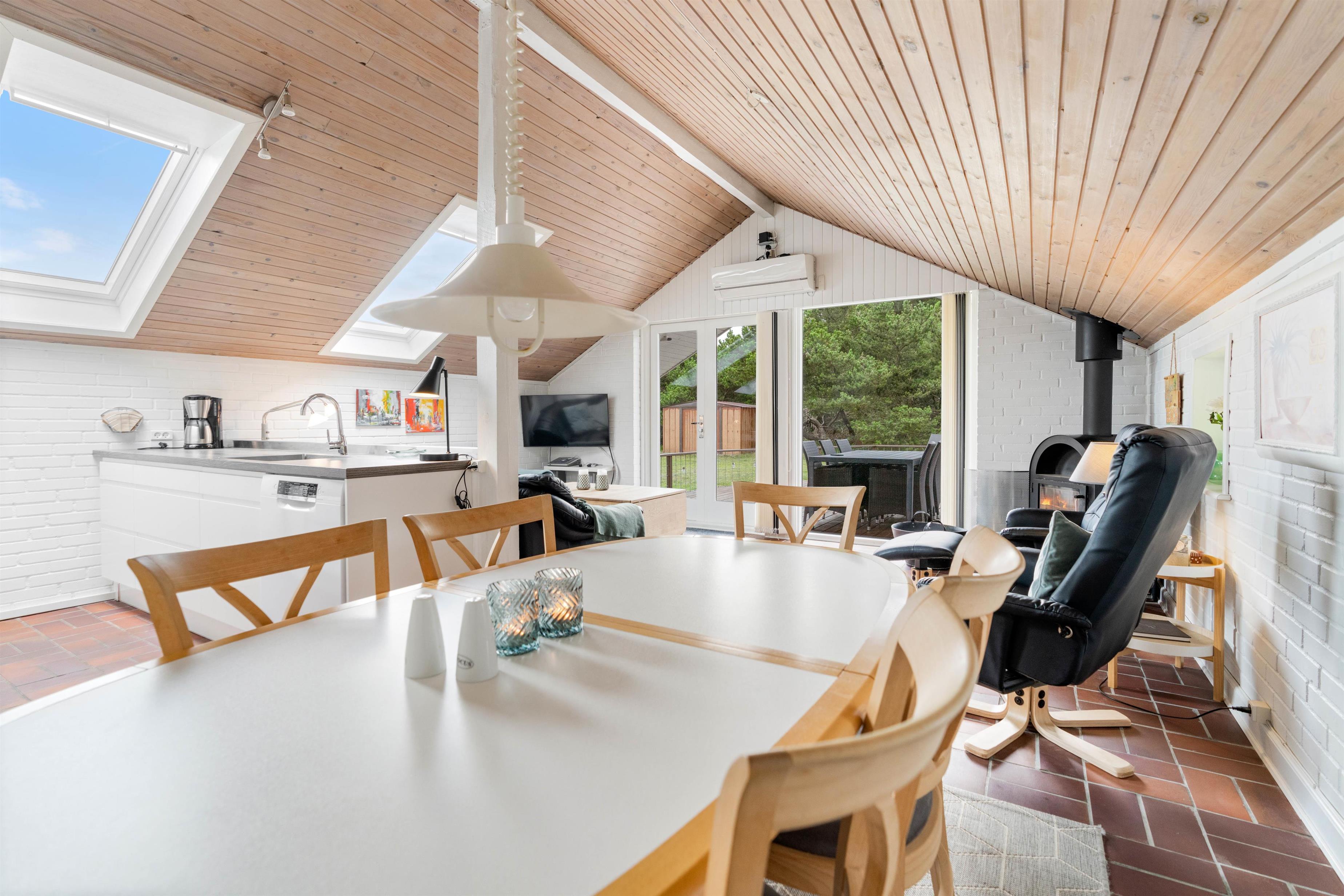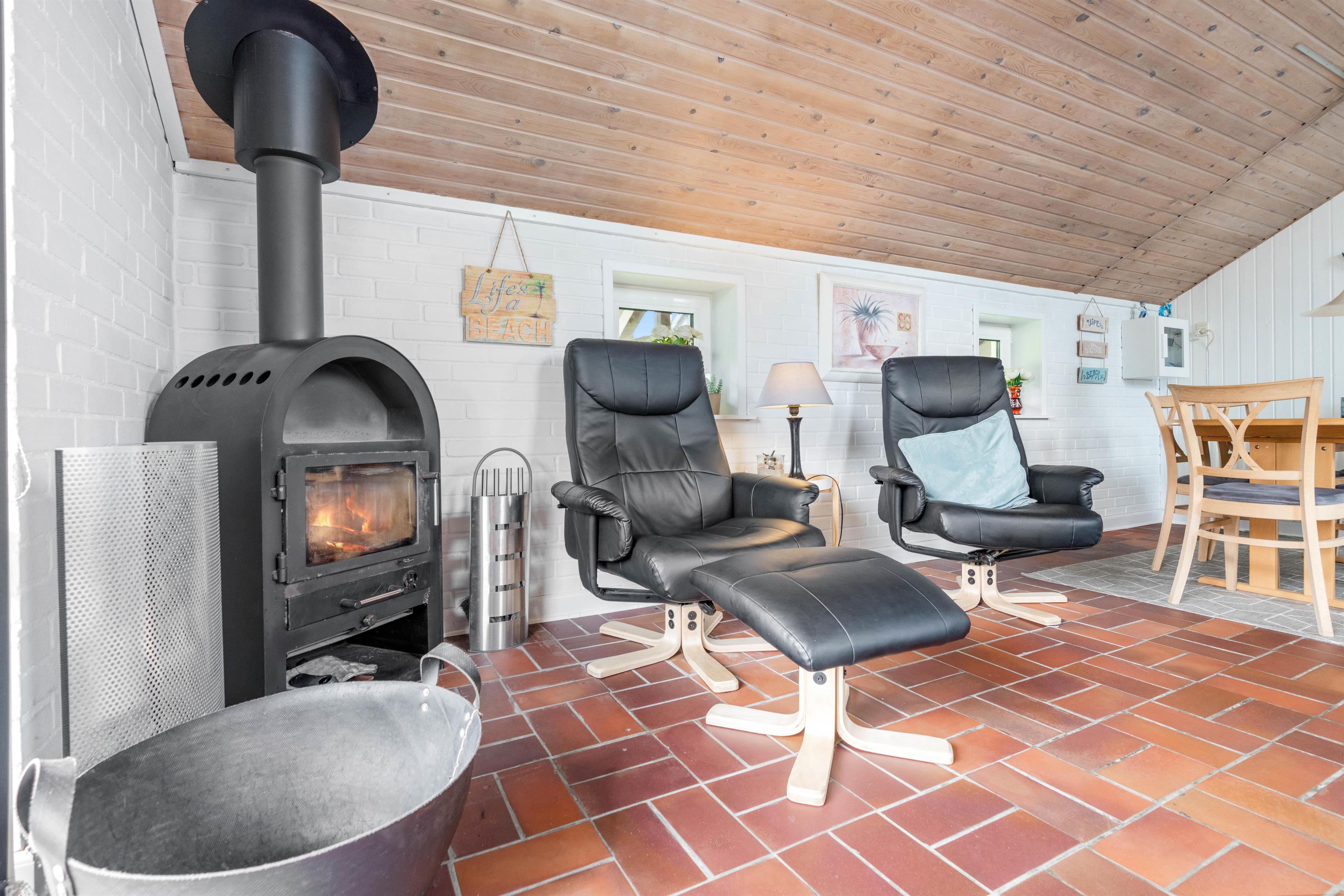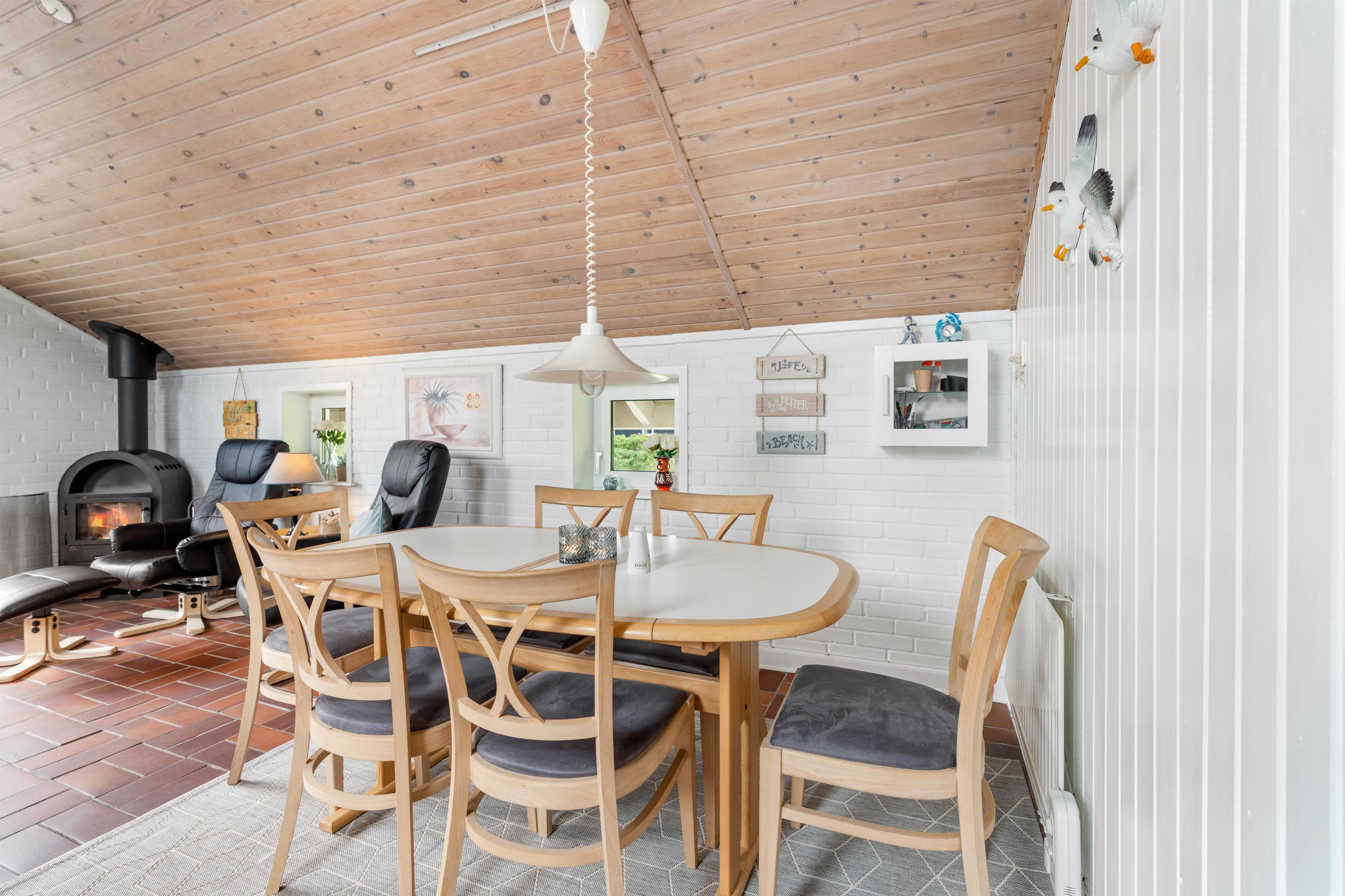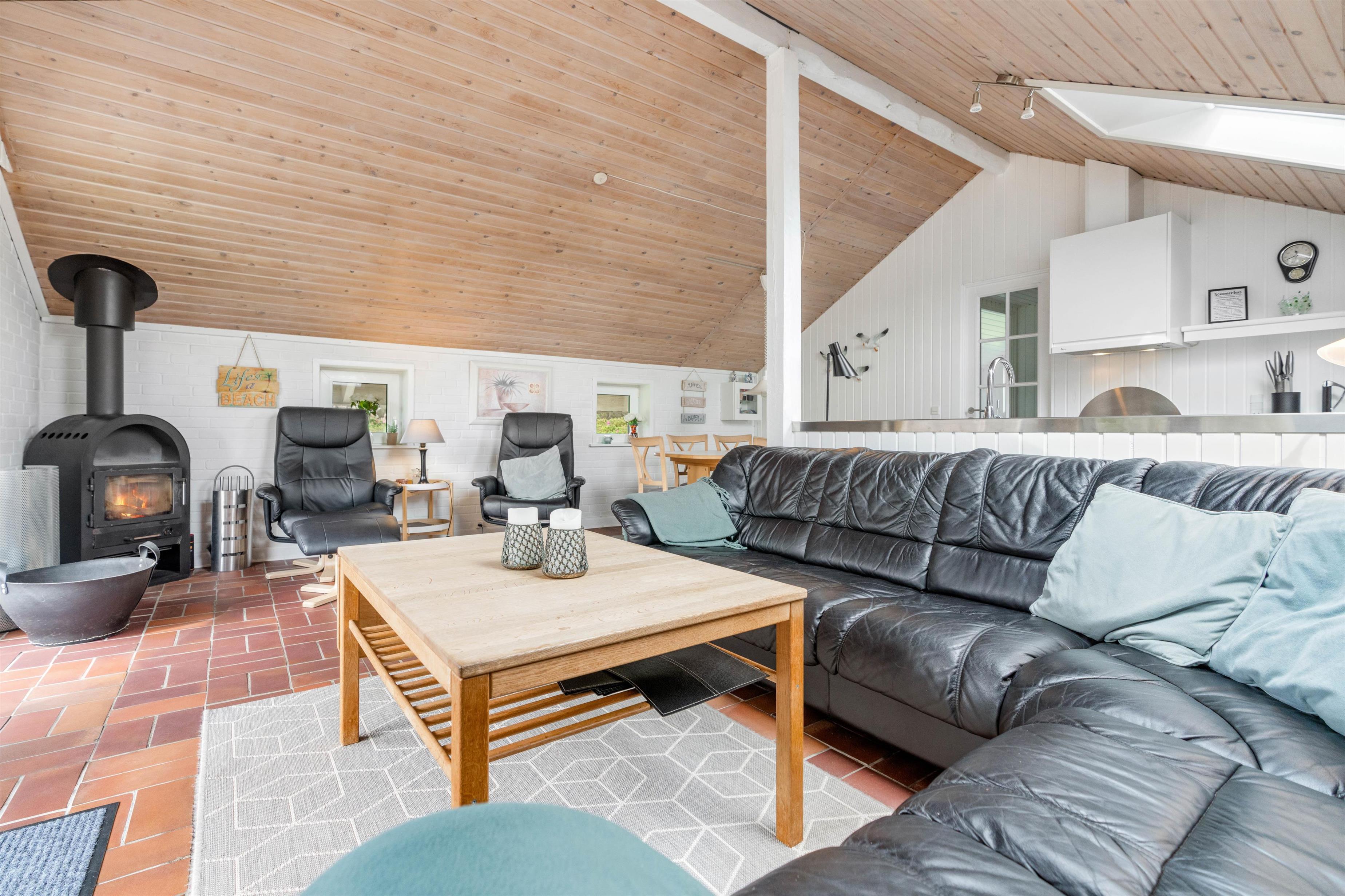 Opholdsrummet er hyggelig indrettet, med spisehjørne – og med sofahjørne, som indbyder til familiehygge - måske med brætspil eller en god bog ved brændeovnen.