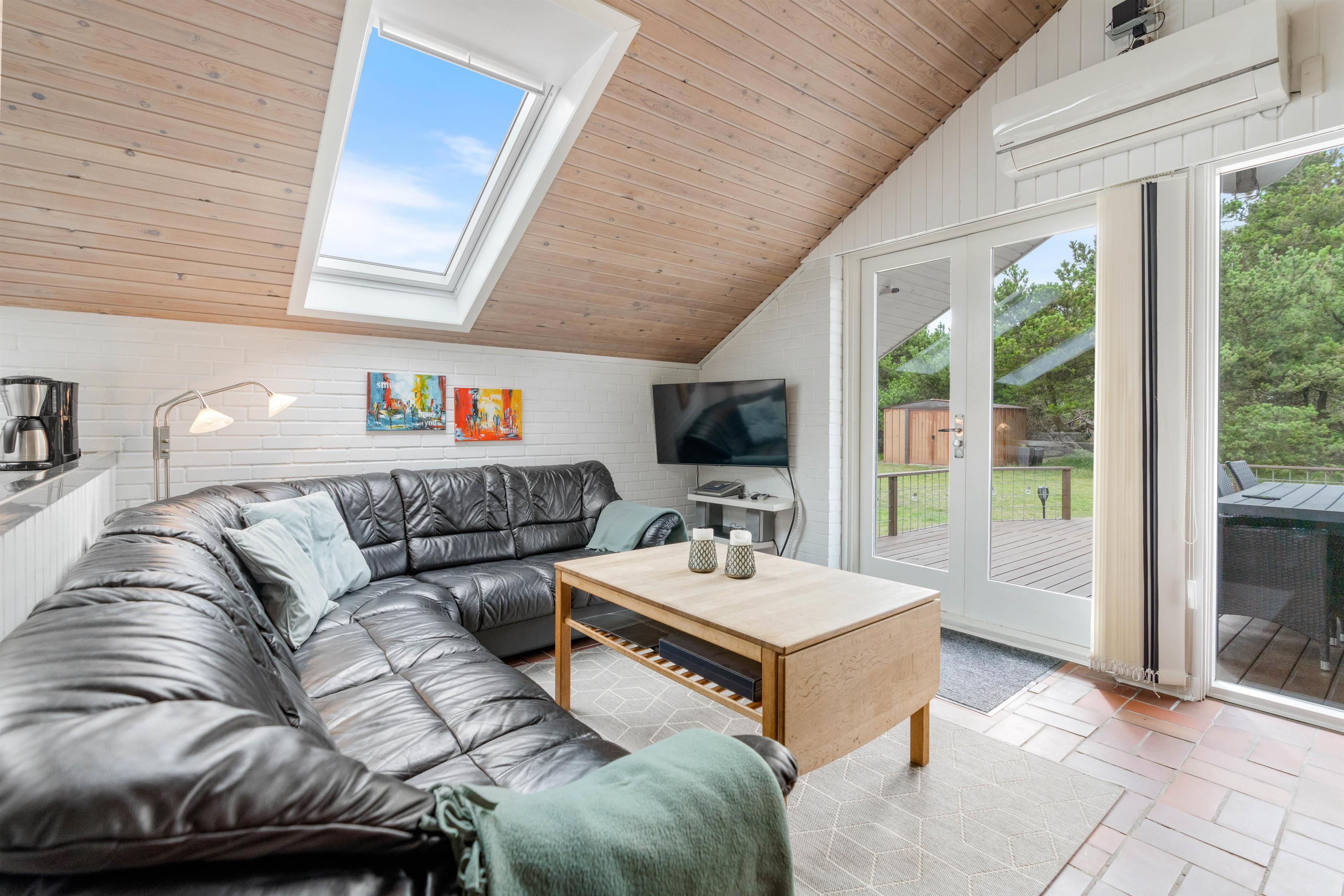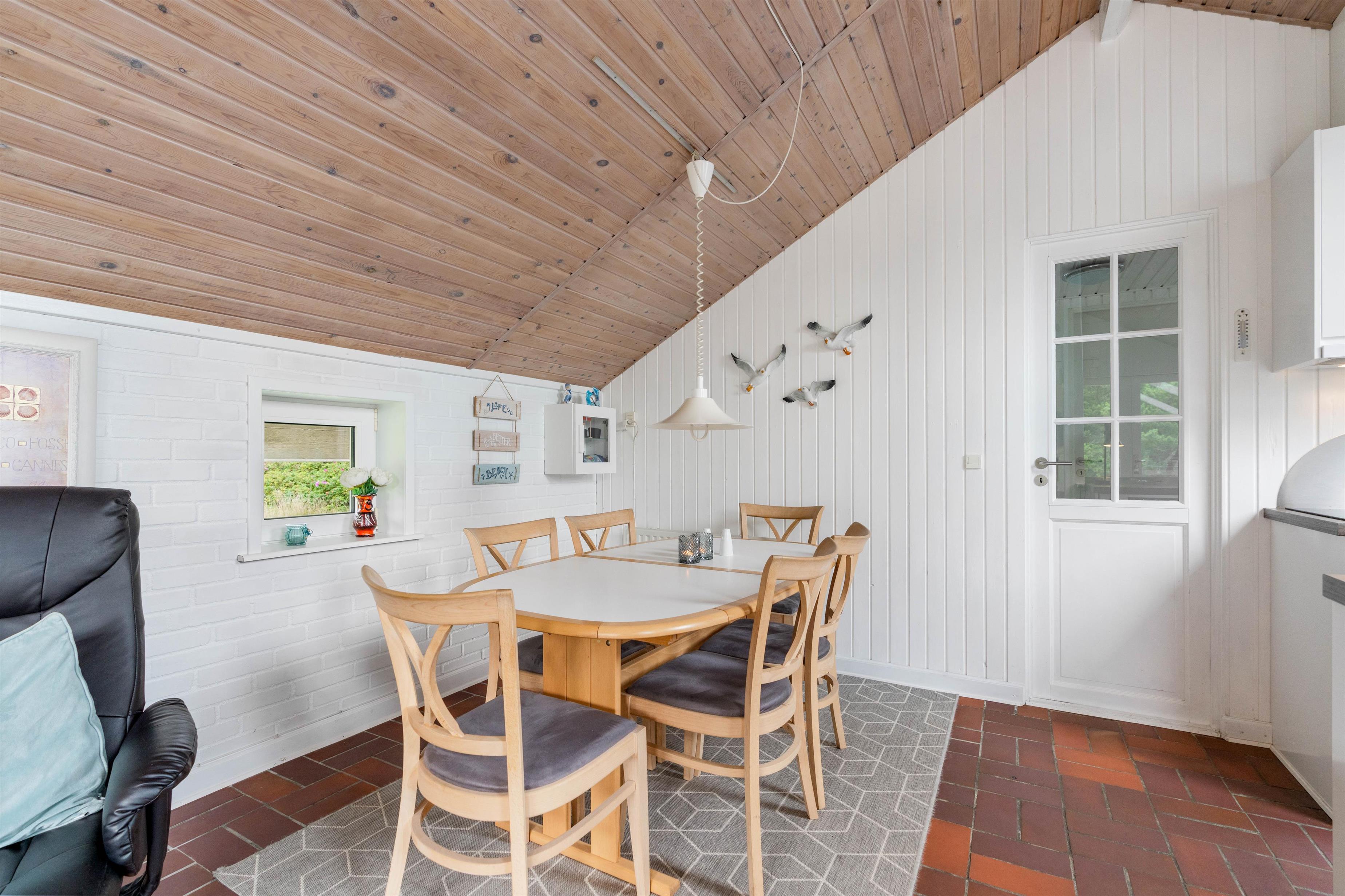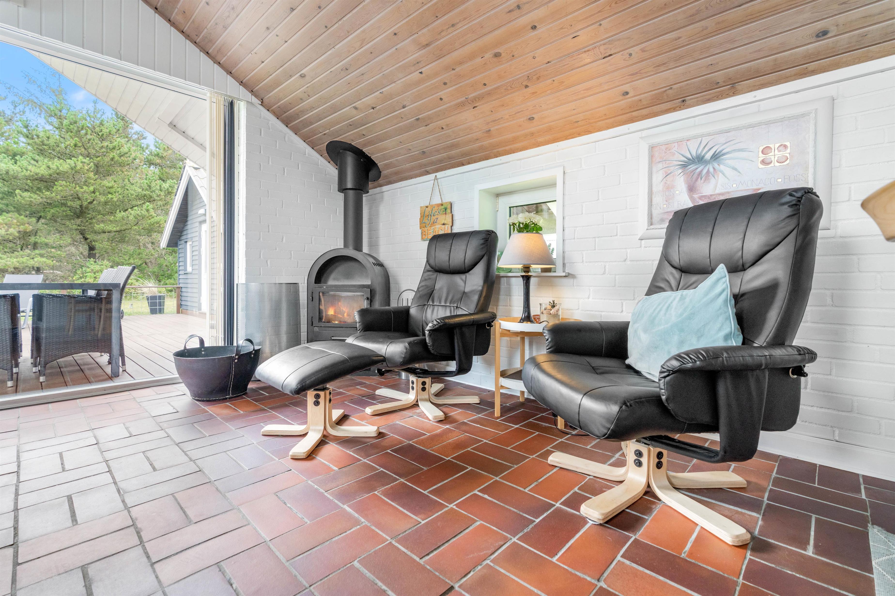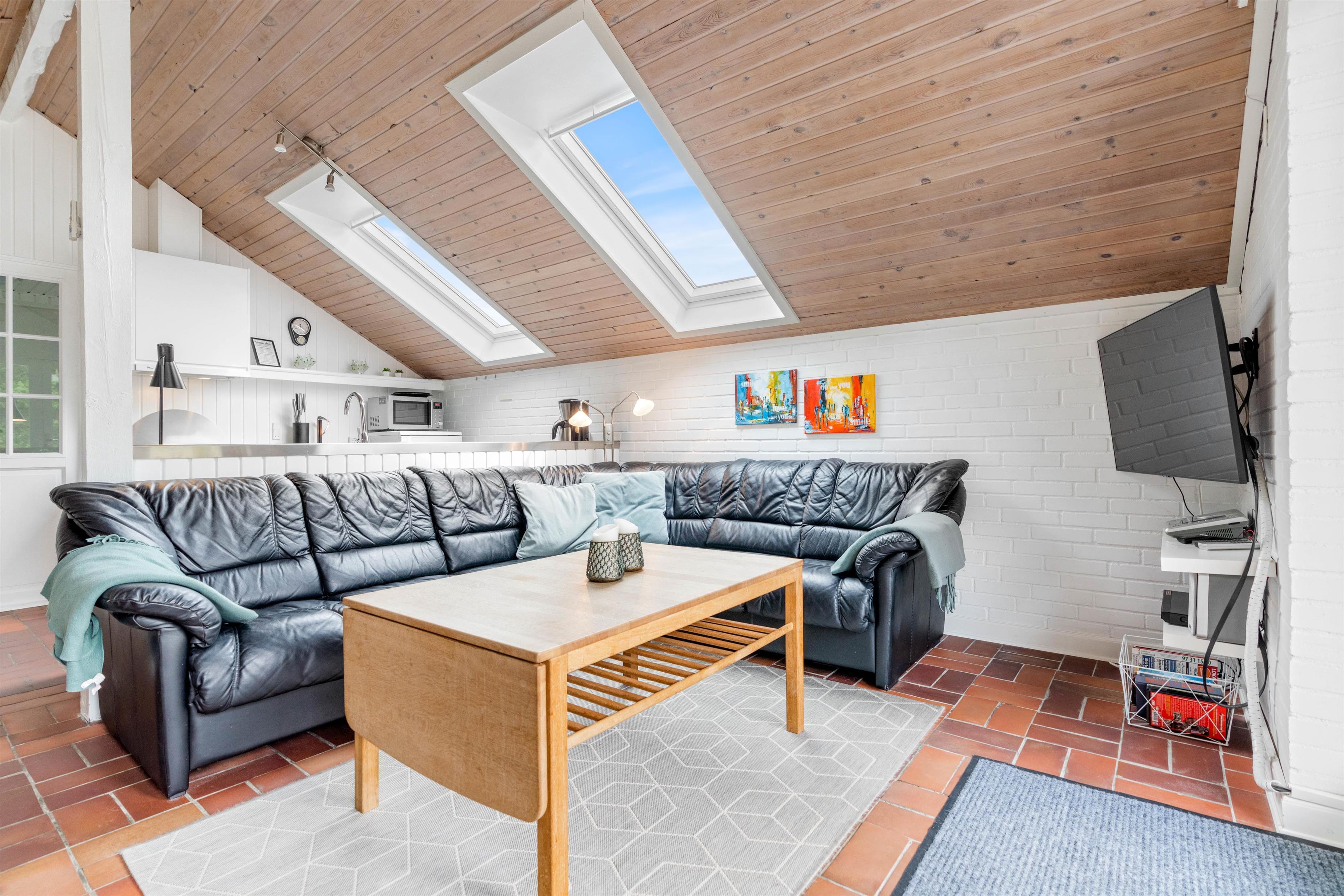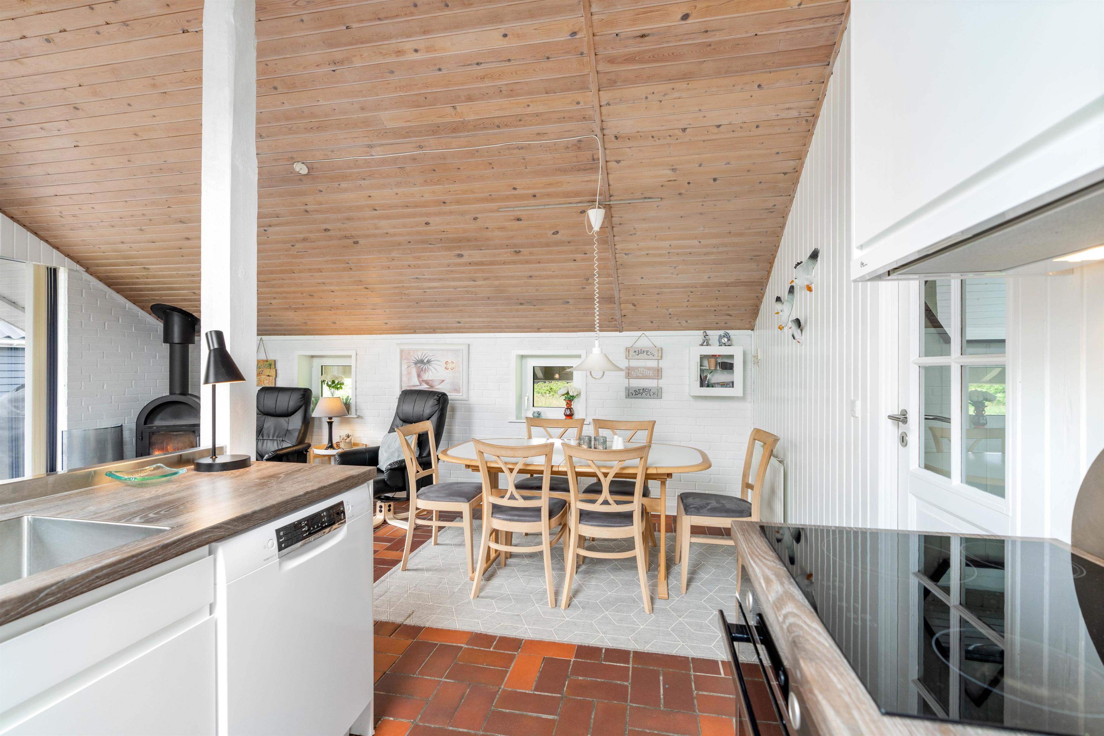 Opholdsrummet er hyggelig indrettet, med spisehjørne – og med sofahjørne, som indbyder til familiehygge - måske med brætspil eller en god bog ved brændeovnen.