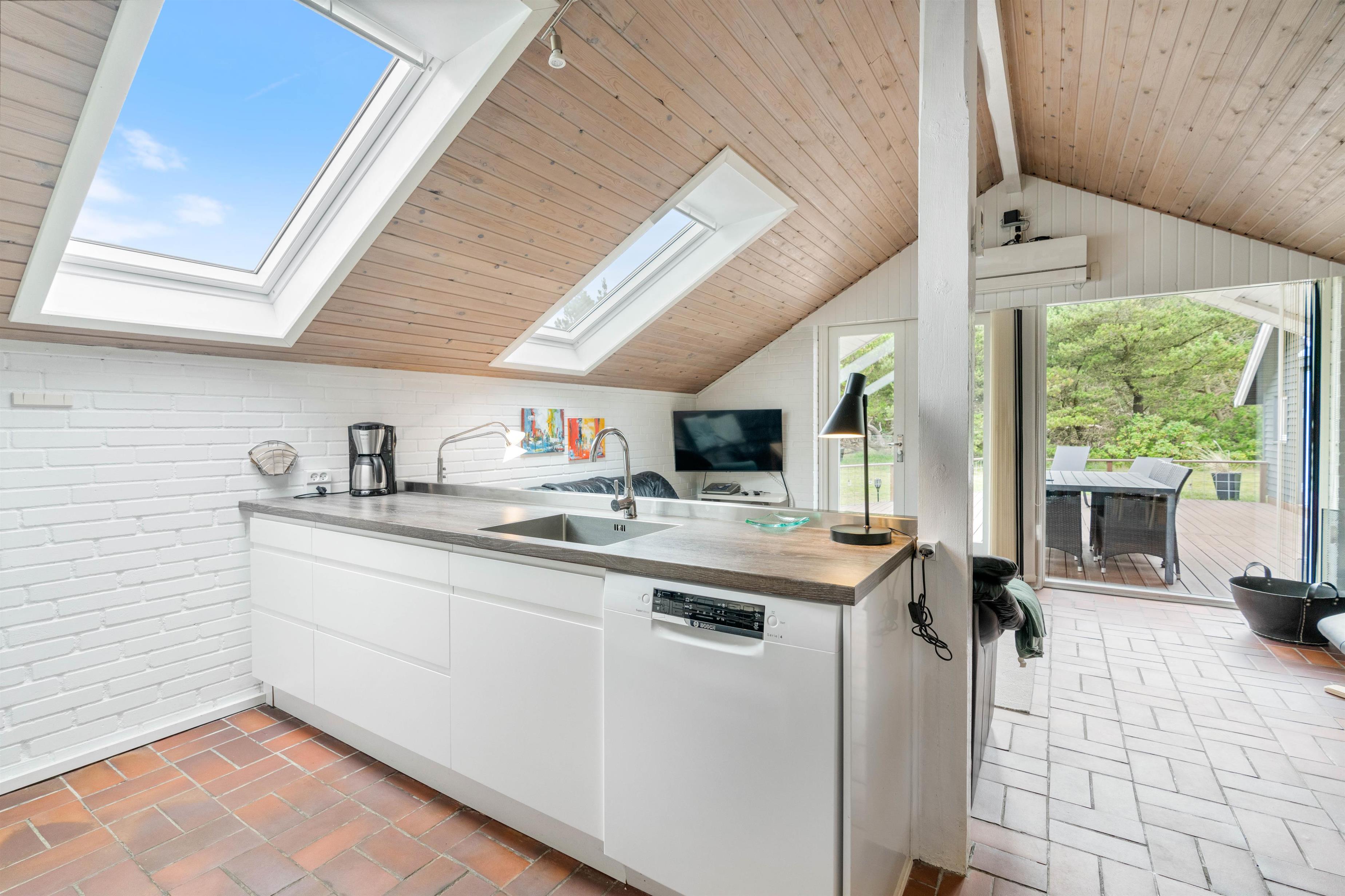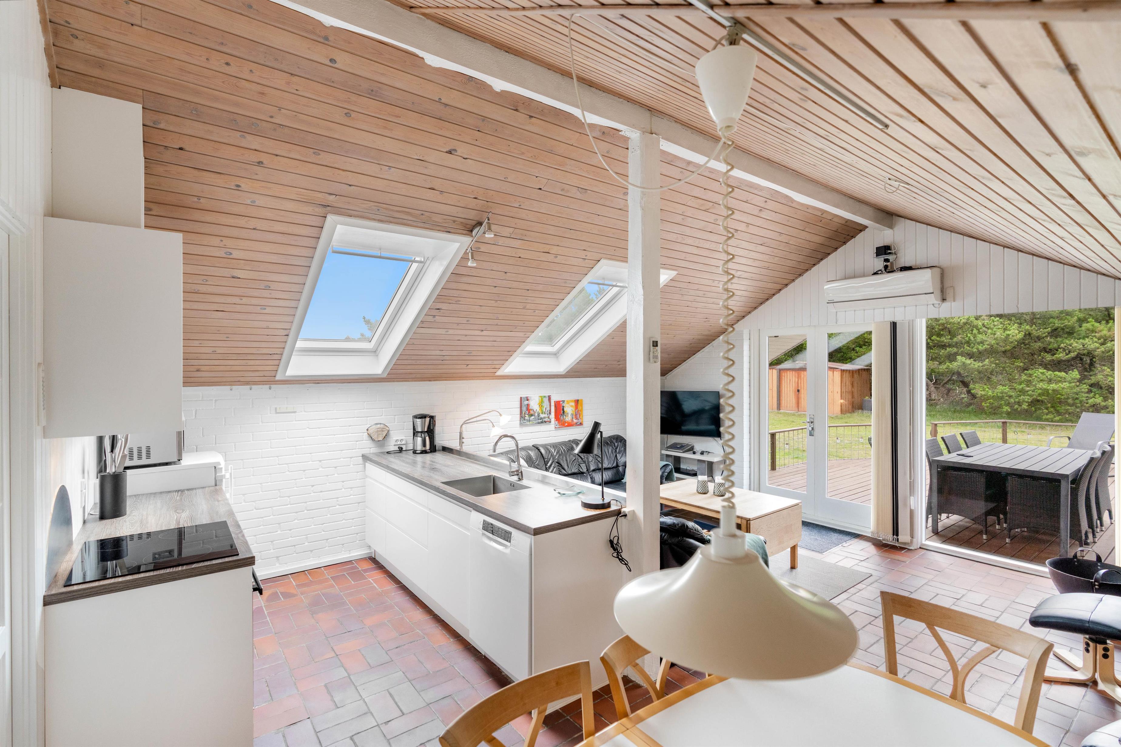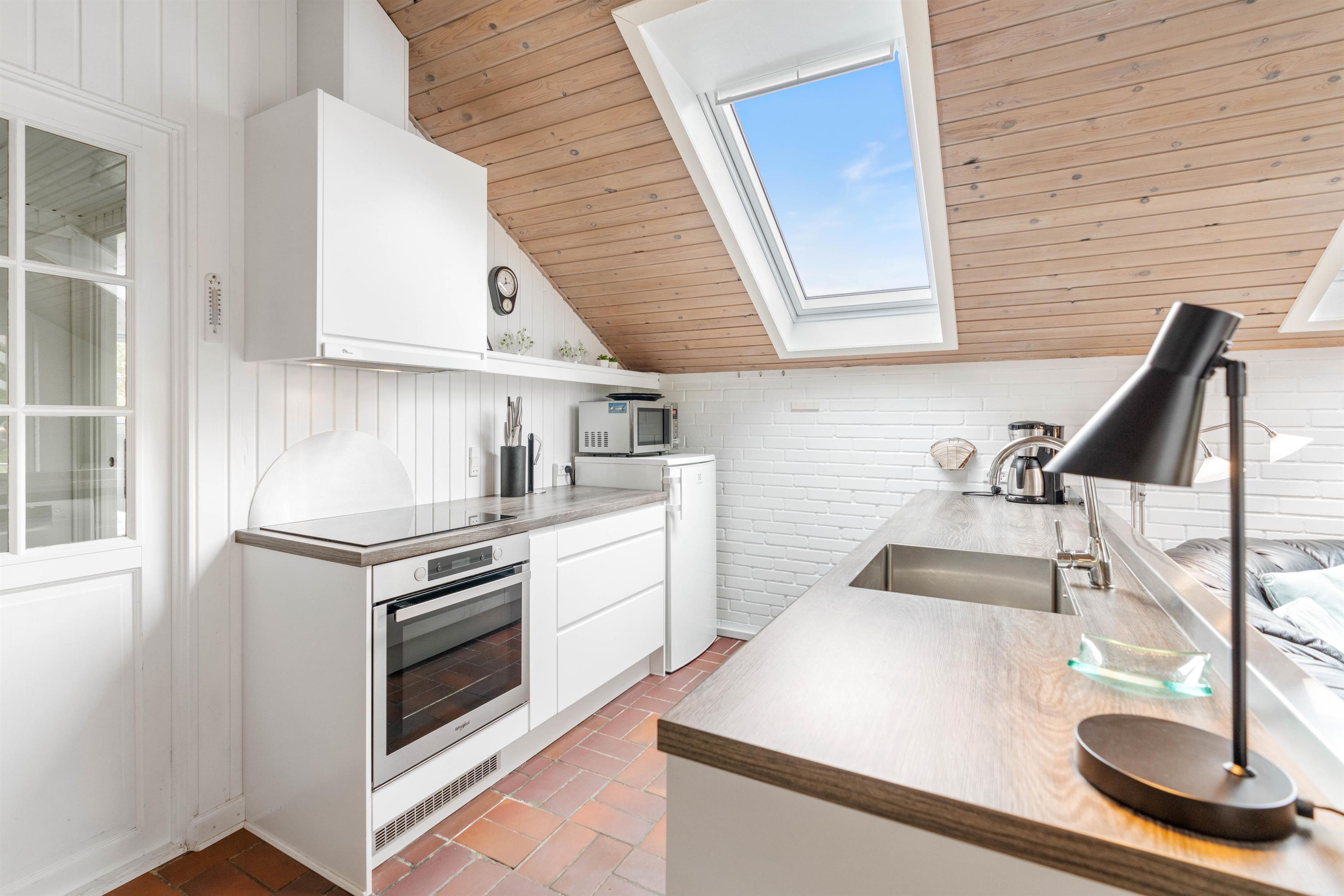 Huset her på den 1200m2 store grund er hyggelig og personlig indrettet. Det kombinerede spisestue-opholdsrum er indrettet med en praktisk køkkenafdeling, hvor I finder alt, hvad der er nødvendig for et godt ophold i huset, bl.a. med mikroovn.
