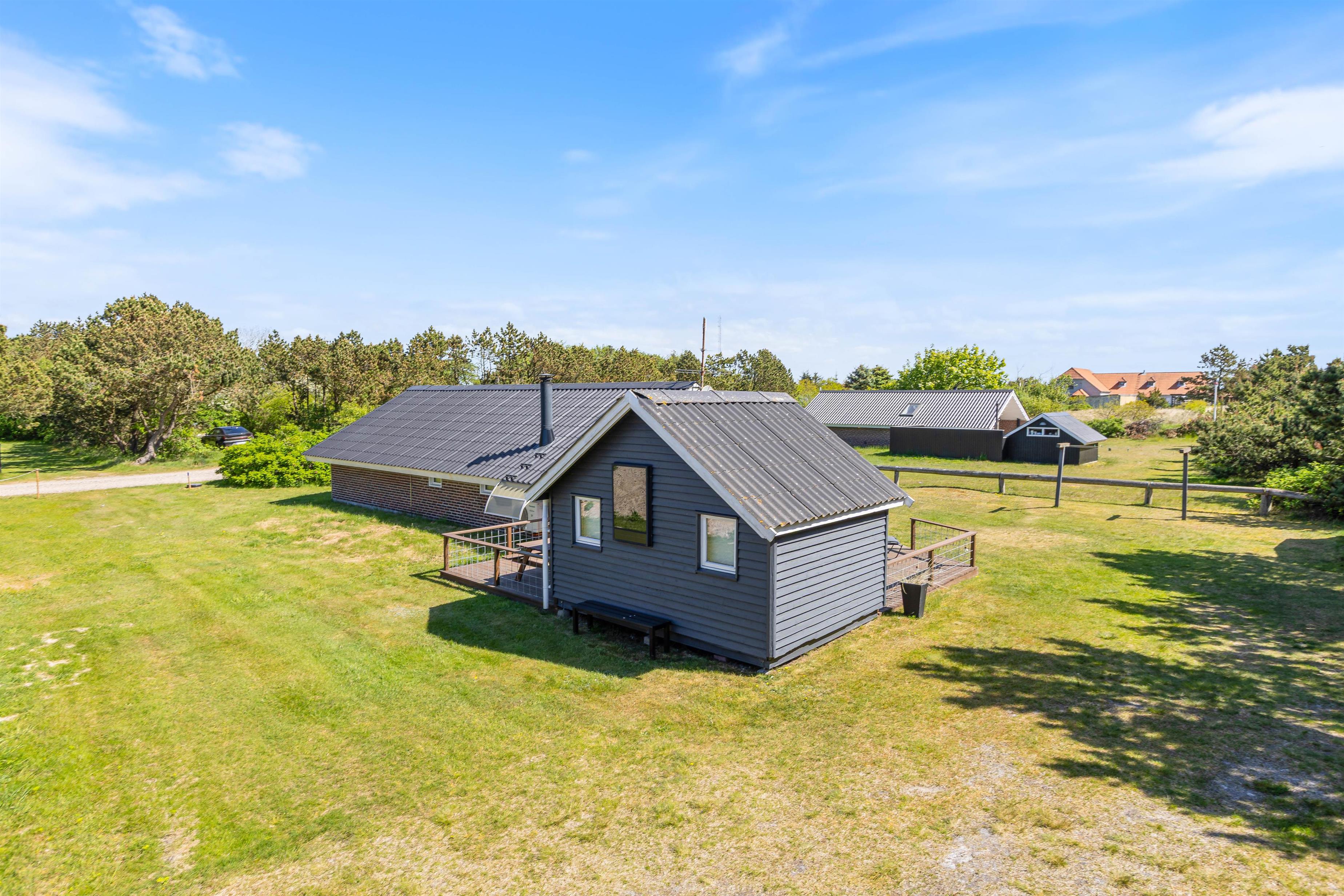 Her i det populære ferieområde Bjerregård har I mange muligheder for en afslappende ferie med hele familien, tæt på naturen. Både Vesterhavet og Ringkøbing Fjord ligger kun en lille spadseretur på ca. 10 min væk – og I finder en lille legeplads og købmanden kun 400 meter fra huset.