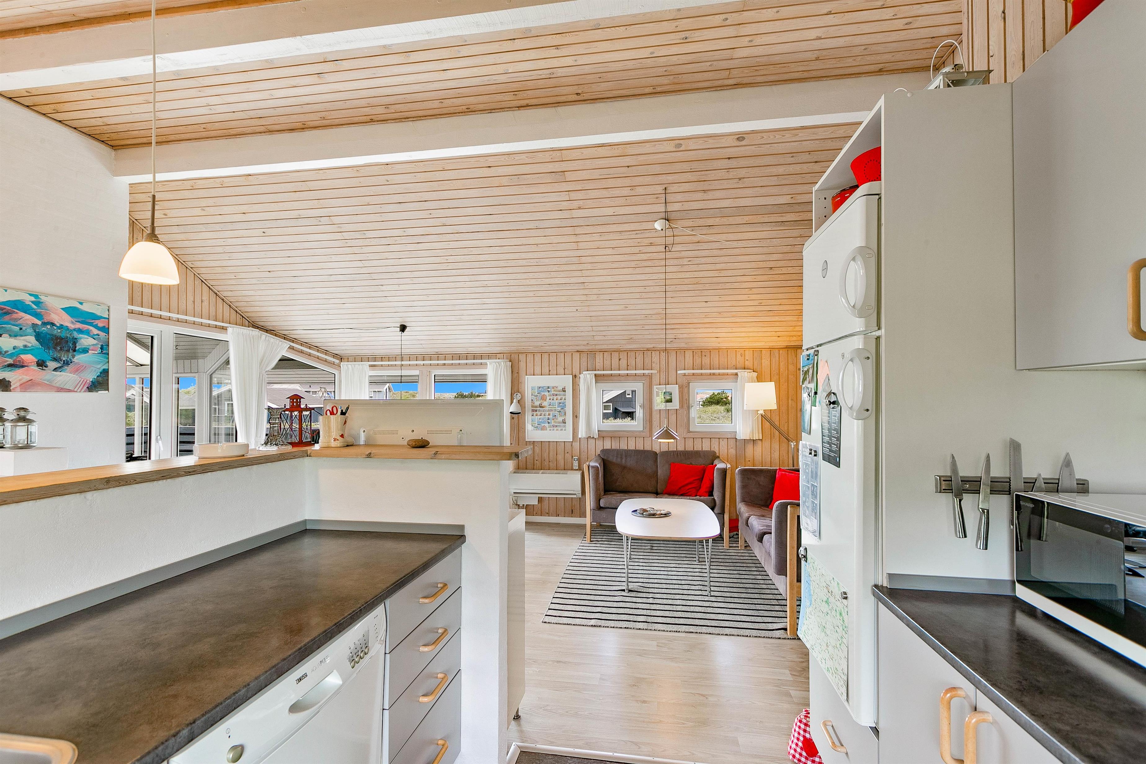De mange, store vinduer i det åbne køkken- og stuerum lader lyset slippe ind og sørger samtidig for, at I har en rigtig flot udsigt ud over grundstykket og det unikke, vestjyske landskab. Eftersom køkkenet er åbnet op, kan I nyde hinandens selskab, selv når der bliver lavet mad. Efter måltidet skal opvaskemaskinen nok klare resten for jer, så I kan holde rigtig familietid.