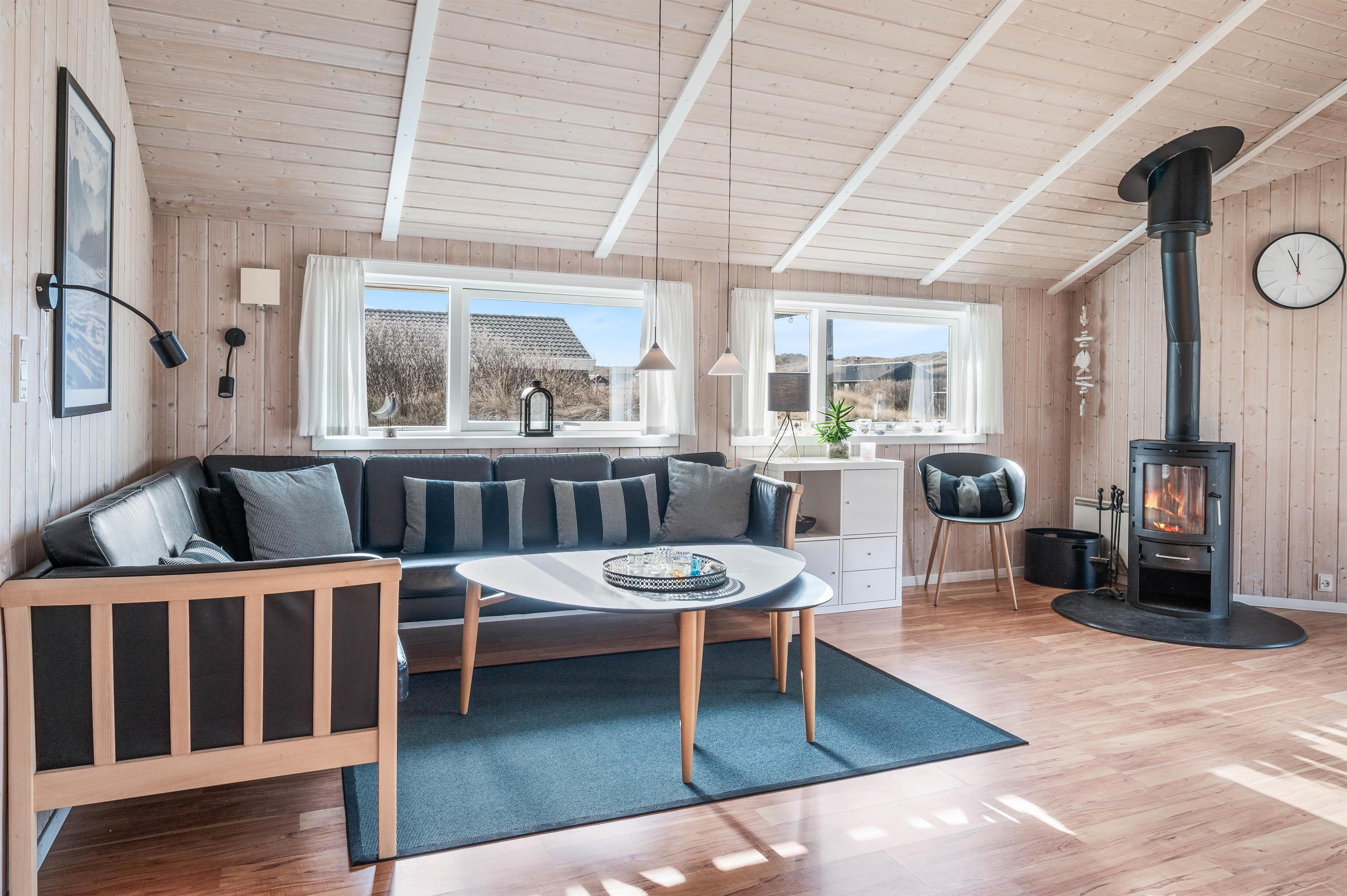 Feriehuset har et pænt køkken med opvaskemaskine og mikroovn i åben forbindelse med hyggelig opholsstue. Stuen er indrettet med gode og komfortable møbler, har trægulve, brændeovn og fladskærms-TV. Fra stuen er der udgang til den overdækkede terrasse mod vest.
