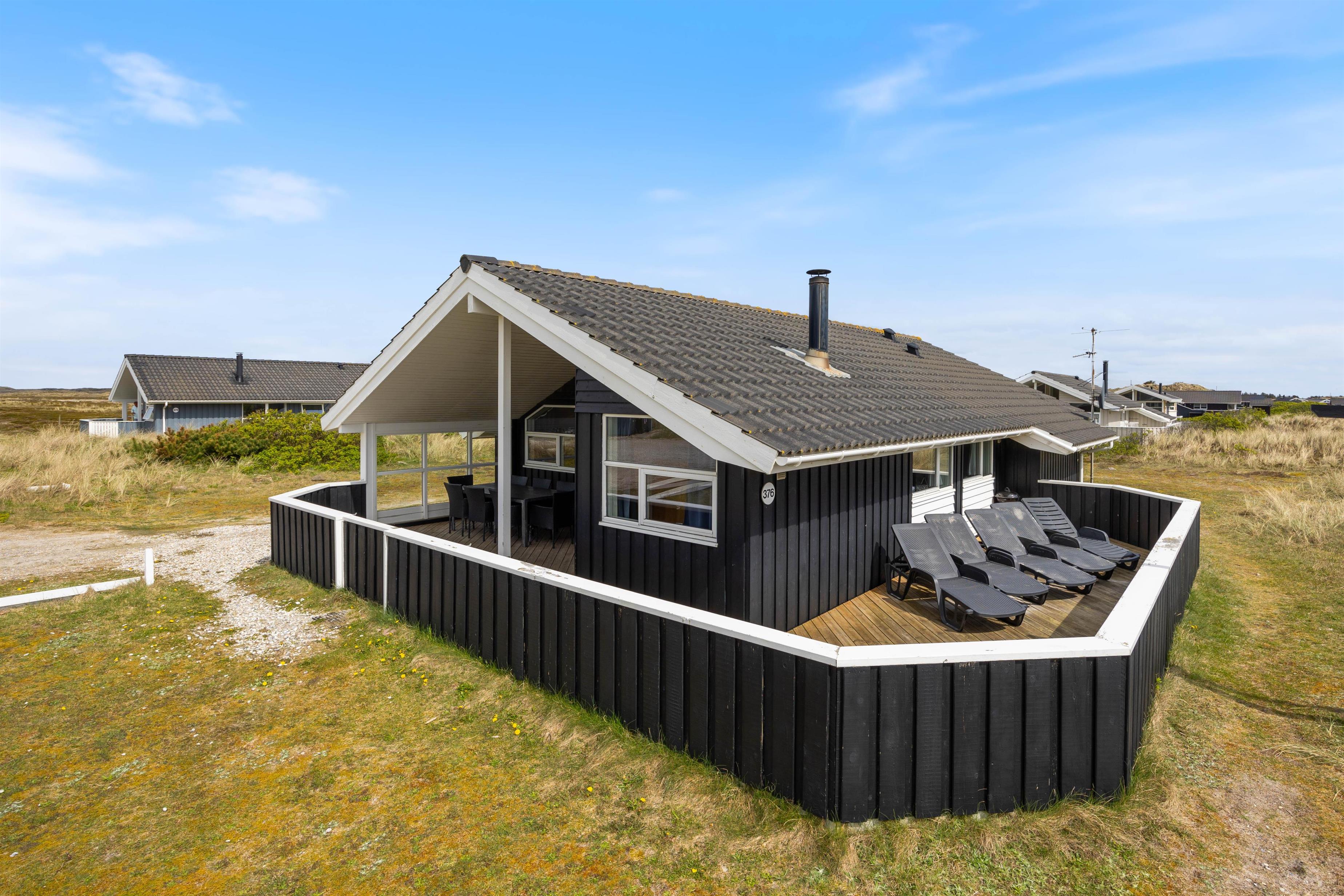 Sommerhuset har bl.a. en stor lukket og delvist overdækket terrasse, som giver optimale muligheder for at finde en lille hyggelig krog, hvor I kan nyde et glas vin og den smukke udsigt til hedeområdet og klitterne.
