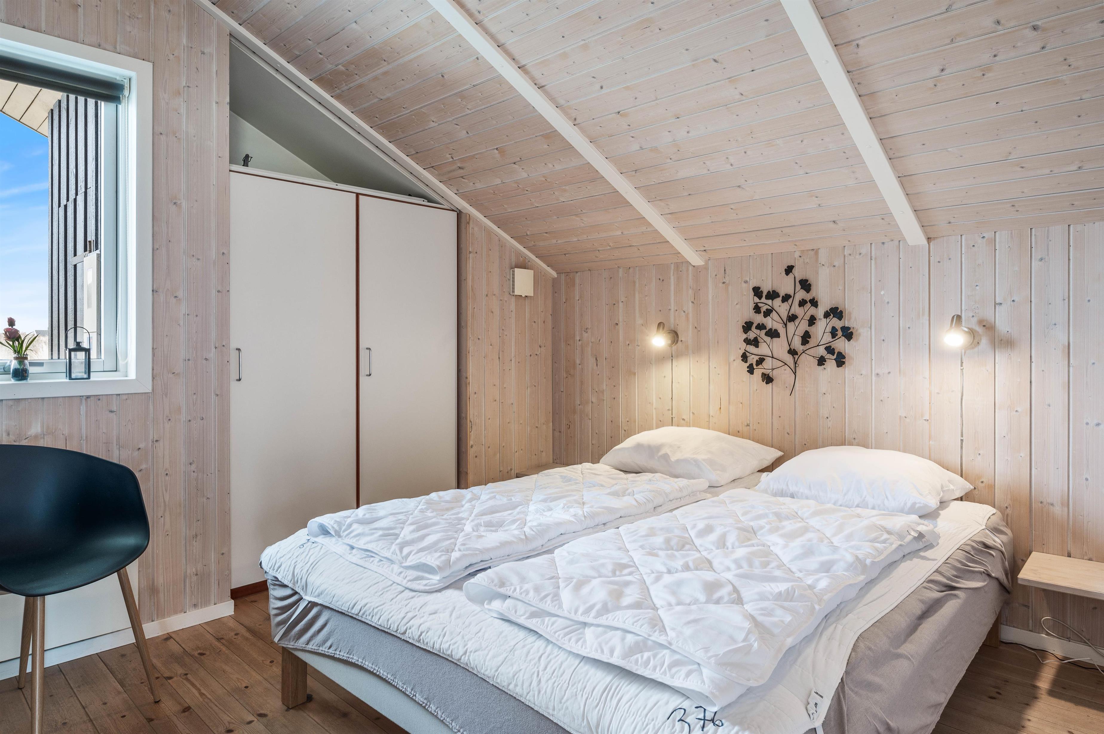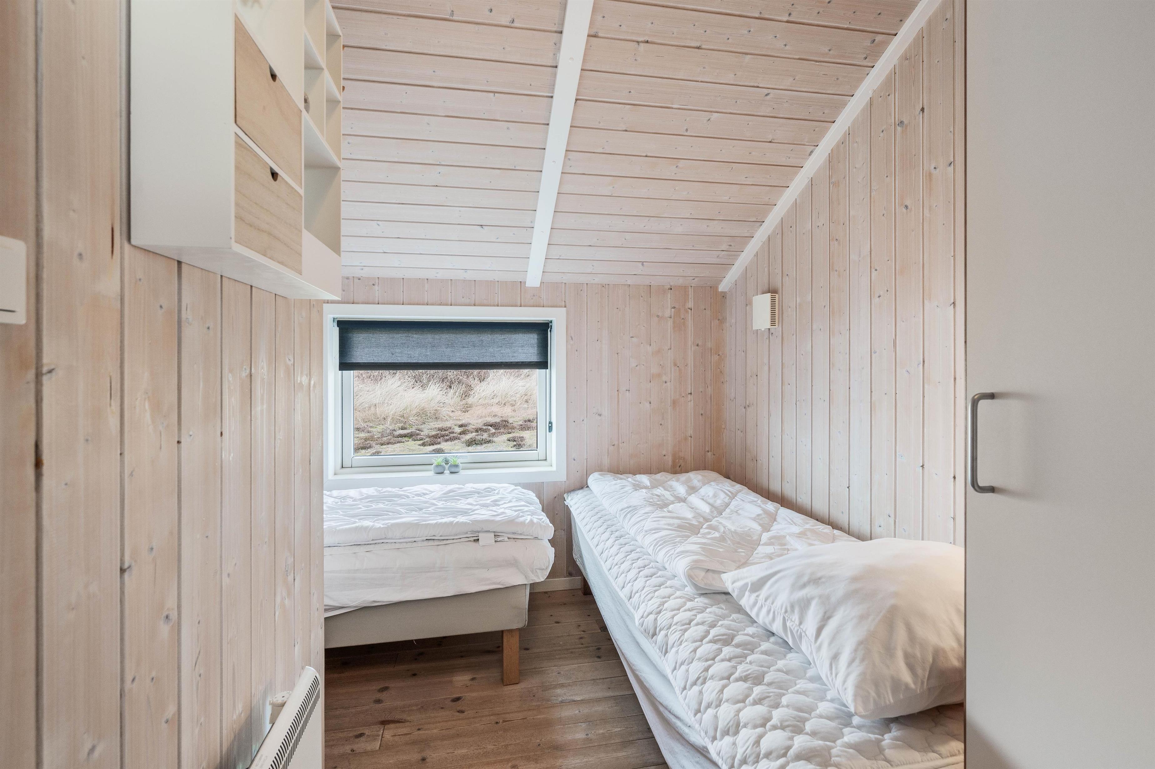 Indvendigt er sommerhuset pænt og har plads til 8 personer. Her er 2 soveværelser med dobbeltseng, 2 værelser med hver 2 senge. Her er et stort badeværelse med boblebad og indgang til sauna samt et lille gæstetoilet.