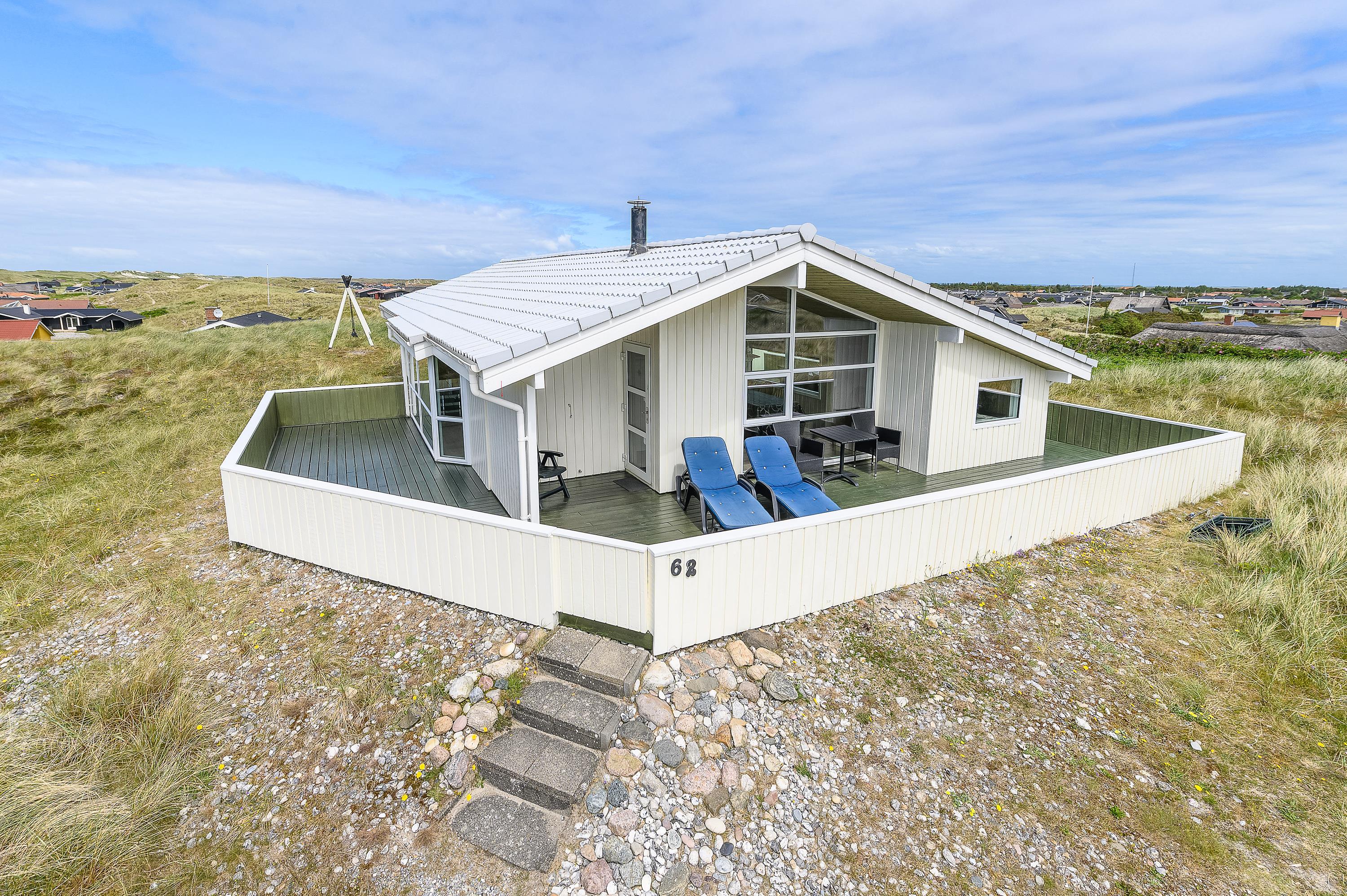 Et dejligt feriehus med unik beliggenhed på den højstliggende grund i området finder I her på Rauhesvej 62 i Bjerregård. Her er en fantastisk panoramaudsigt over den smukke natur med hede og klitter. Herfra kan I se Nymindegab og Lønborg kirke. Sommerhuset er omgivet af en stor velafskærmet og helt lukket terrasse, hvor du altid kan finde en herlig lækrog, hvor du kan nyde vestkystens friske luft. Jeres hund er også hjertelig velkommen i feriehuset.
