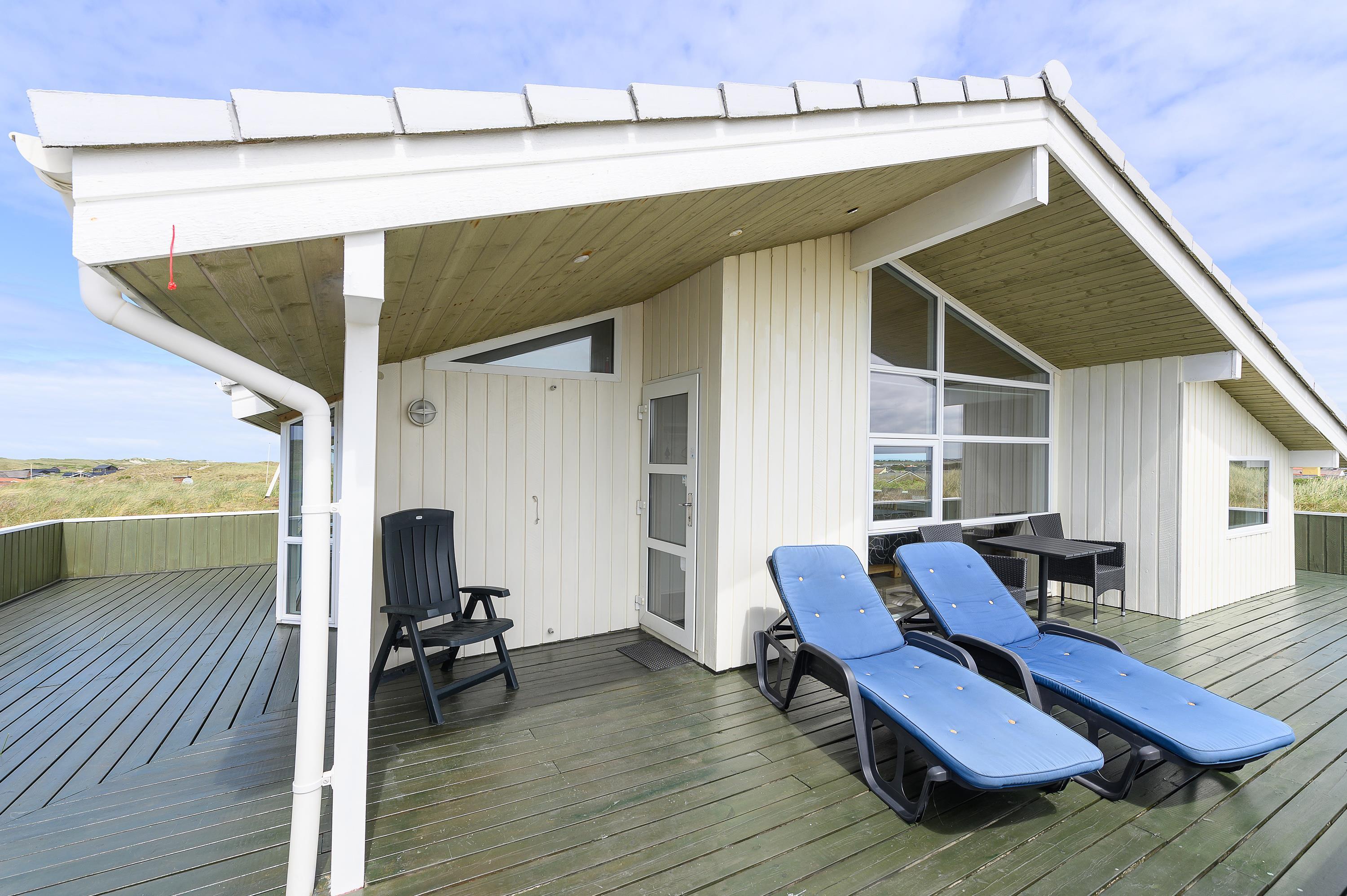 Fra den store afskærmede og velmøblerede terrasse er der en helt enestående udsigt over den storslåede natur med hedearealer og klitter. Her kan I altid finde en lækrog, hvor solen og den friske havluft kan nydes ganske ugeneret.