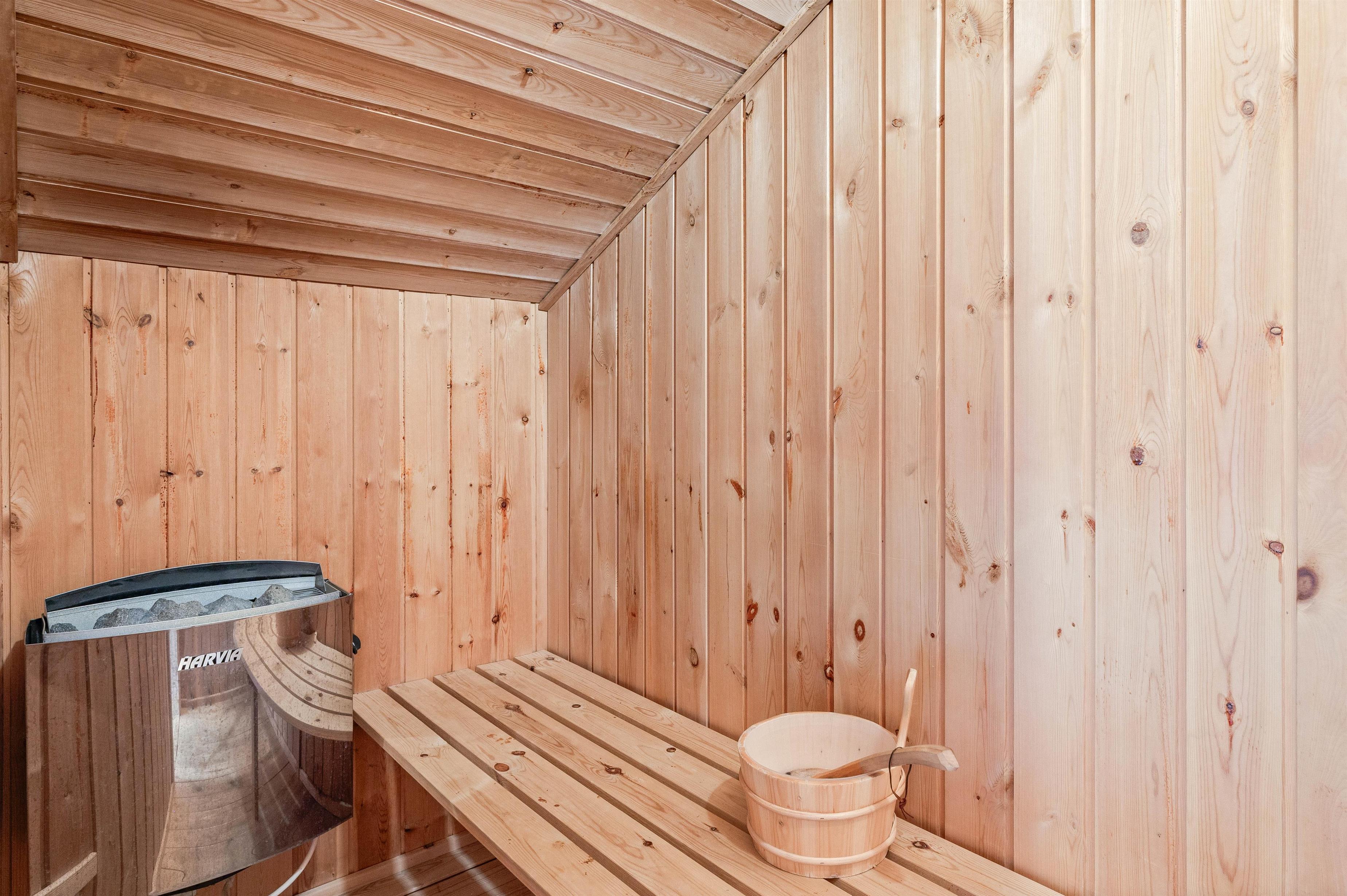 Sommerhusets badeværelse er udstyret med gulvvarme, spabad og sauna. Her kan I tilbringe mange timer til en afslappende wellnessaften.