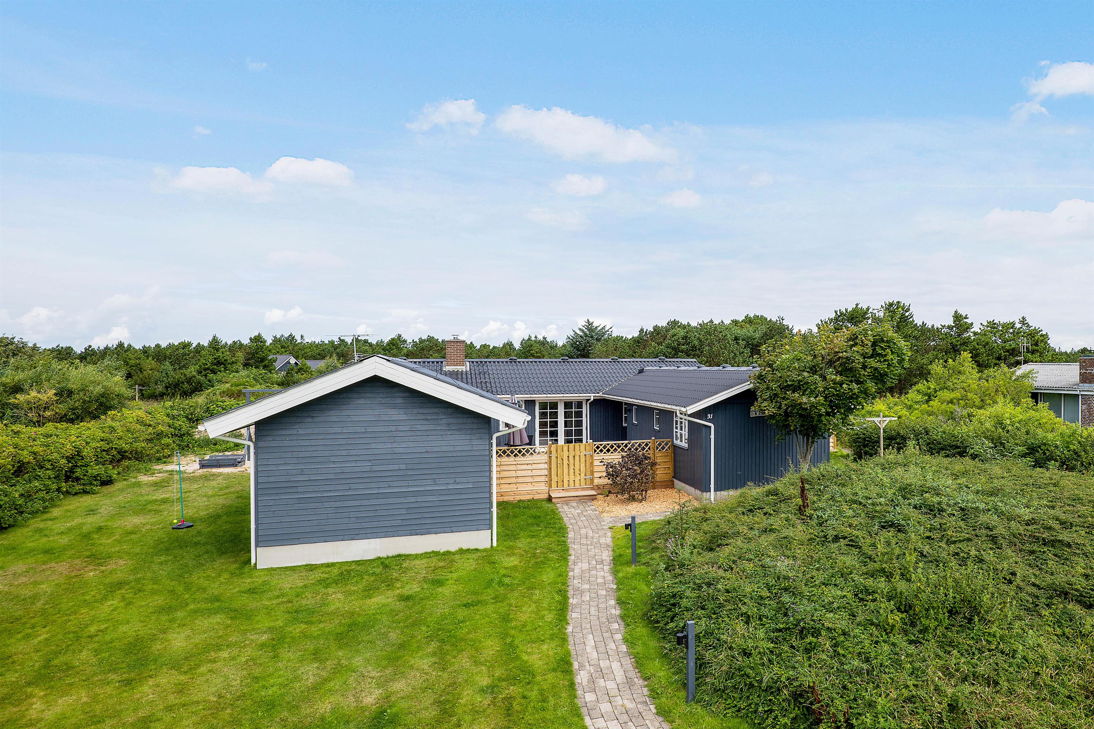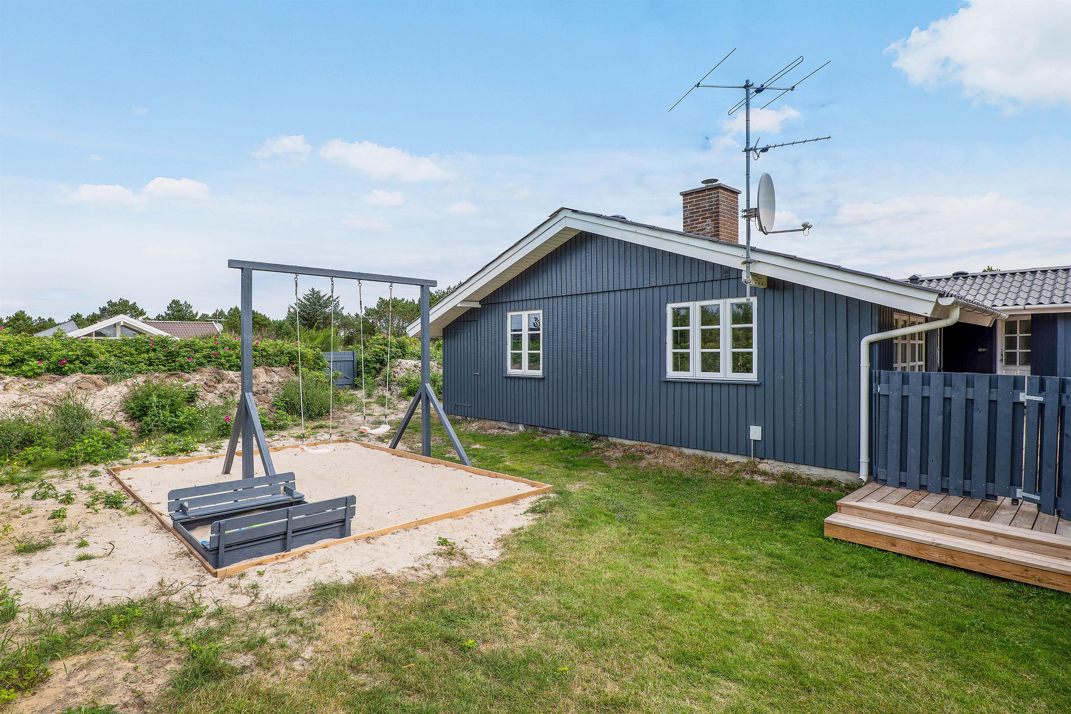 Feriehuset ligger på en 1.600 m² stor plænegrund, som både har sandkasse og gynge – favoritter blandt de yngste i familien. På grunden er der også en hyggelig shelter.