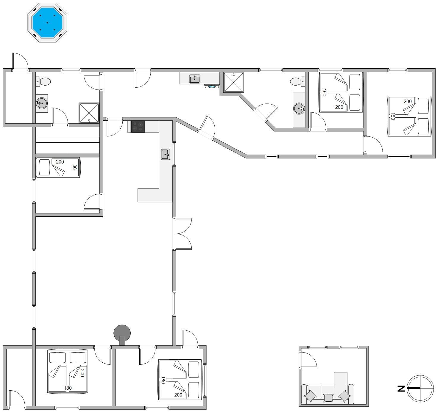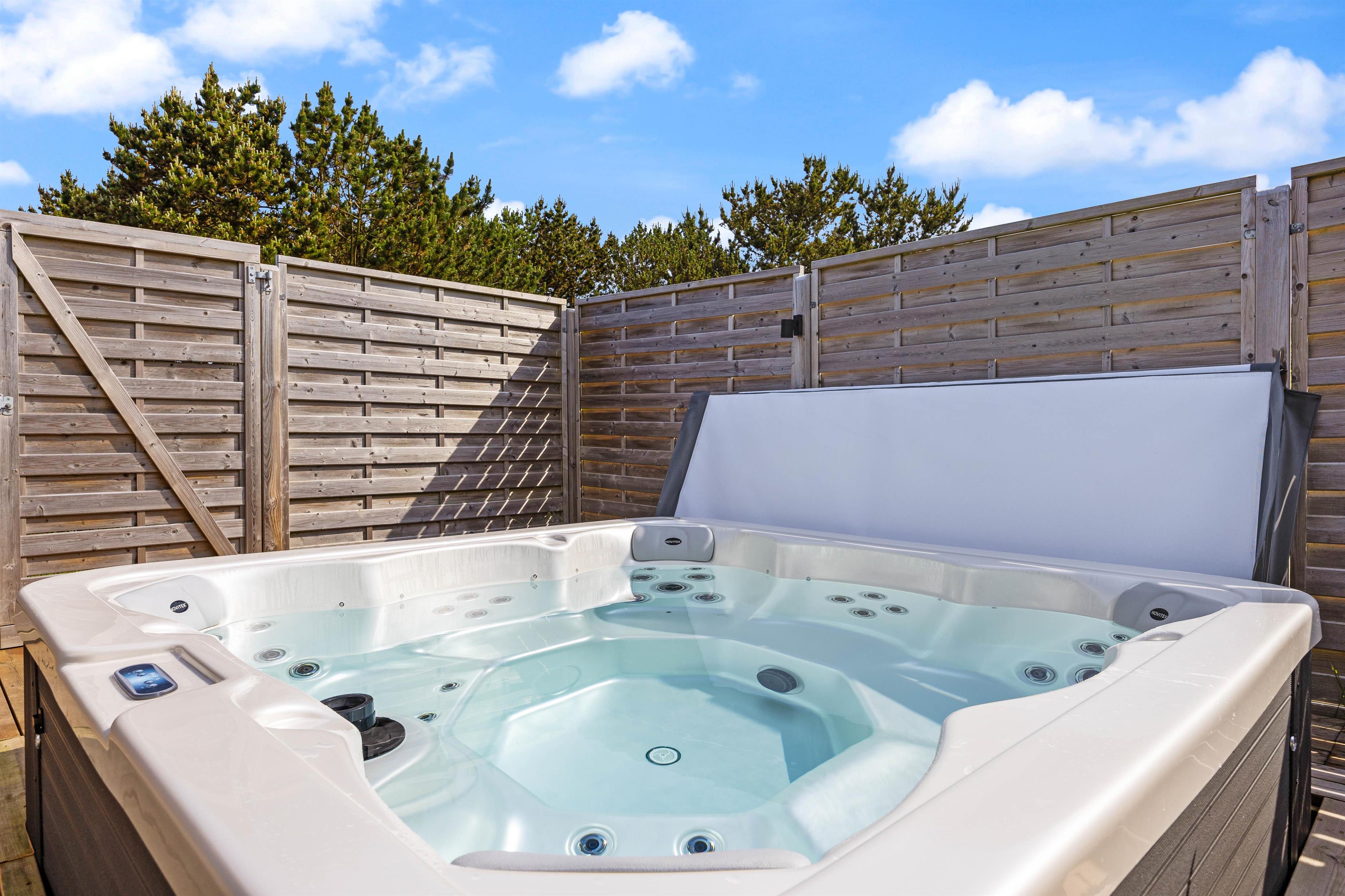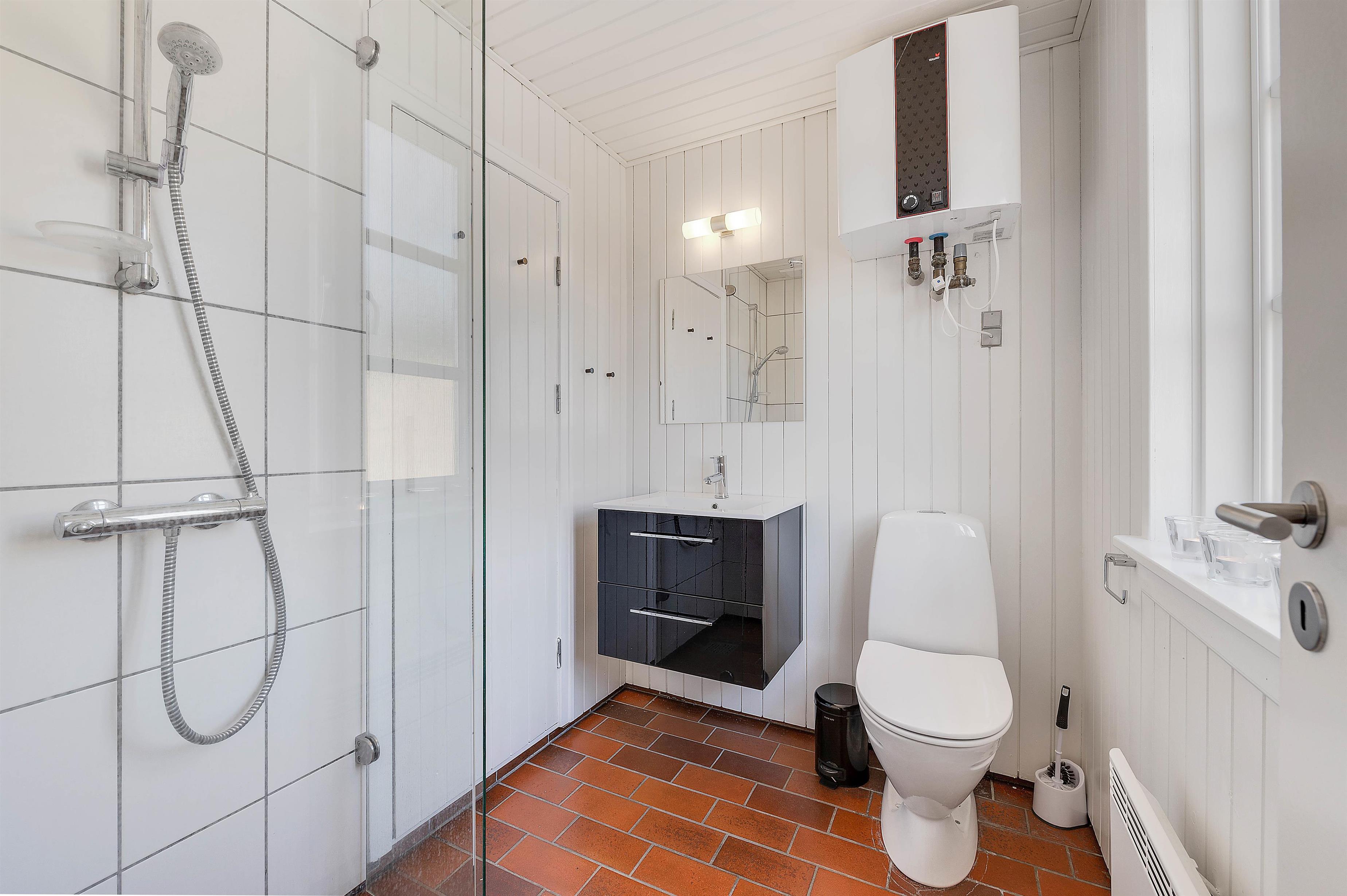 Der er 2 badeværelser i sommerhuset – begge med bruseniche og gulvvarme. Fra et af badeværelserne har I adgang til en fin sauna, hvor I rigtig kan slappe af efter en god feriedag i naturen. Udendørs finder I en udespa, hvorfra I kan nyde solnedgangen og den smukke stjernehimmel.