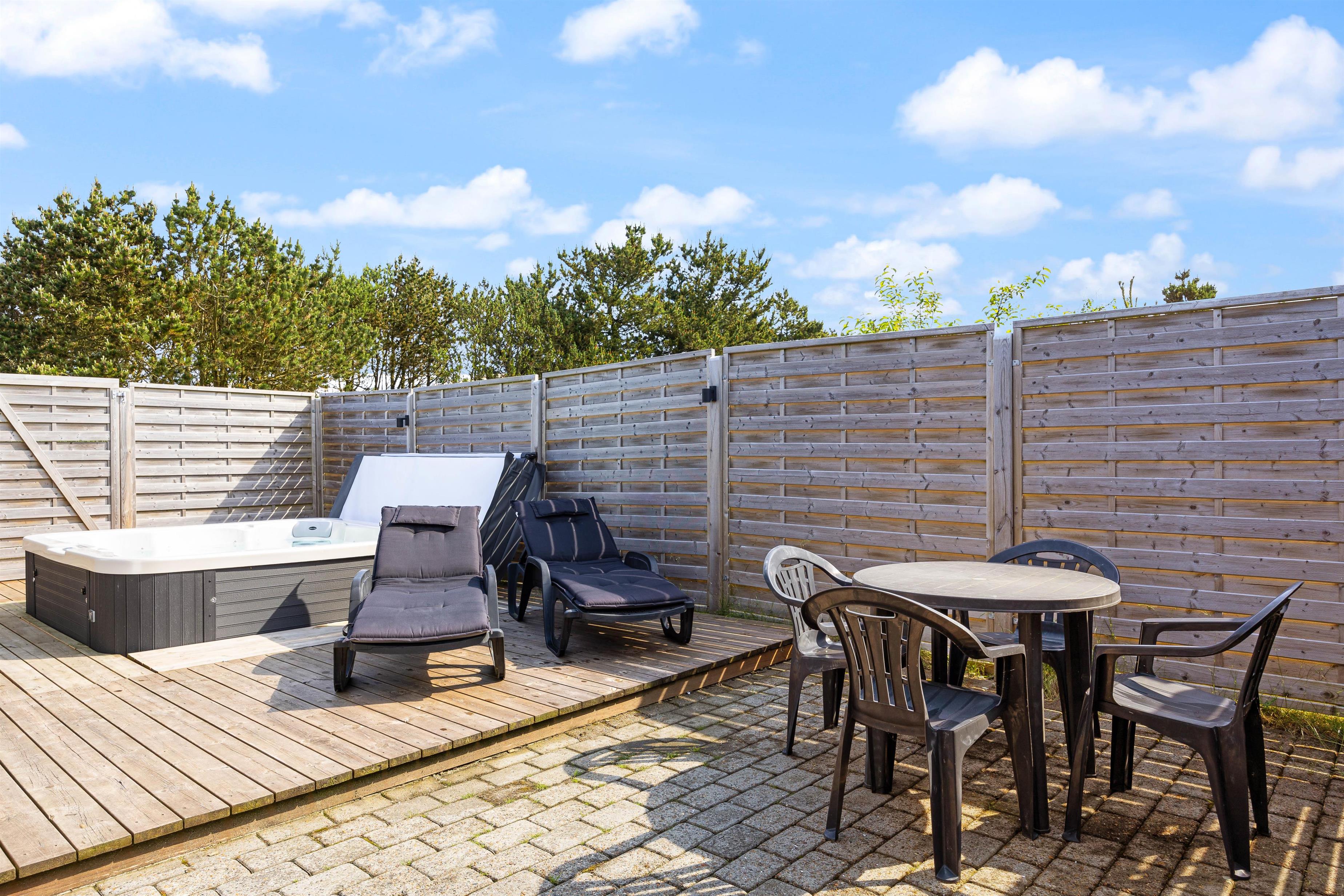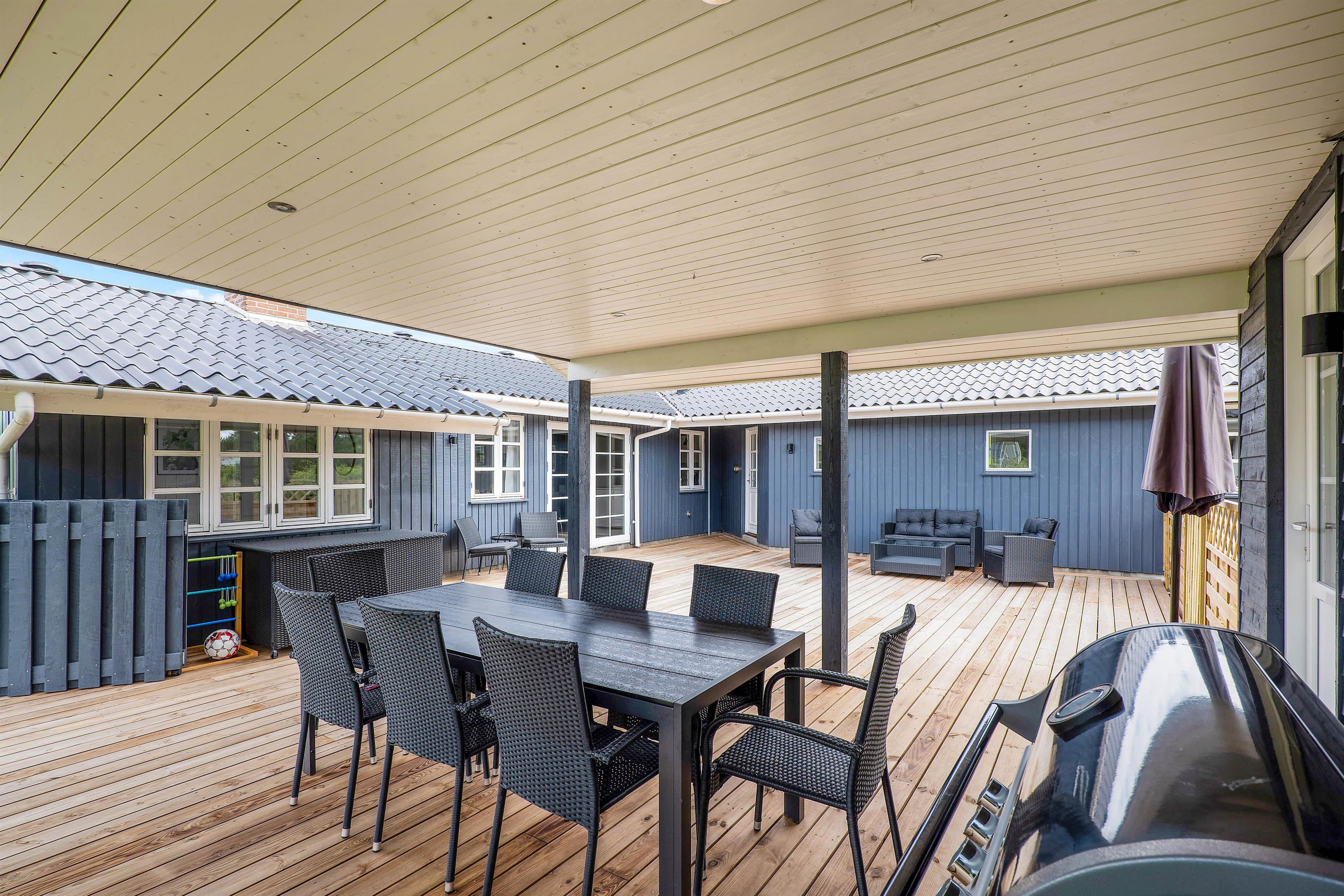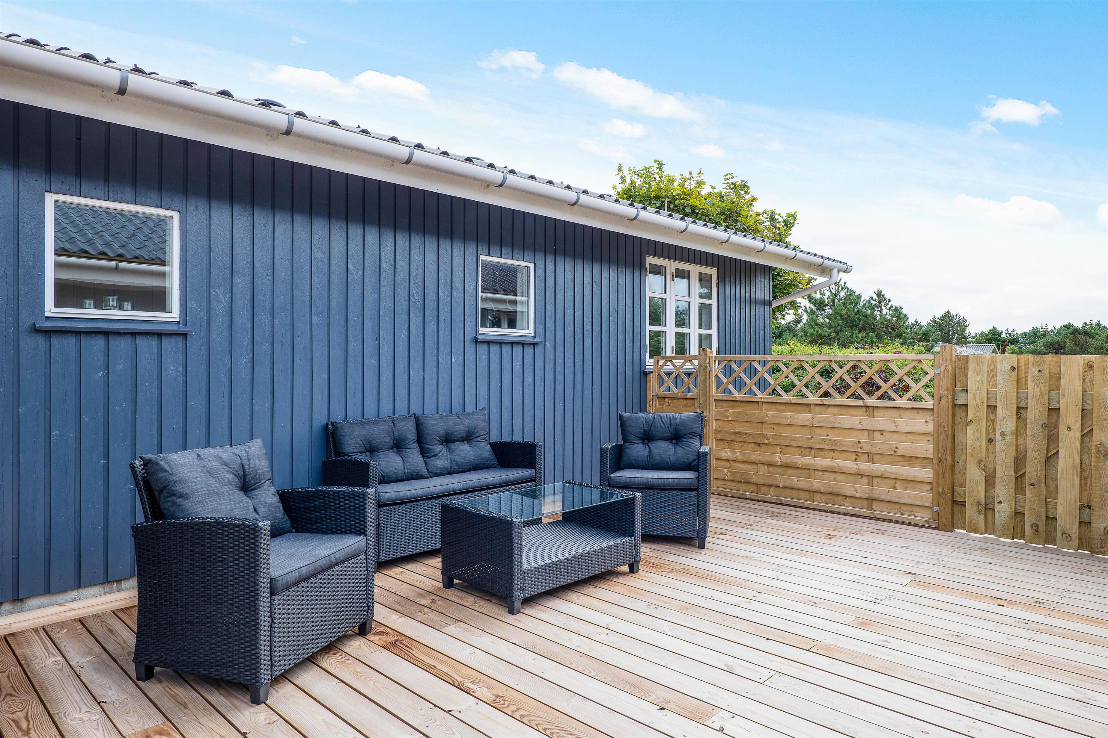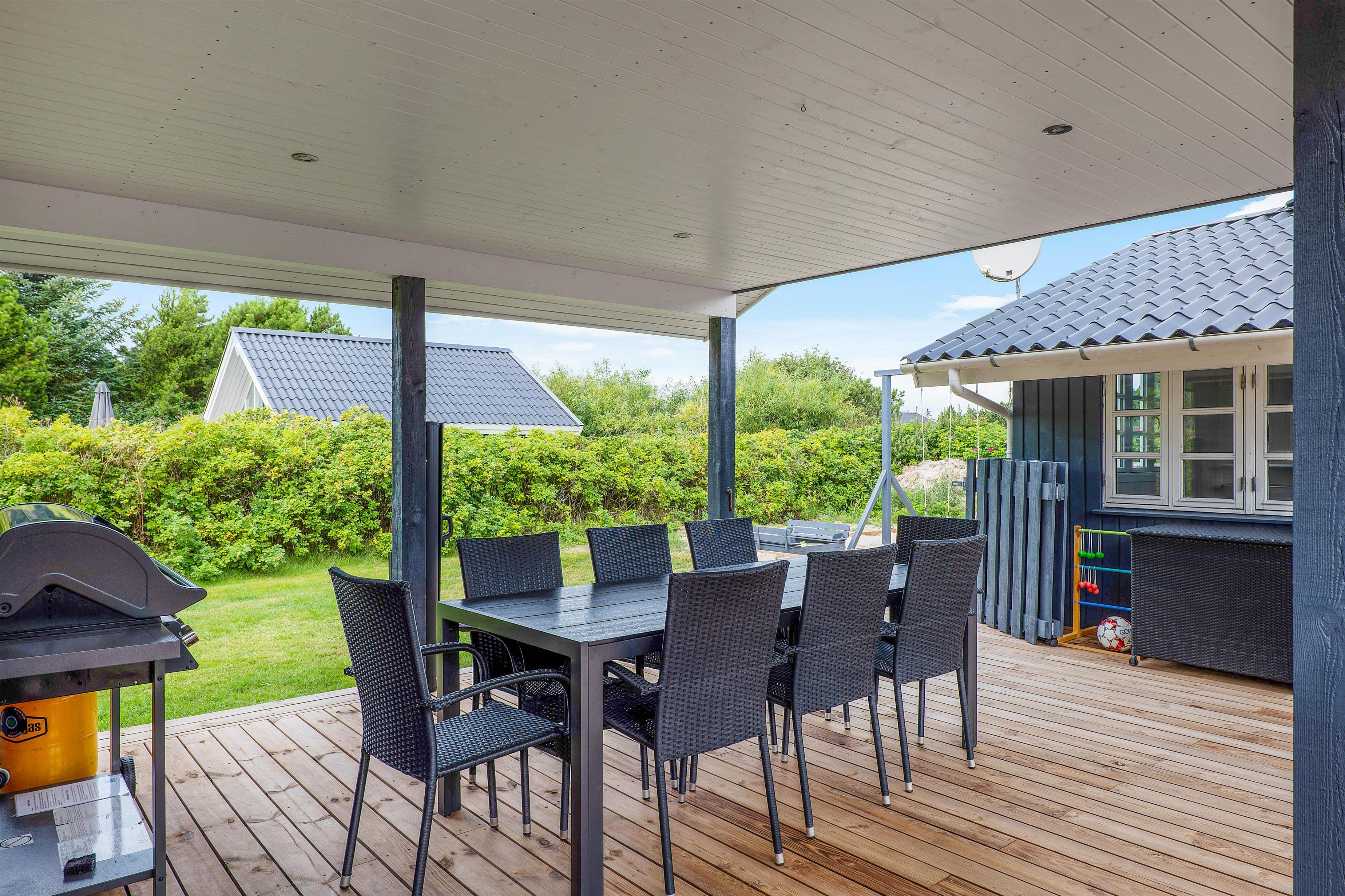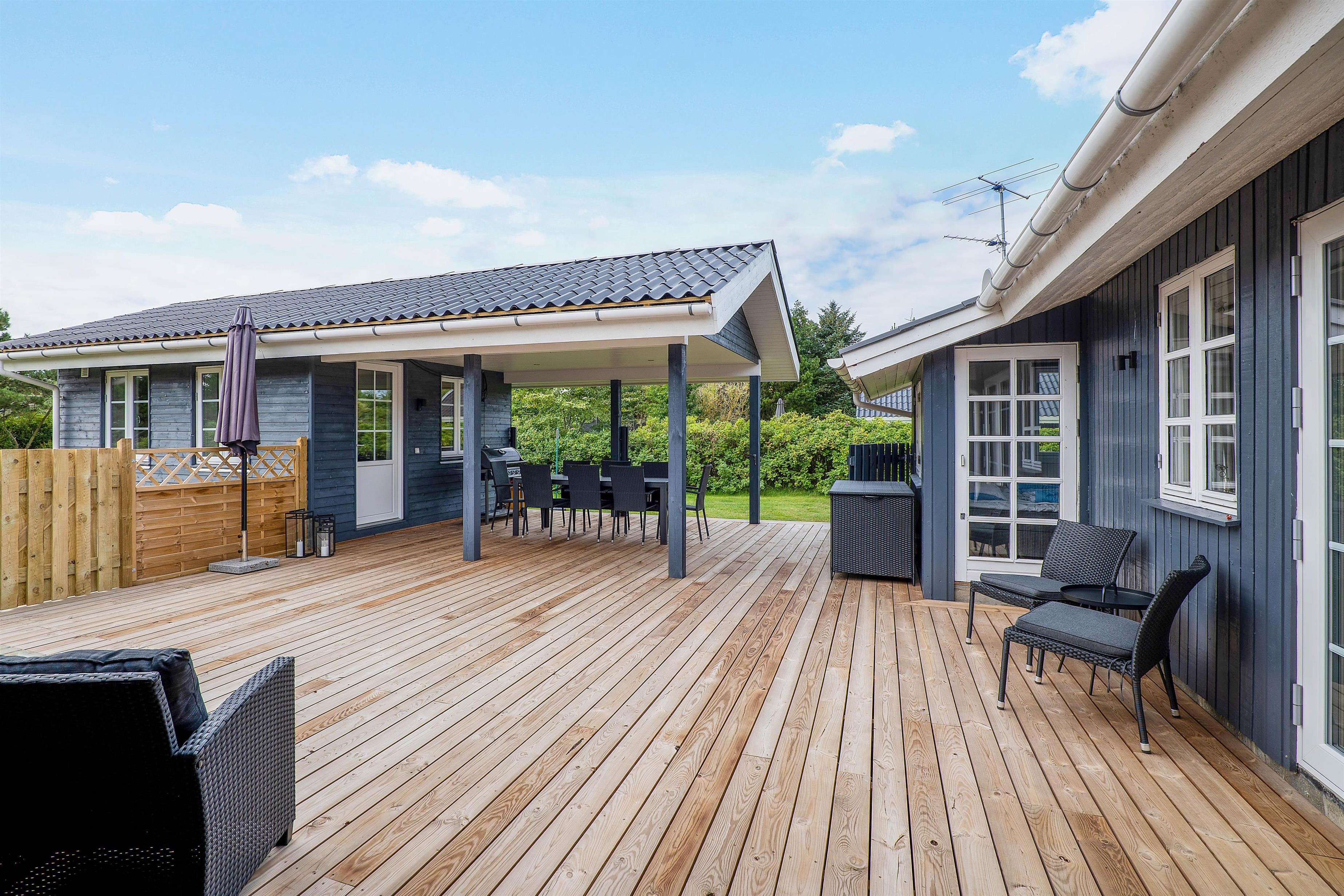 Sommerhuset har 2 store og lækre terrasser, hvor I kan nyde dagen og slutte af med et lækkert grillmåltid på en lun sommeraften. Skulle der komme lidt regn, kan I sidde i ly under den overdækkede del. Den ene terrasse er delvist afskærmet, mens den anden er helt lukket. Dermed kan I sidde I læ for vinden, og hunden kan få lov at gå frit rundt.