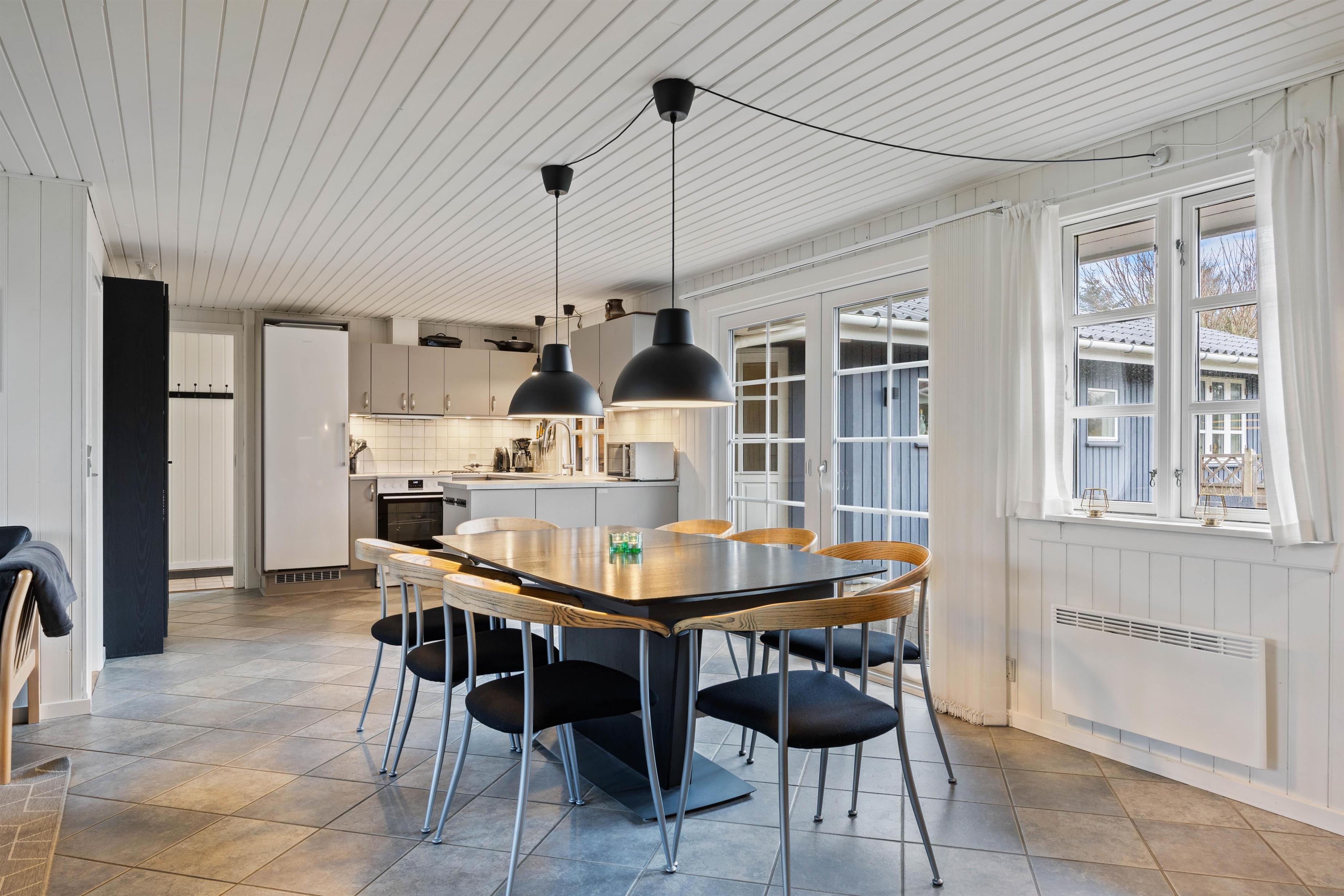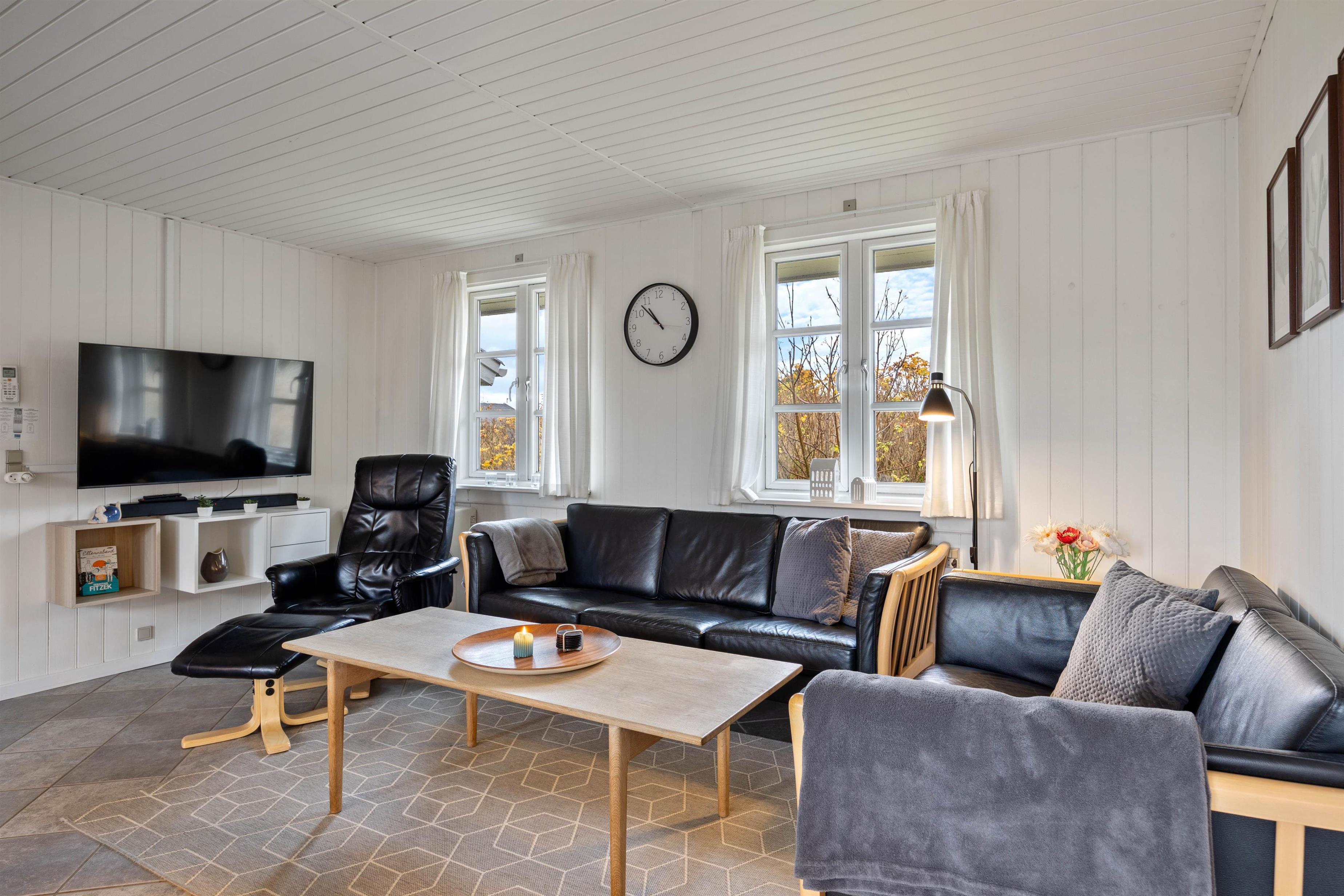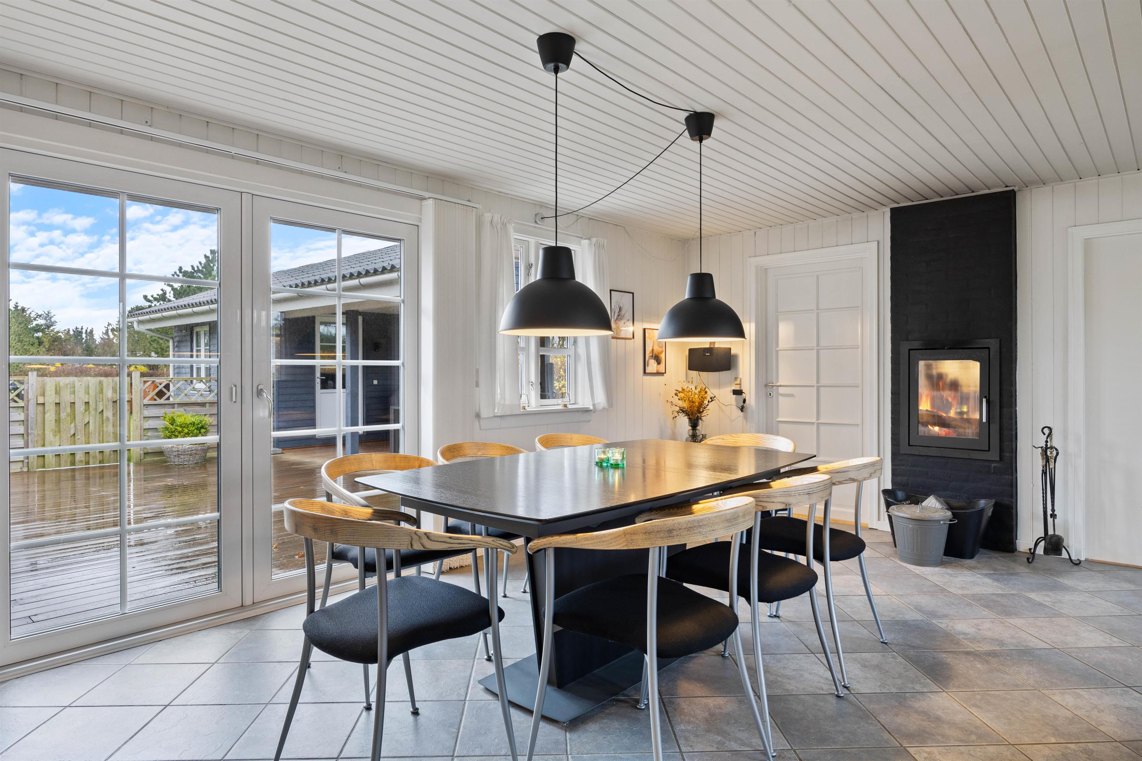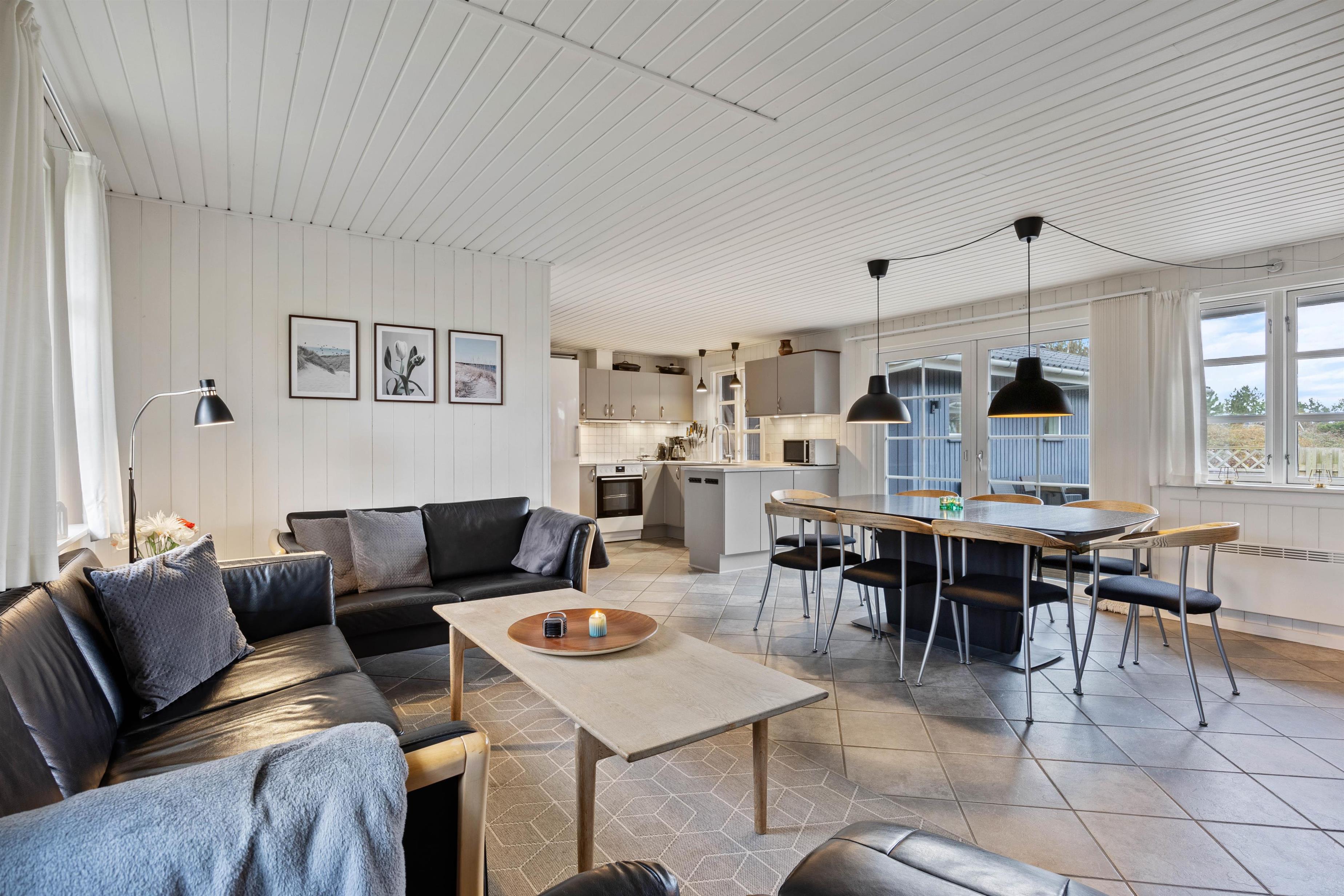 Den store stue ligger i åben forbindelse med køkkenet, så hele familien kan være samlet så meget som muligt under ferien. Den knitrende brændeovn og dens varme danner rammerne for en skøn aften i familiens selskab med afslapning og hygge.