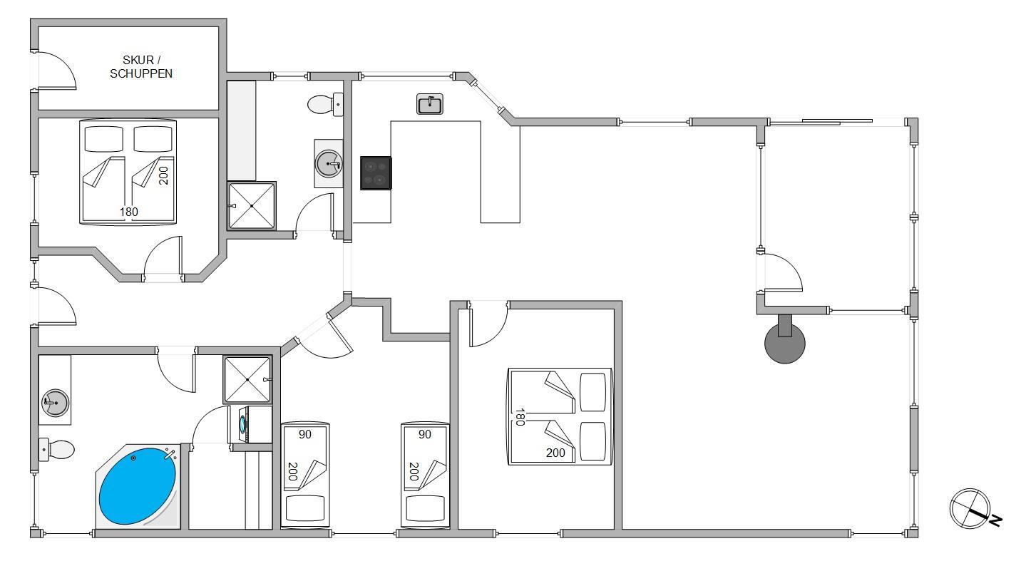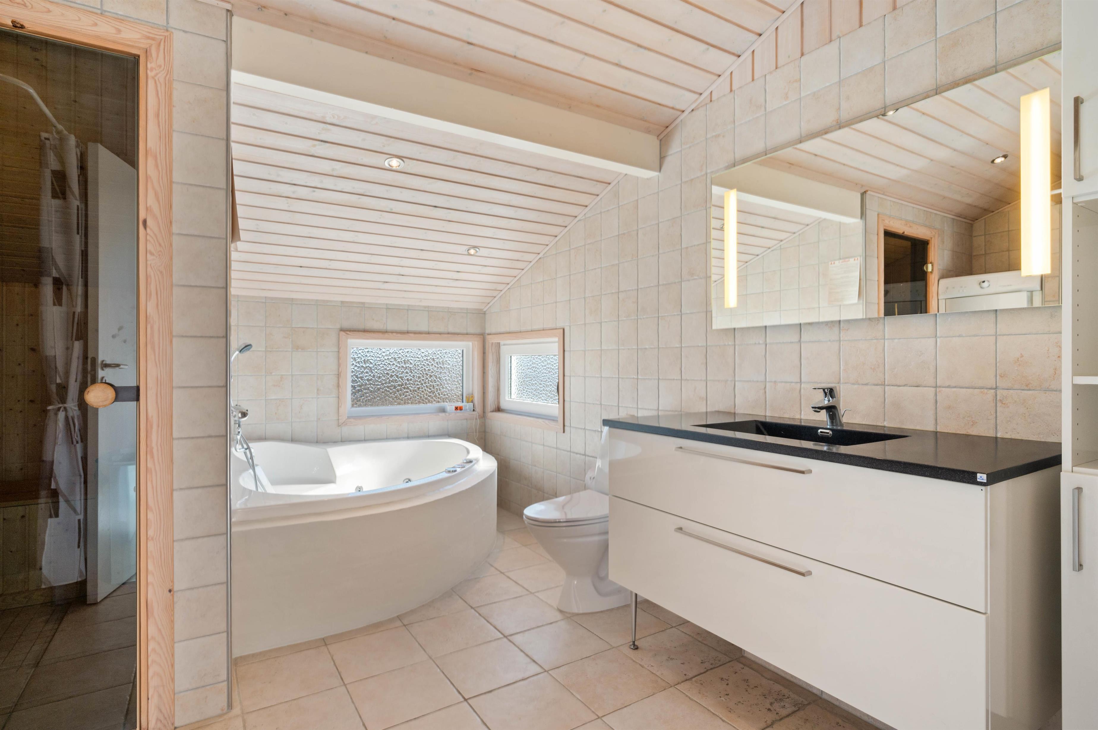 Det ene af de to dejlige badeværelser er med spabad og sauna, hvor du rigtig kan slappe af efter en tur ved stranden. Og i feriehuset er der både vaskemaskine og tørretumbler til rådighed, så du ikke behøver at medbringe den helt store tøjkuffert.