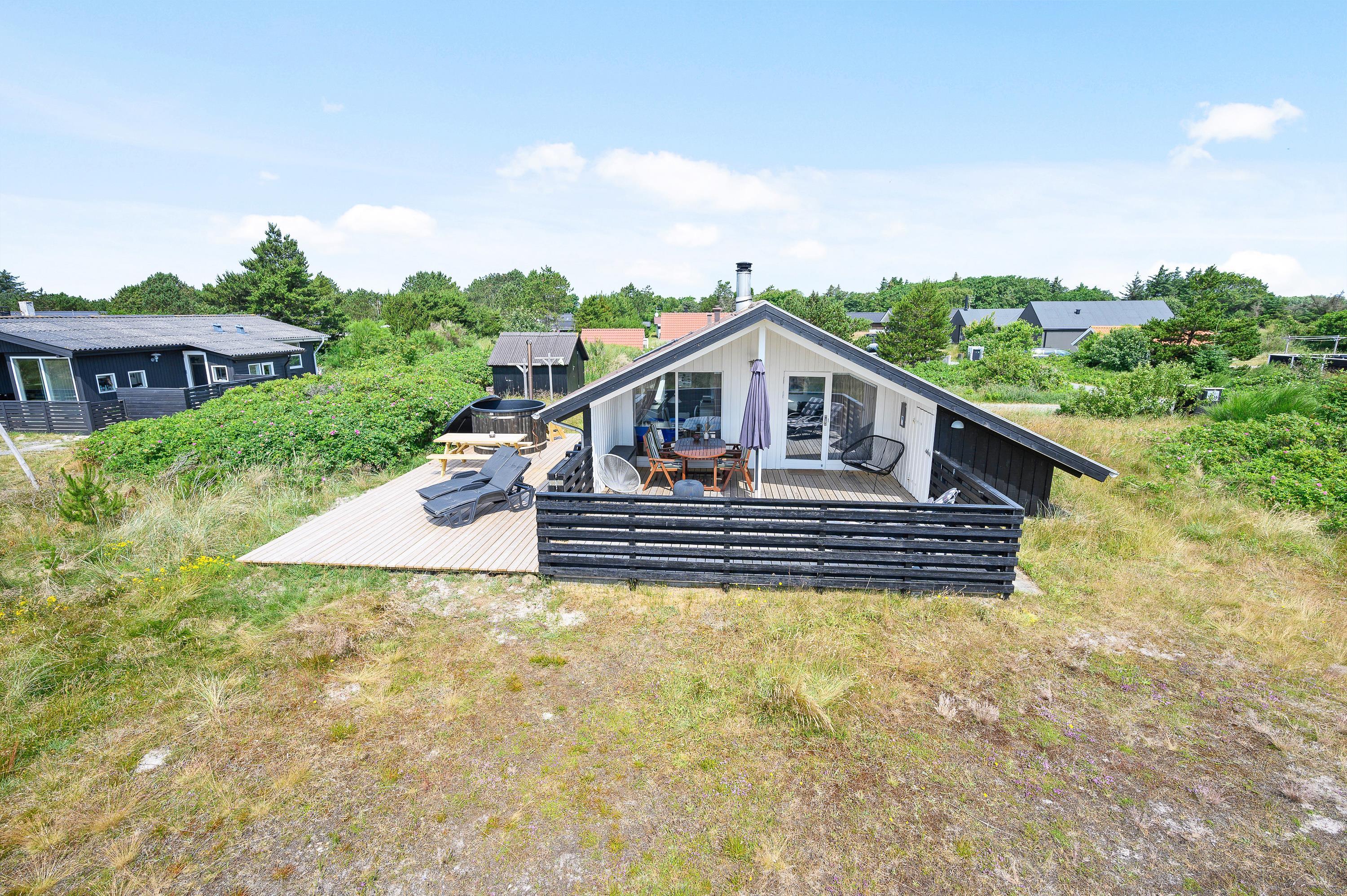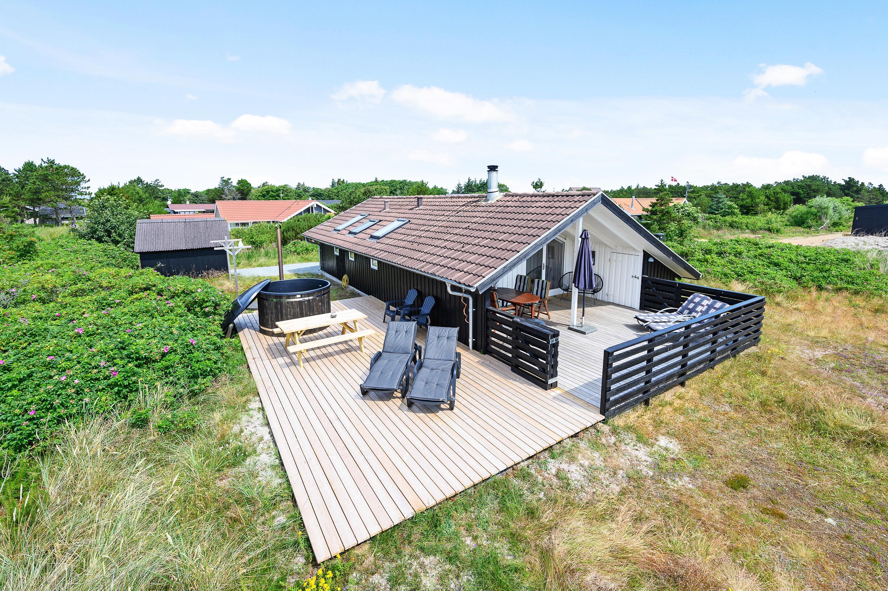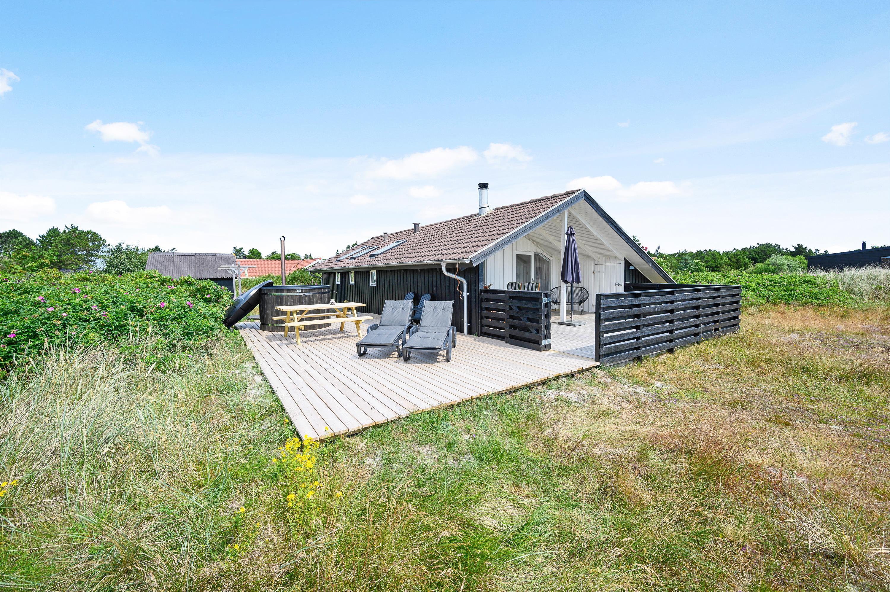 Ved sommerhuset har du også 2 dejlige terrasser, hvor du kan nyde ferien og den friske havluft. Når vejret er til det, kan du også tænde op i grillen og samle familien til et lækkert måltid i det fri. Den sydvendte terrasse er delvist overdækket og helt indhegnet, som gør den yderst anvendelig og helt perfekt, hvis du har hund med. Fra den vestvendte terrasse kan I nyde aftensolen og slutte dagen under stjernehimmel med en tur i vildmarksbadet, inden sengen kalder.