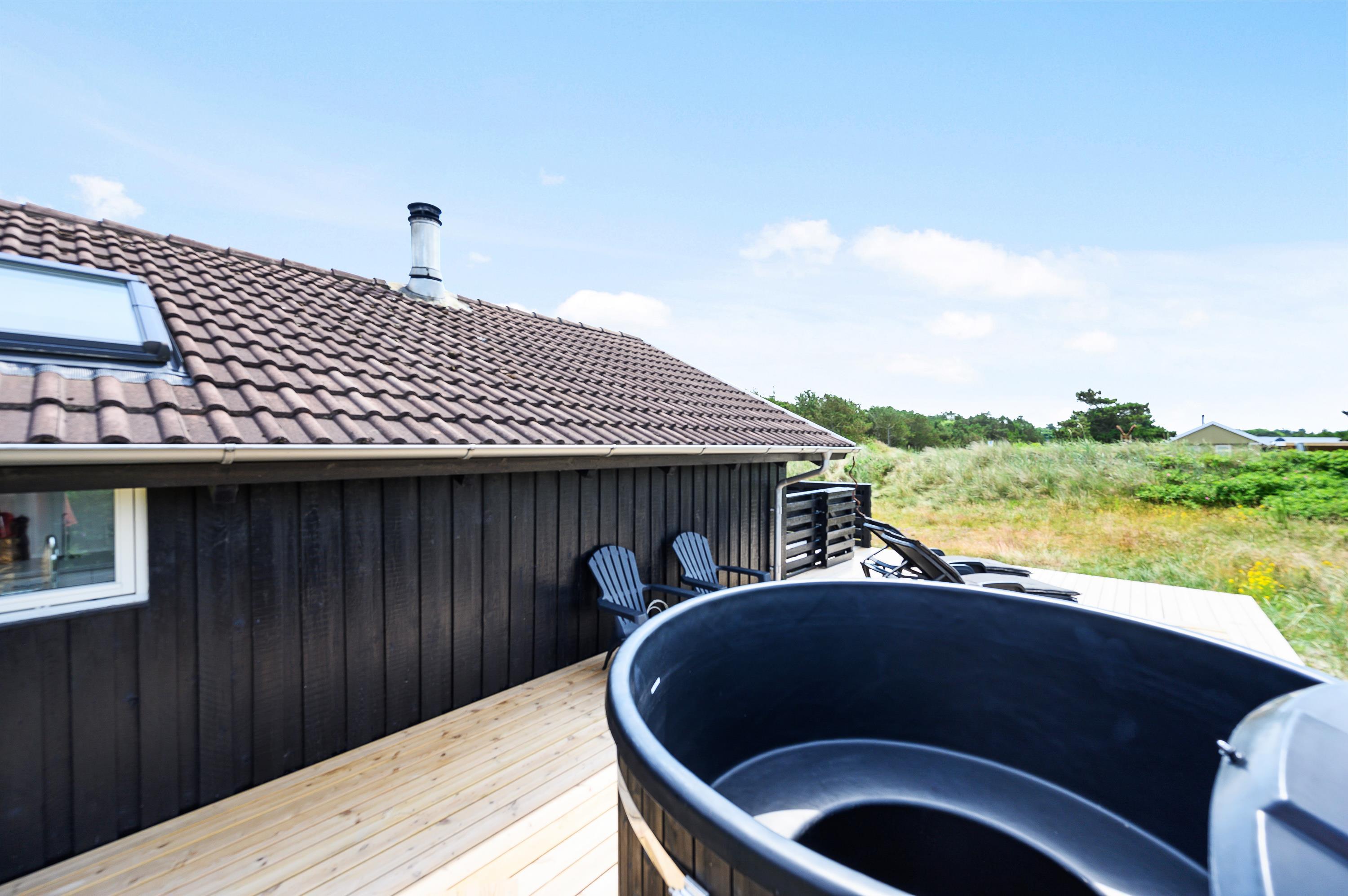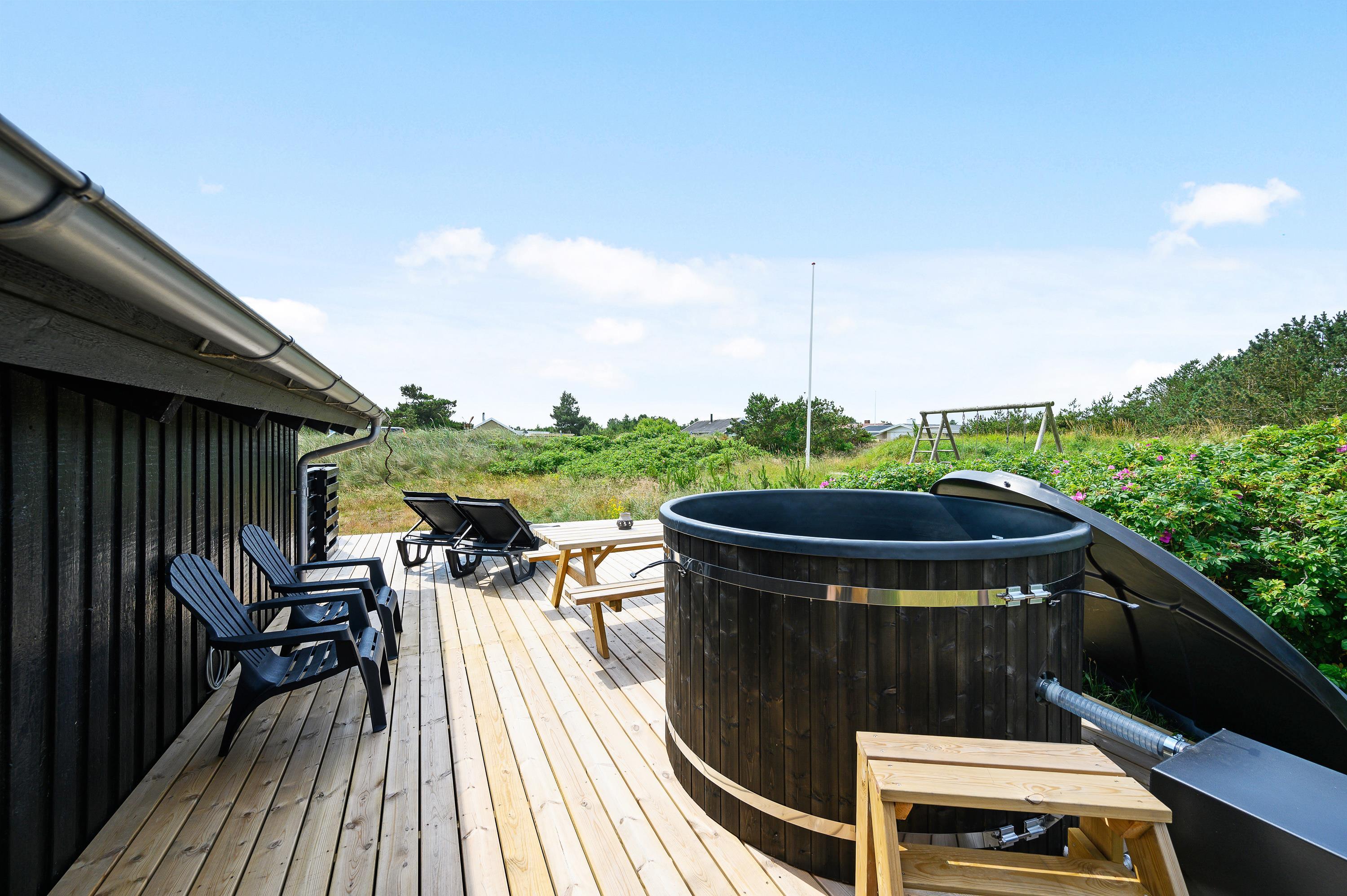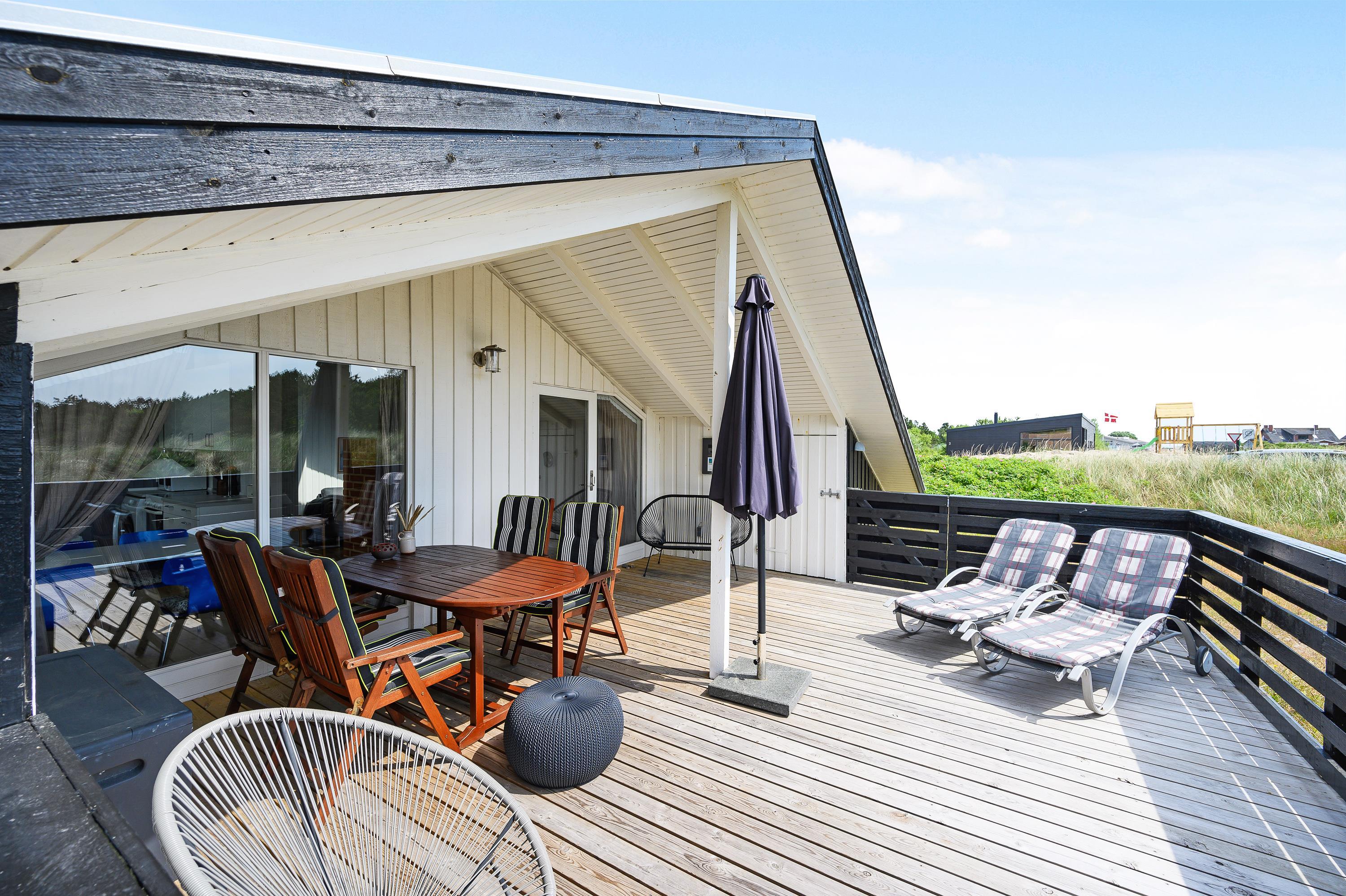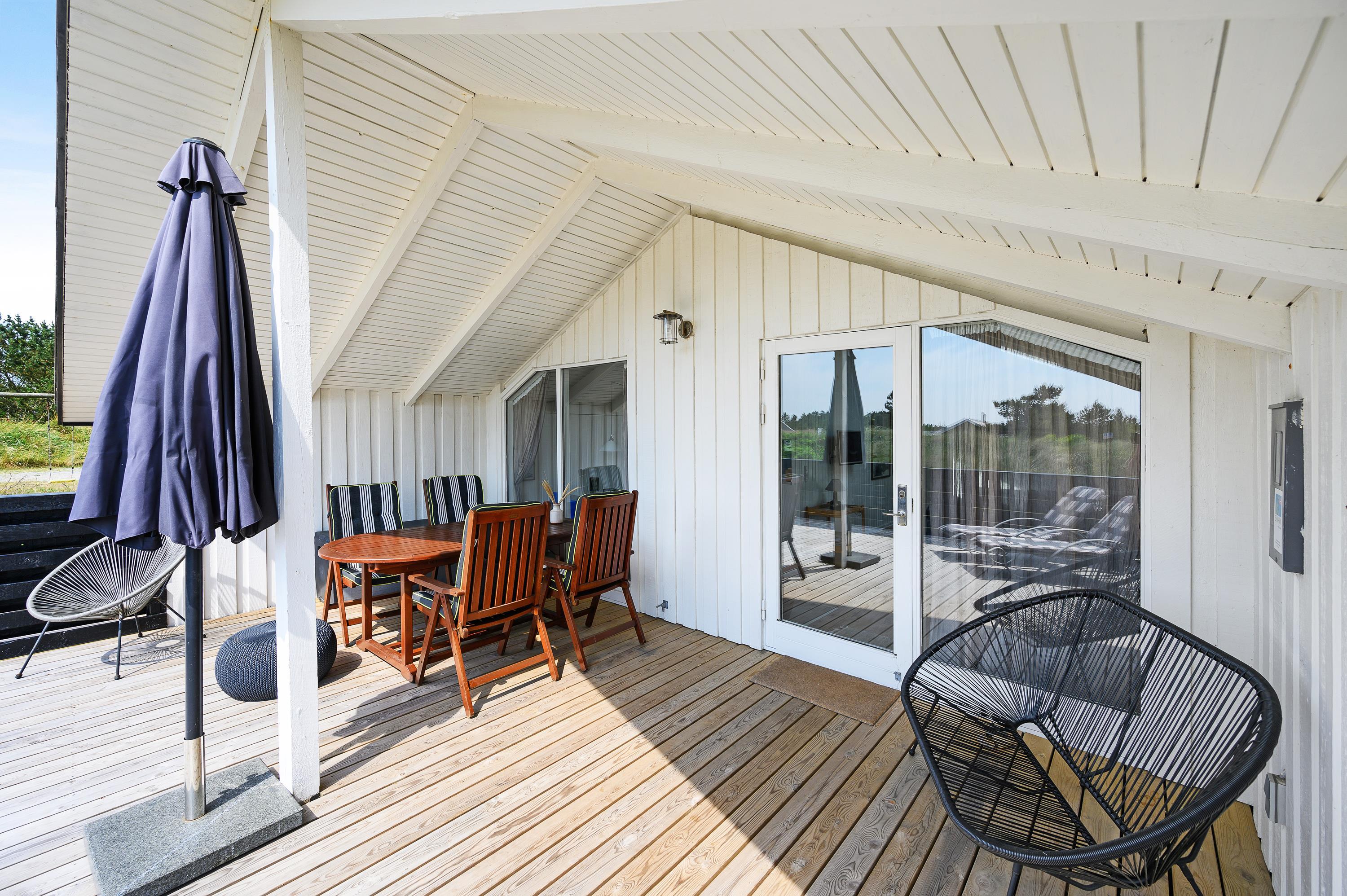Ved sommerhuset har du også 2 dejlige terrasser, hvor du kan nyde ferien og den friske havluft. Når vejret er til det, kan du også tænde op i grillen og samle familien til et lækkert måltid i det fri. Den sydvendte terrasse er delvist overdækket og helt indhegnet, som gør den yderst anvendelig og helt perfekt, hvis du har hund med. Fra den vestvendte terrasse kan I nyde aftensolen og slutte dagen under stjernehimmel med en tur i vildmarksbadet, inden sengen kalder.
