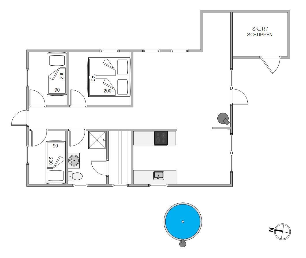 Der er også tre gode soverum med en dobbeltseng og to enkeltsenge. En rigtig god fordeling til f.eks. mor, far og to børn.