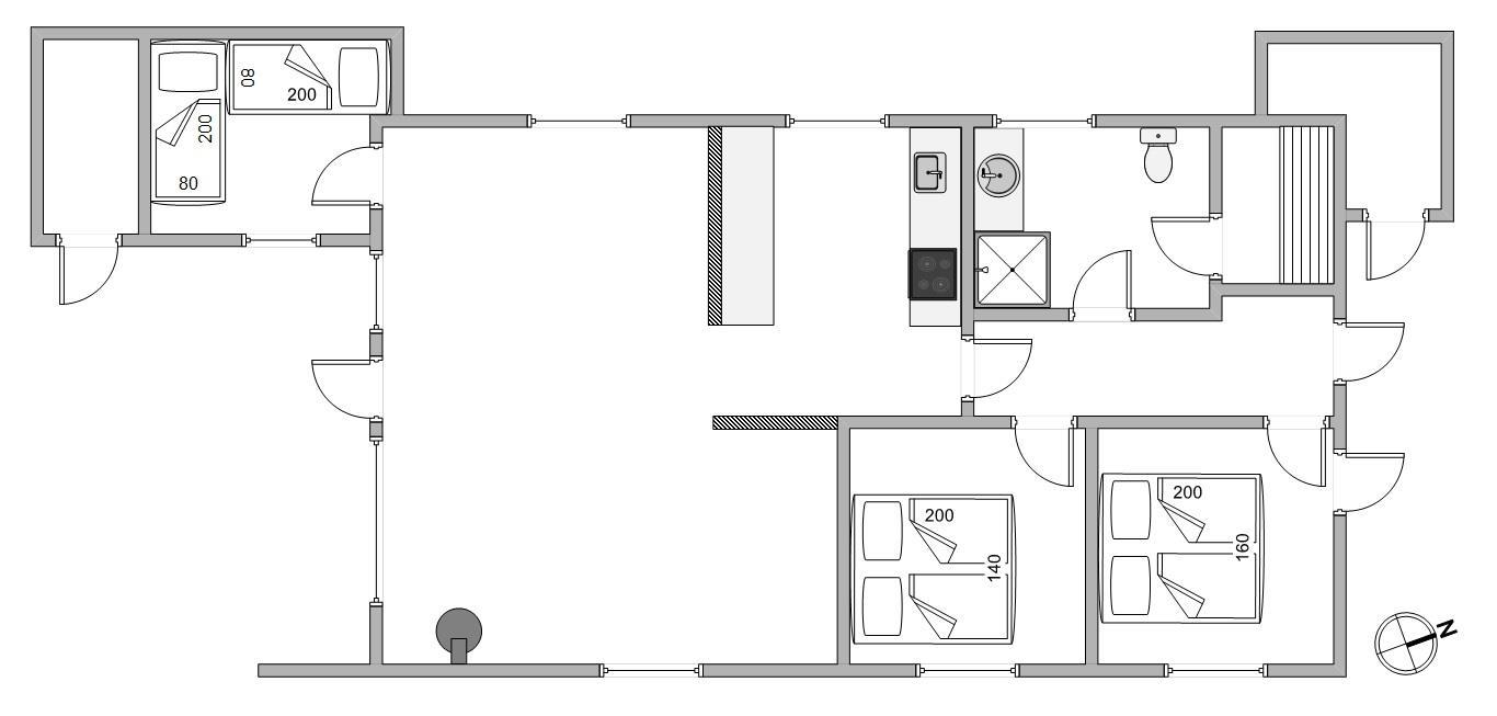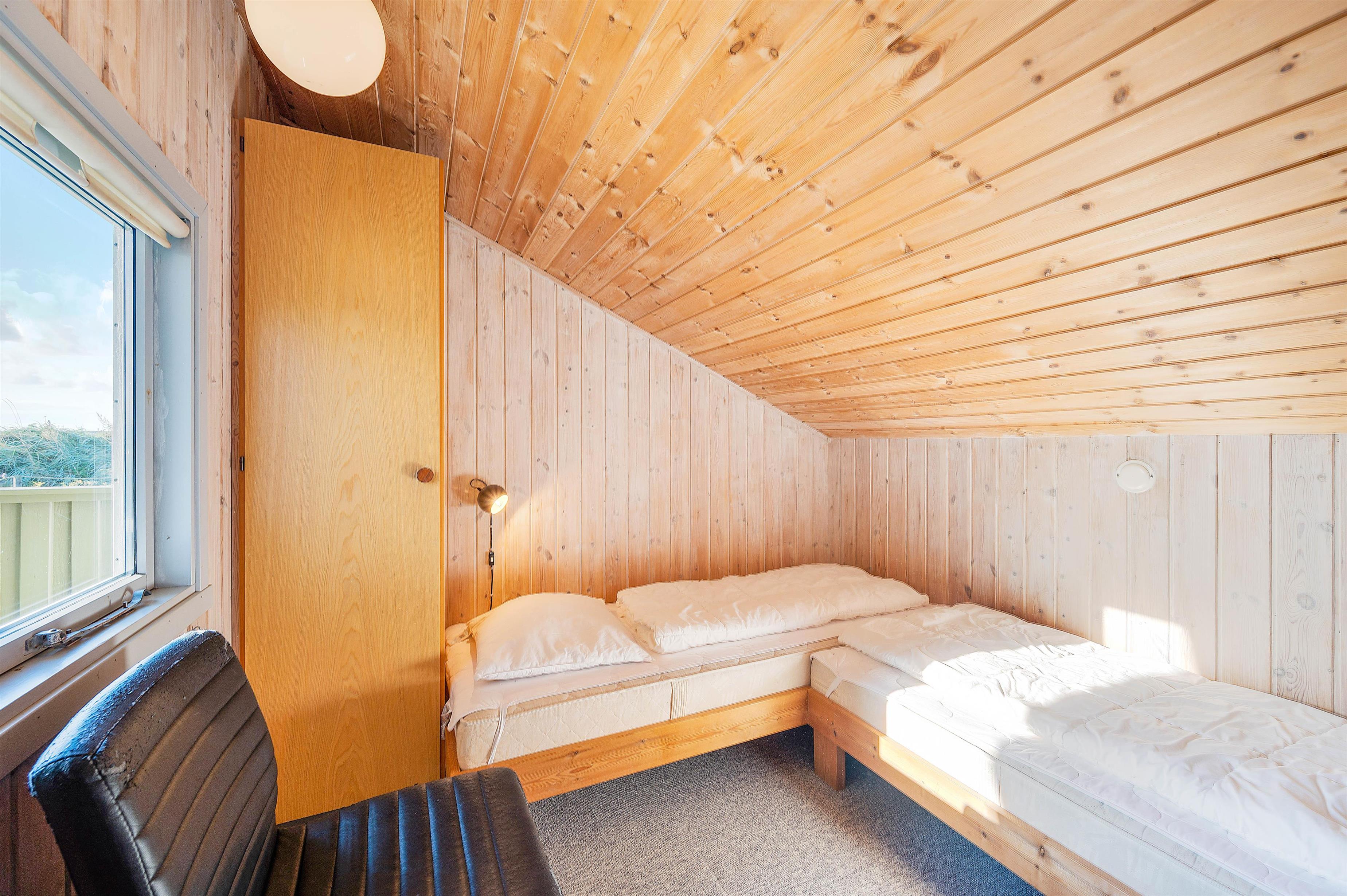 Alle 3 soveværelser i sommerhuset har gulvtæppe, og 2 af værelserne er indrettet med dobbeltsenge. På det sidste værelse finder I 2 enkeltsenge.